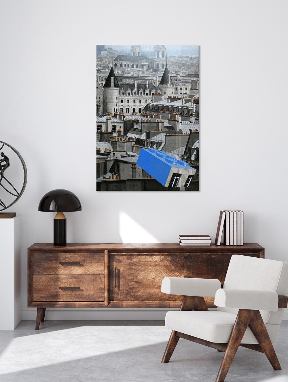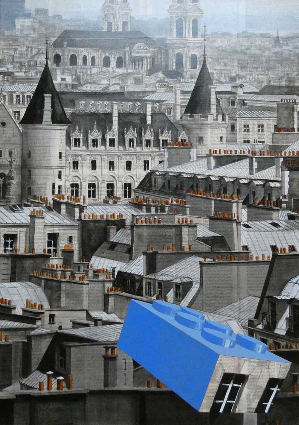 Dans ce paysage figuratif, un rectangle bleu avec la façade d’un immeuble Haussmannien flotte dans le ciel. Ce motif s’inscrit dans un travail de perspective et un jeu de lumière inhérents au style de Guillaume Chansarel, qui assurent un effet réaliste à ses tableaux figuratifs. Dans cette nouvelle série, ce réalisme est bouleversé par l’irruption de cubes colorés, comme suspendus dans le ciel.