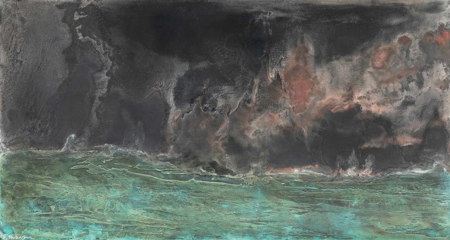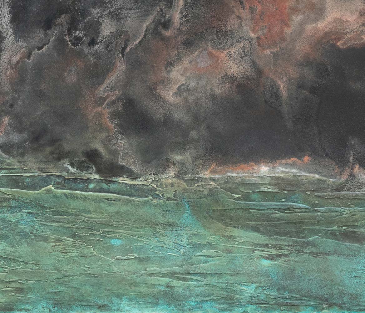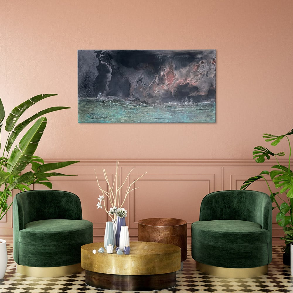 Bien qu’abstraits, les tableaux de Frédérique Domergue sont inspirés de paysages naturels et plus particulièrement de bords de mer. Ici, le bleu, rappelant la mer, vient côtoyer des couleurs sombres dans la partie supérieure du tableau. Dans cette œuvre dynamique, les éléments semblent se confondre dans un tumulte.