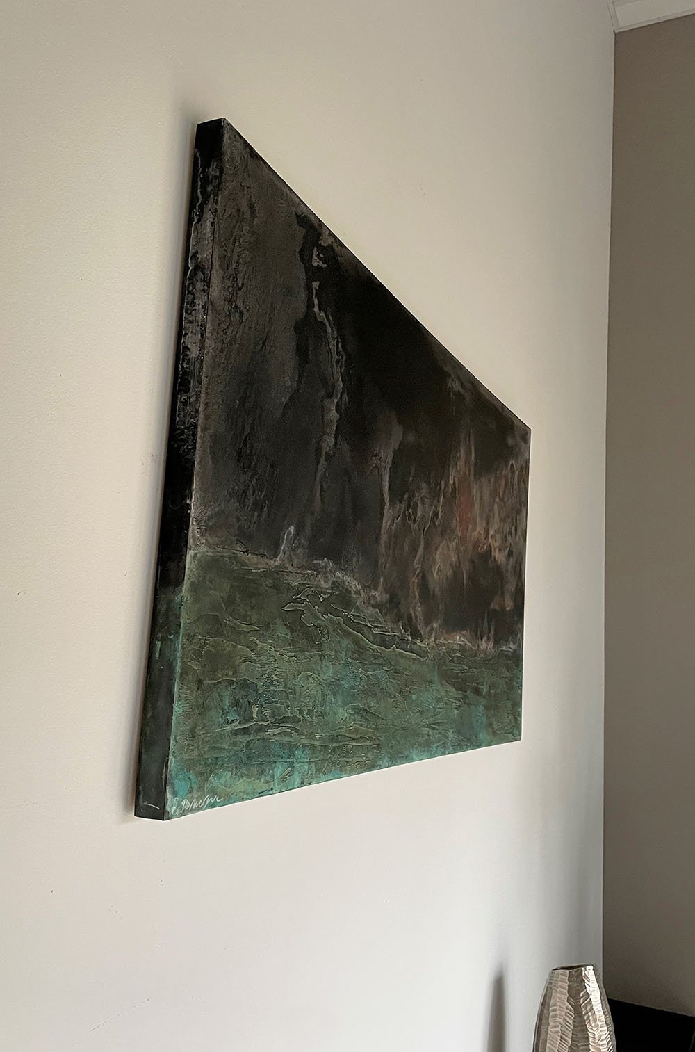 Description: Feuilles de zinc et de bronze oxydées sur aluminium, patine fixée à la cire d'abeille