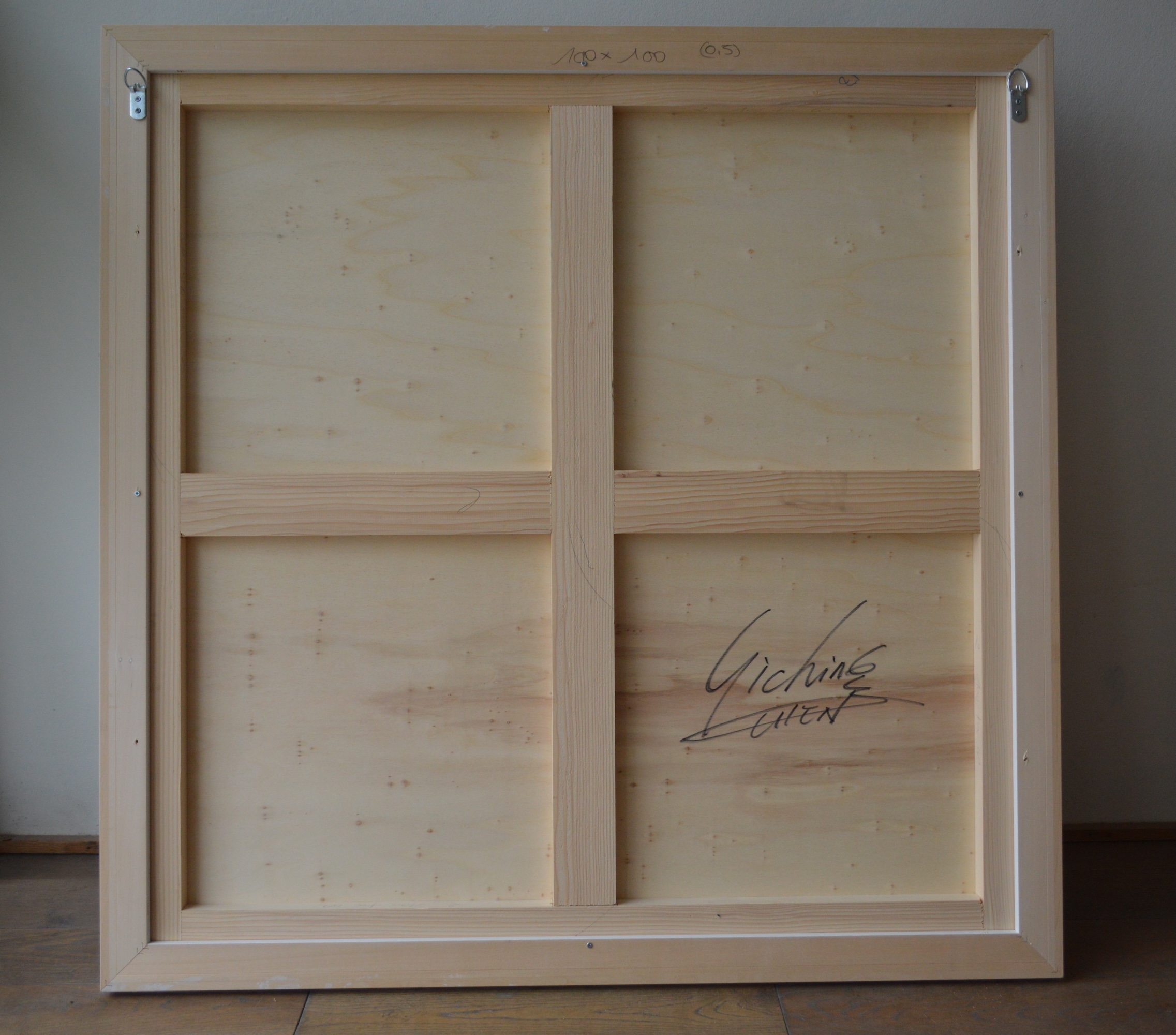 L’œuvre est vendue encadrée (caisse américaine blanche). Les dimensions de l’œuvre encadrée sont de 103 x 103 cm.