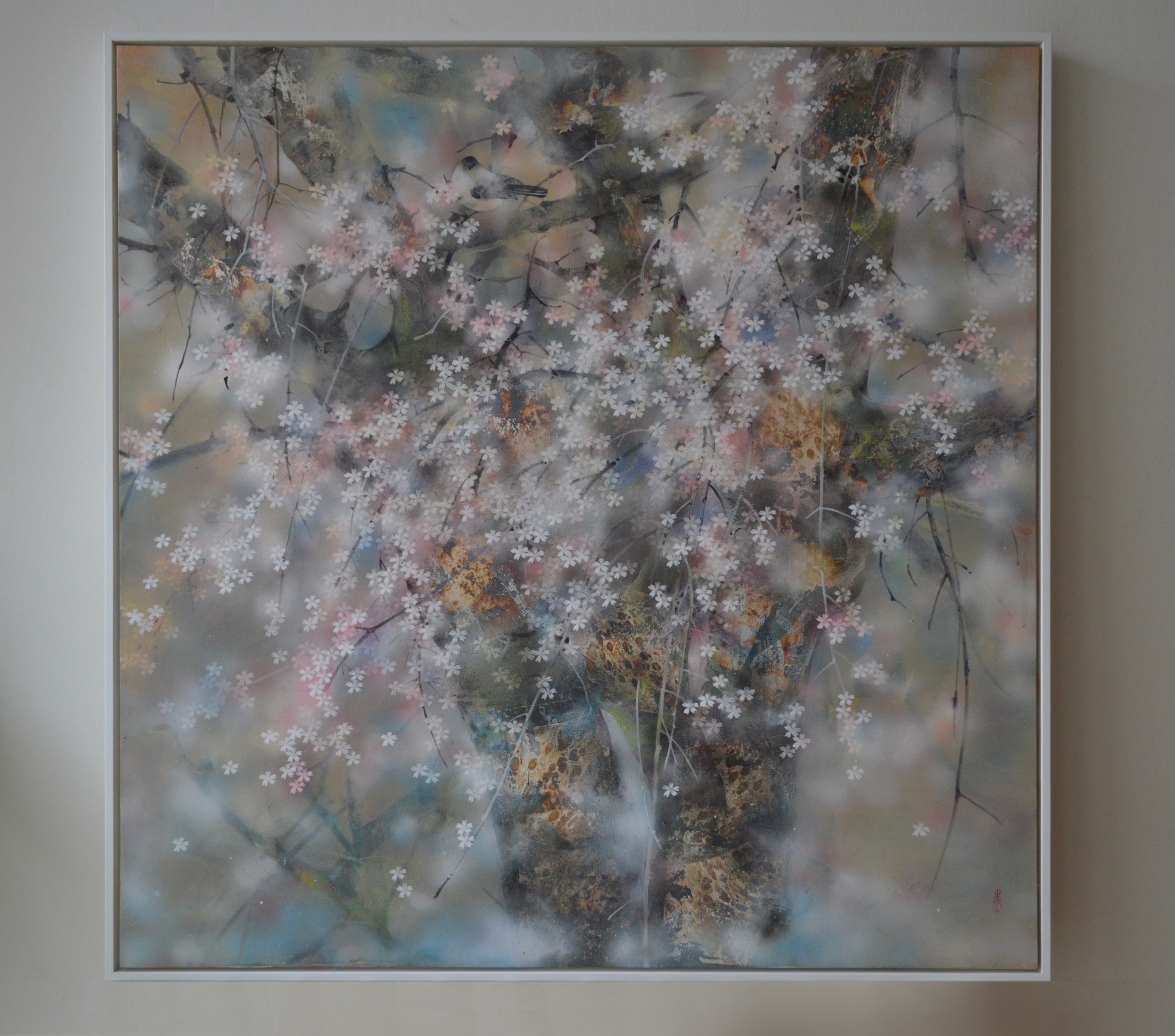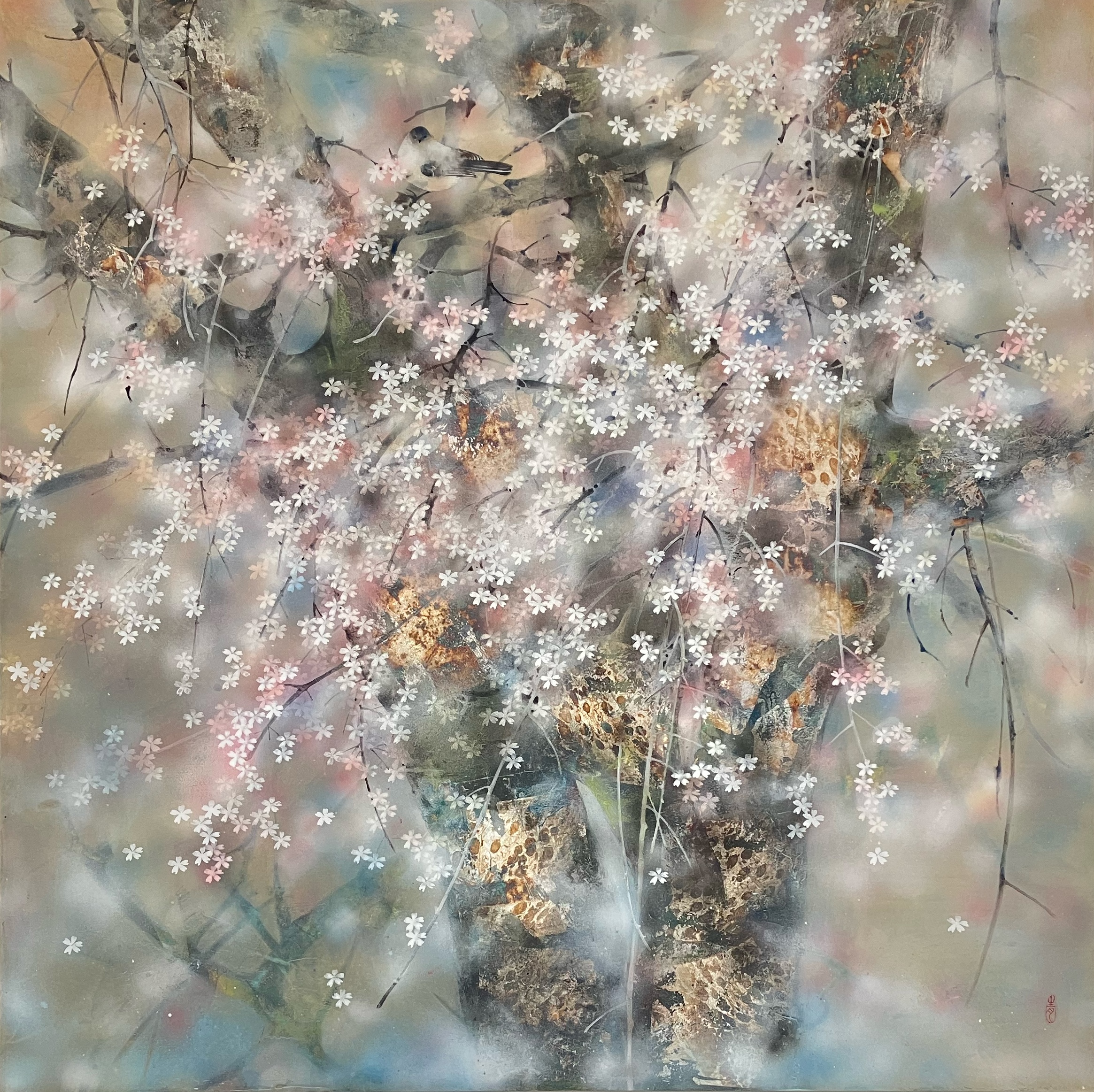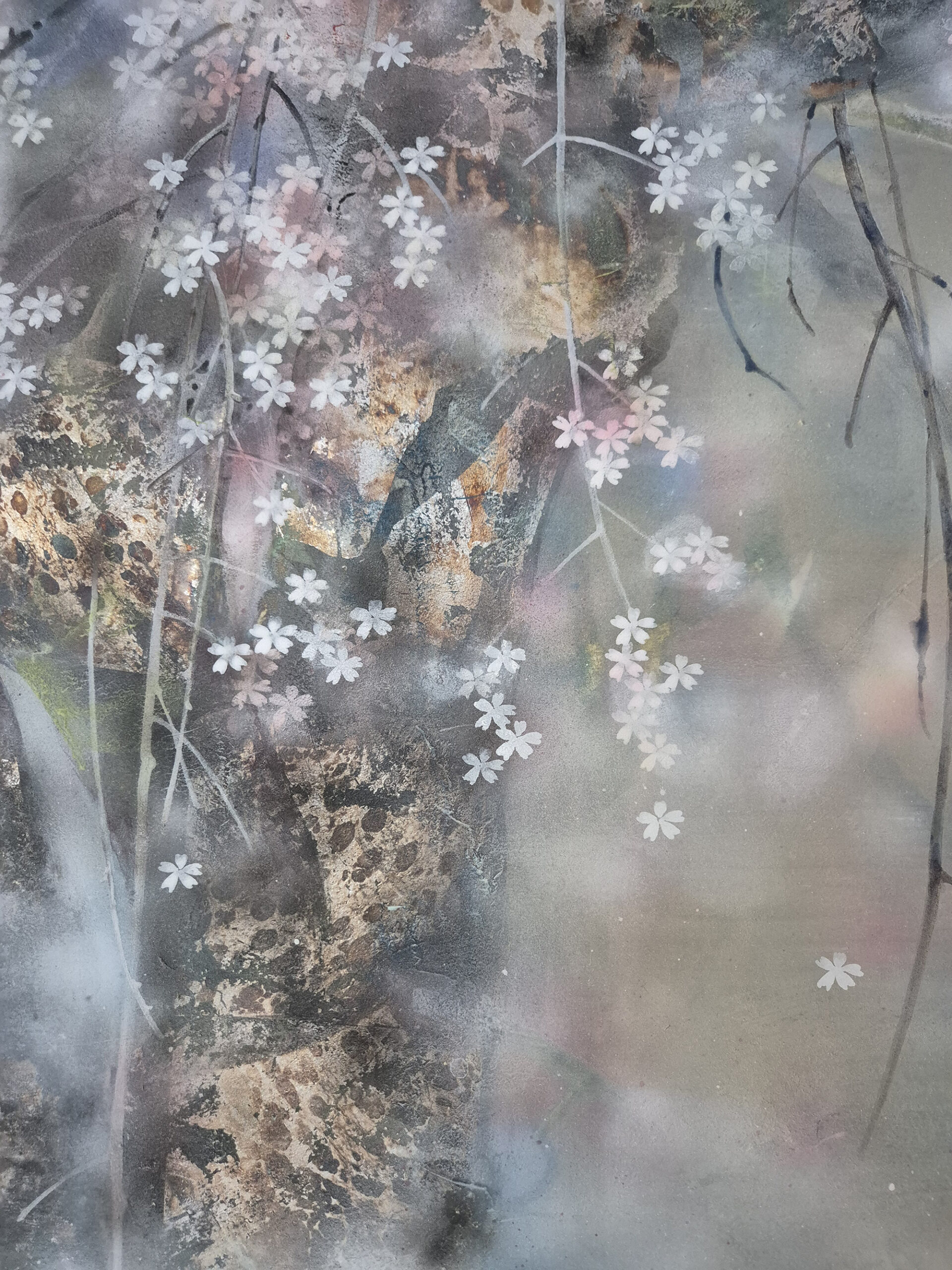 Éveil est une œuvre réalisée par l’artiste contemporain d’origine taïwanaise avec des pigments minéraux et de la feuille d’argent.