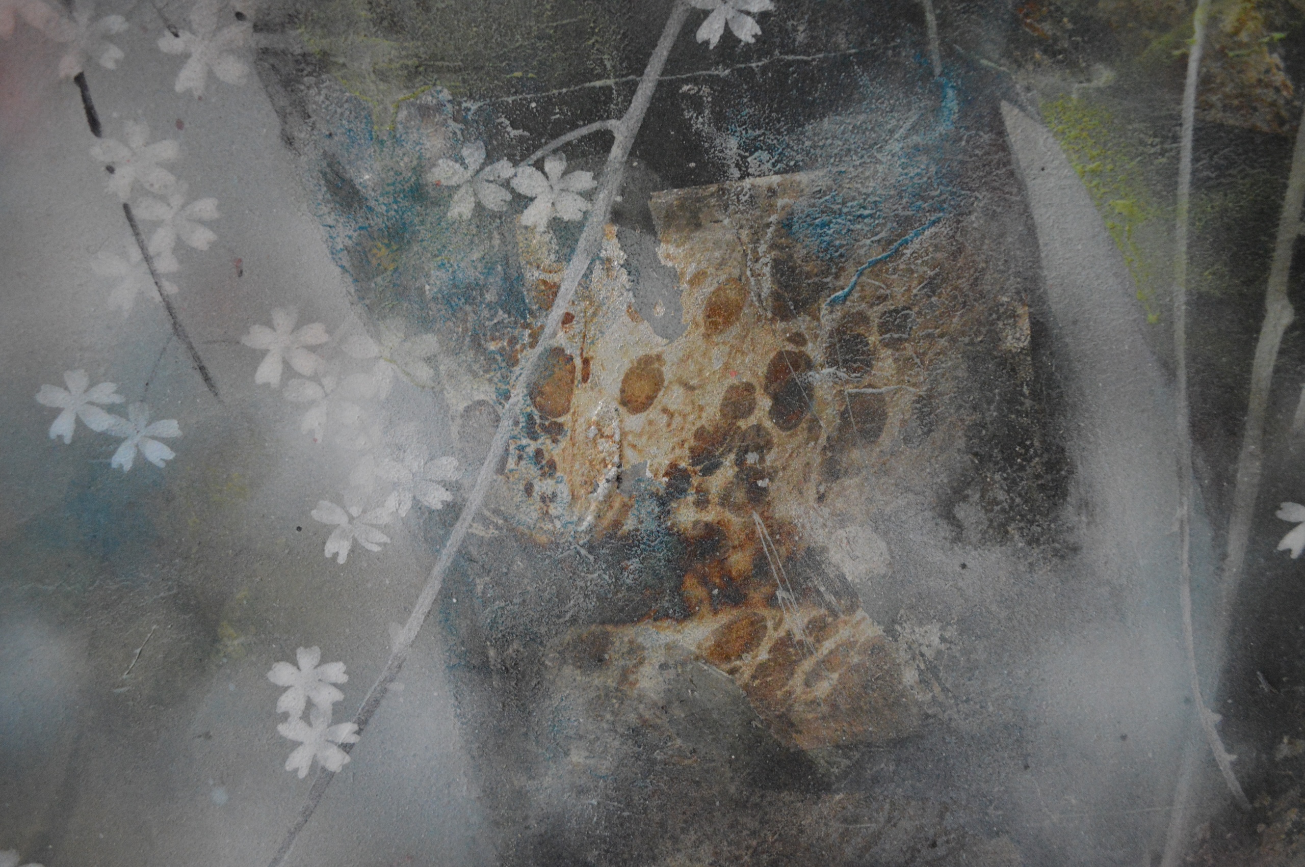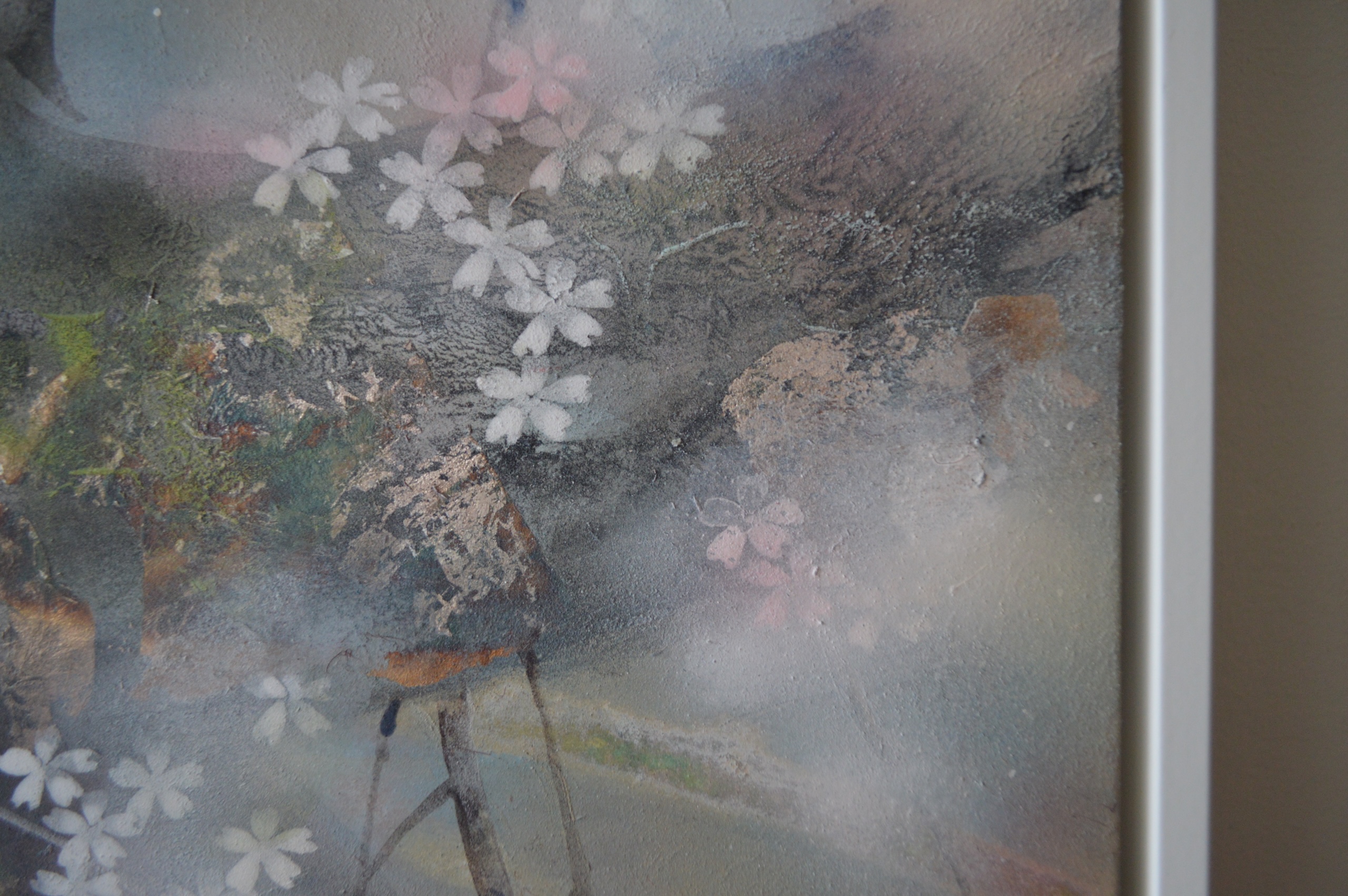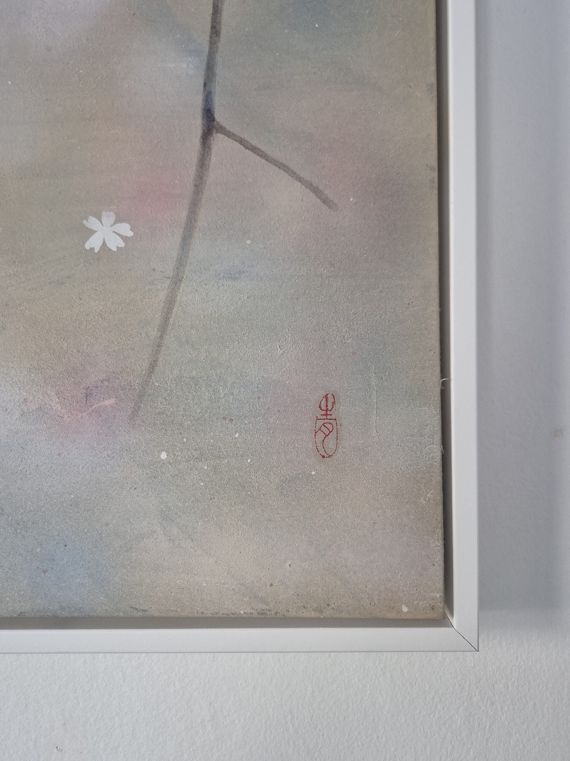 | Description | Pigments minéraux et feuille d'argent sur papier japonais marouflé sur bois |