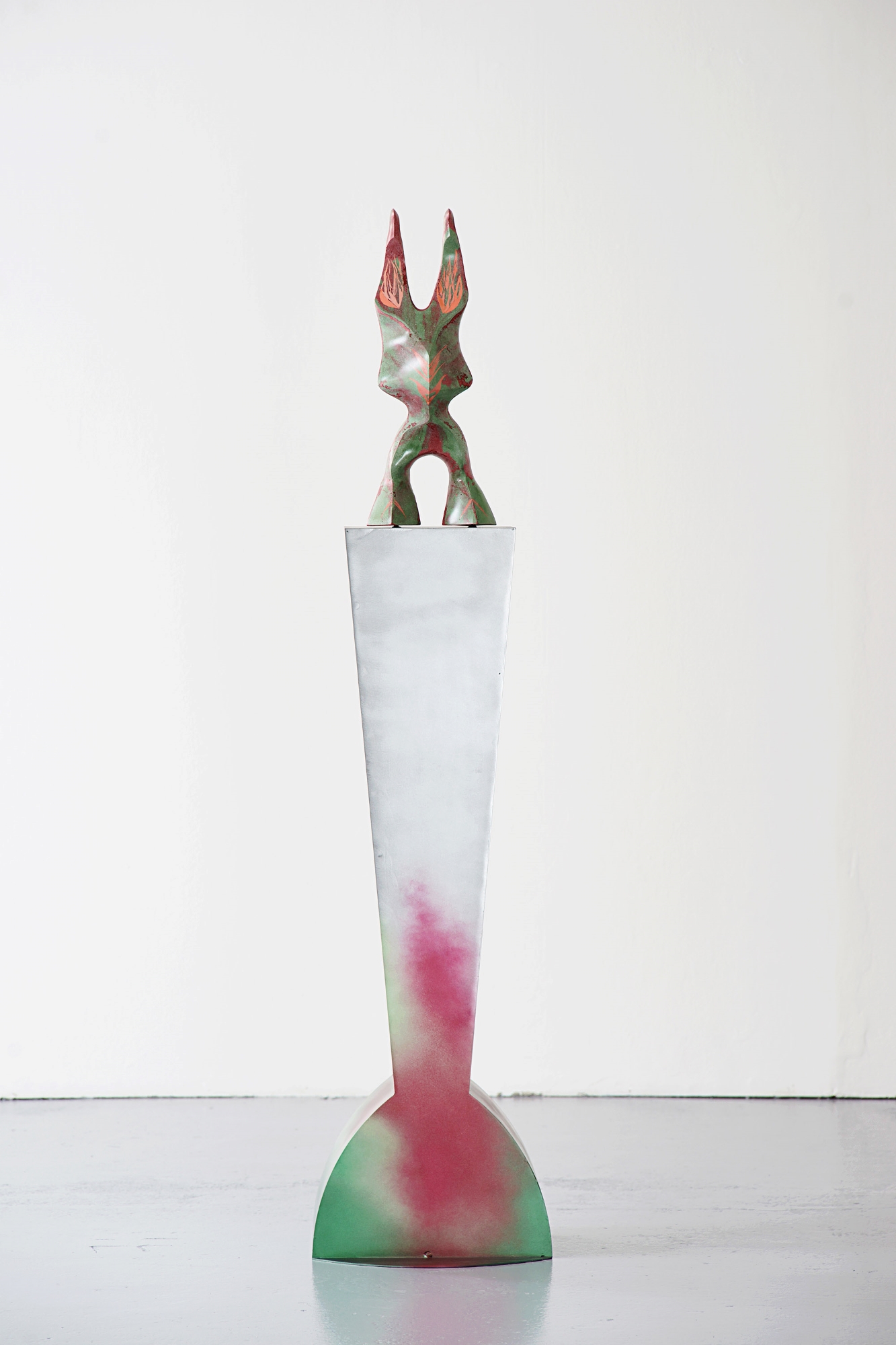 Le titre de cette pièce suggère que la créature est liée au feu. La créature rouge et orange repose sur un socle en acier qui fait écho à ses couleurs, créant ainsi un équilibre esthétique parfait.