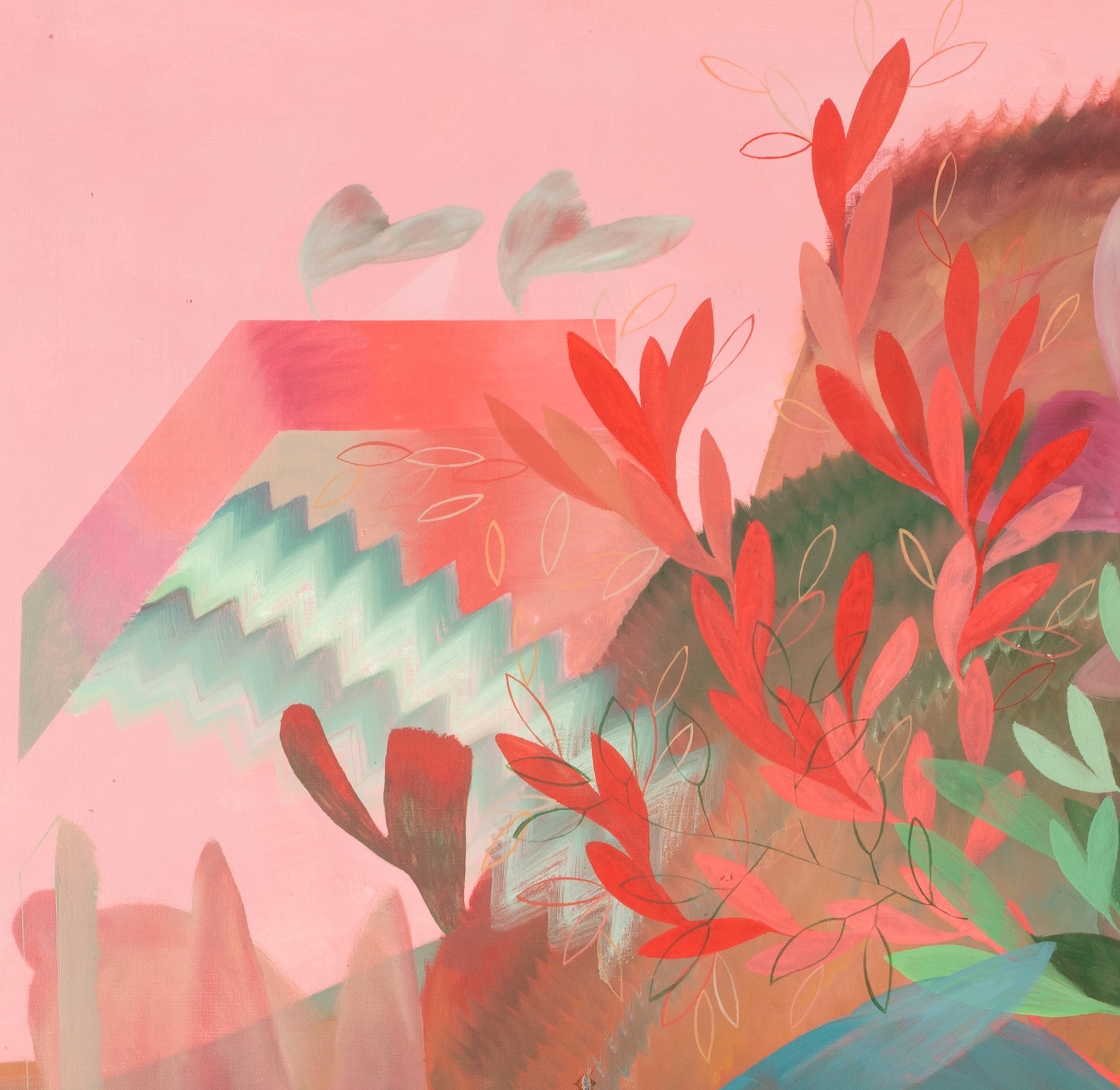 Gardens V est une huile sur toile de l’artiste croate Zoran Šimunović issue de la série GARDENS. Dans cette œuvre il y a un mélange d’éléments qui se détachent d’un fond dominé par des nuances de rose pâle et de jaune. Une figure centrale turquoise est en premier plan, entourée d’un feuillage vibrant rouge et vert.