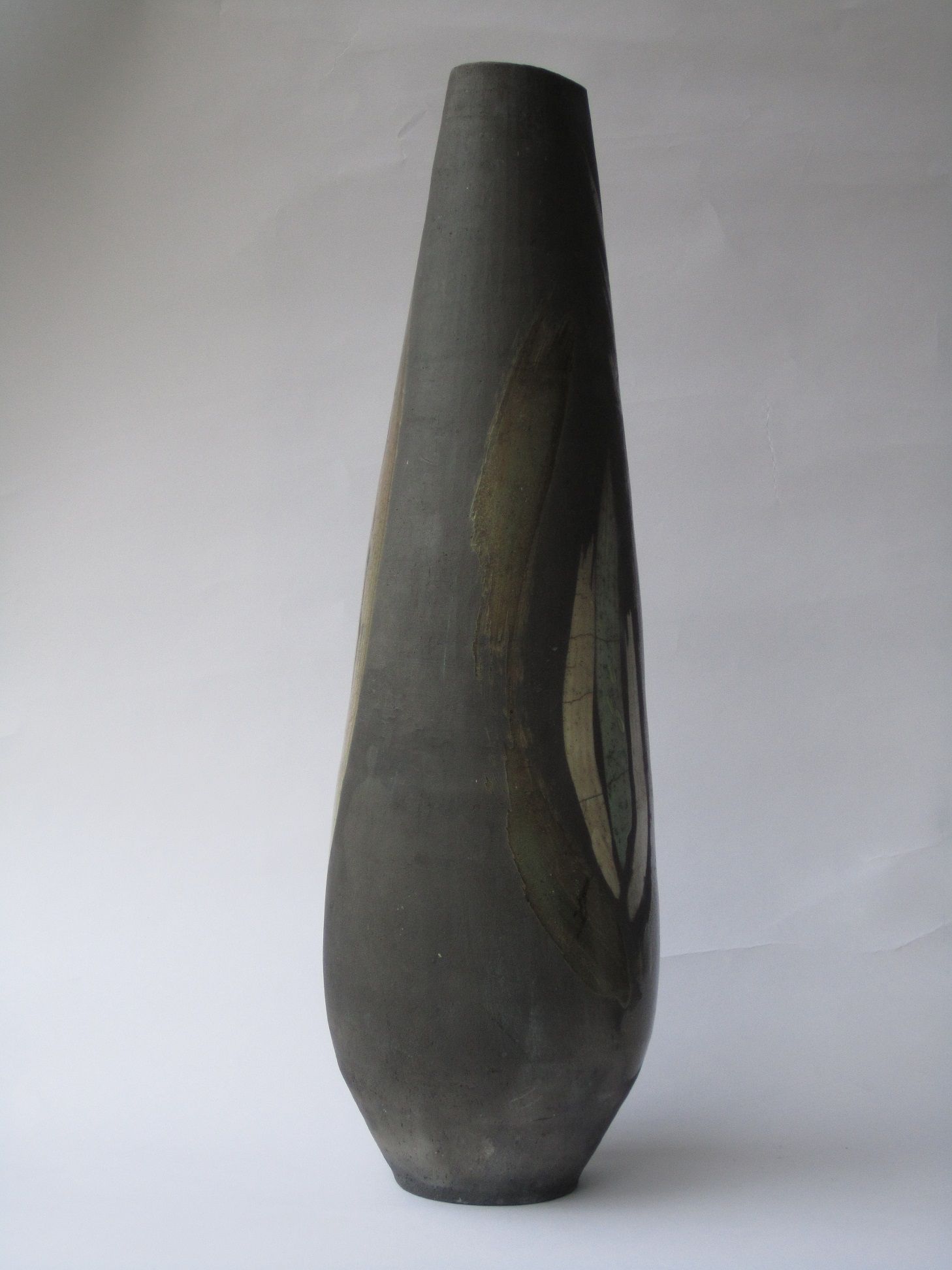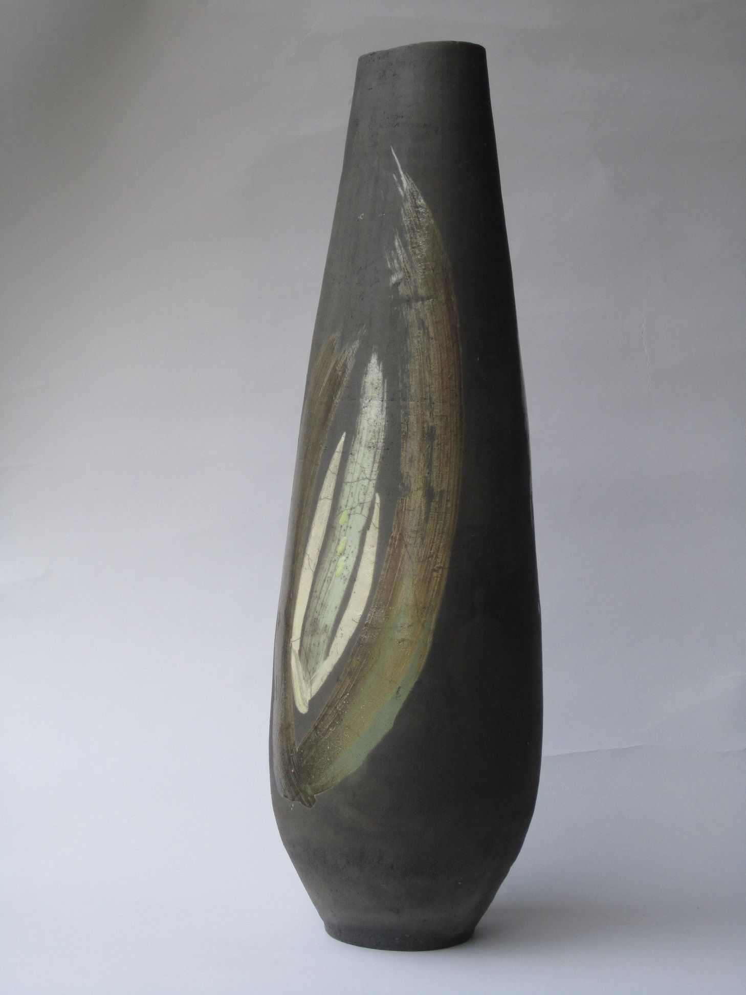 Pour cette artiste asiatique, dont l’oeuvre s’inscrit dans une abstraction sans compromis : « La sculpture existe par la forme et par la ligne, sur l’équilibre fragile de la matière, c’est un travail minimaliste, les oeuvres sont simples et pures. Je tourne et détourne la terre jusqu’à ce que la ligne me dise de cesser. » La technique du Raku (une technique d’émaillage originaire du Japon) donne aux sculptures en terre cuite de Tien Wen leur surface craquelée à l’esthétique dépouillée. Ici, cette sculpture est couverte d’un émail mat de couleur noire, sur lequel l’artiste a dessiné un motif floral.
