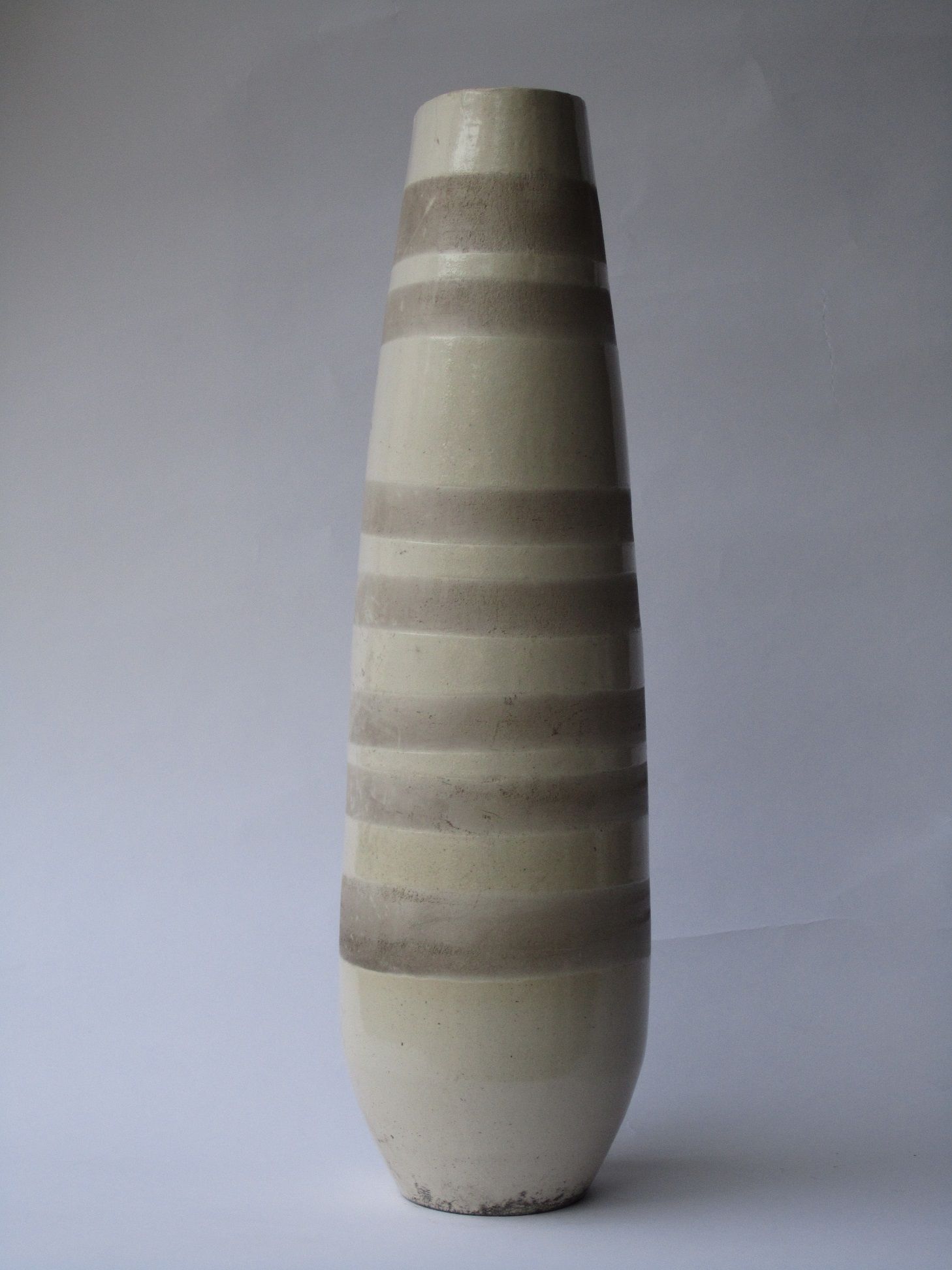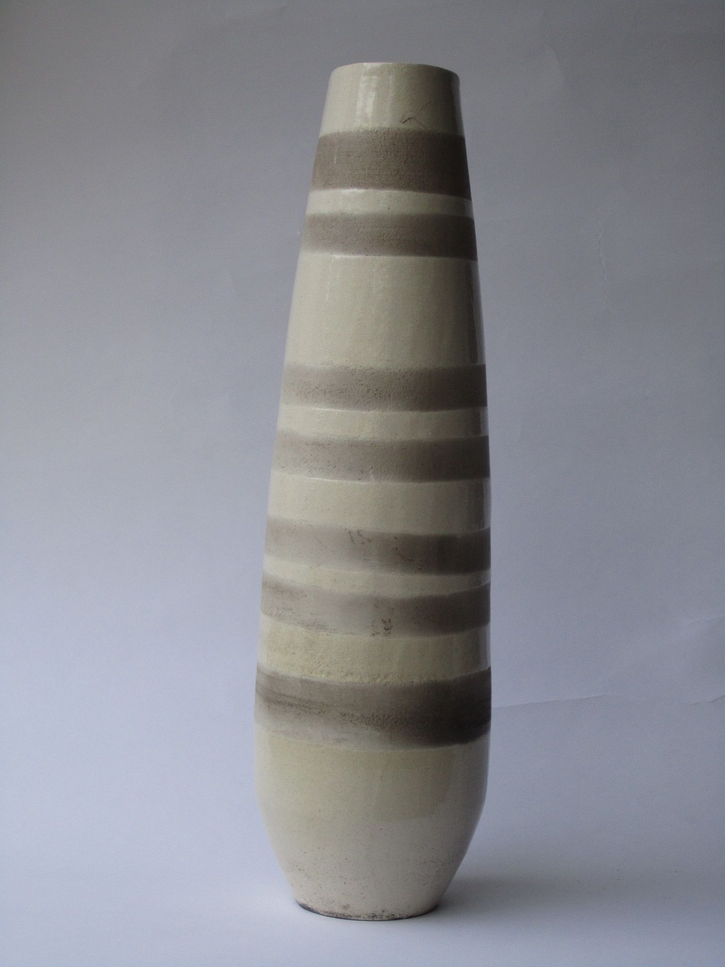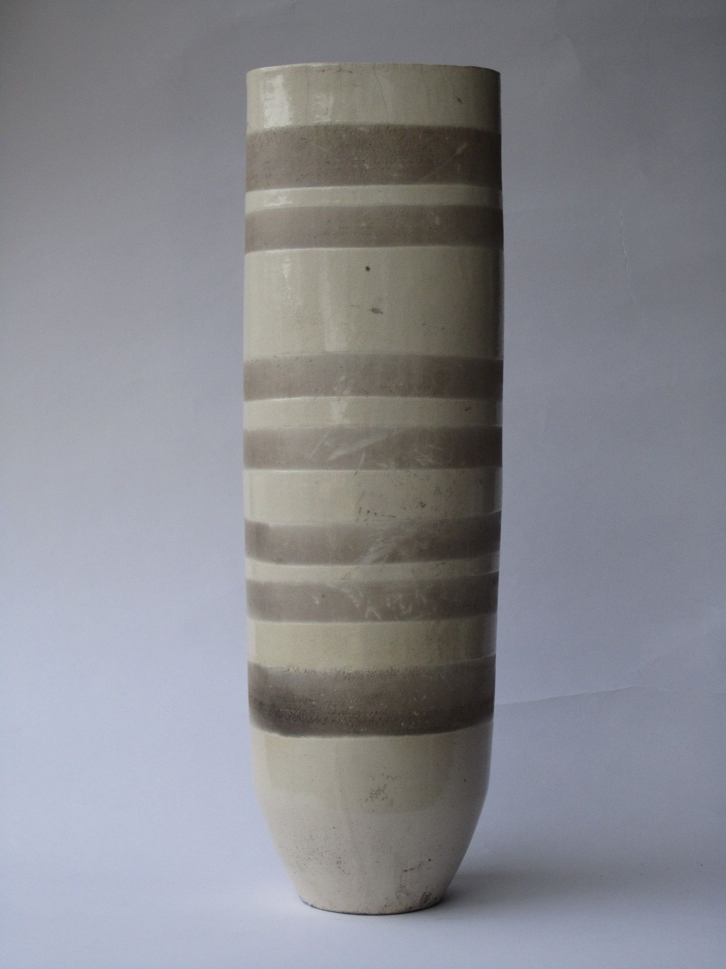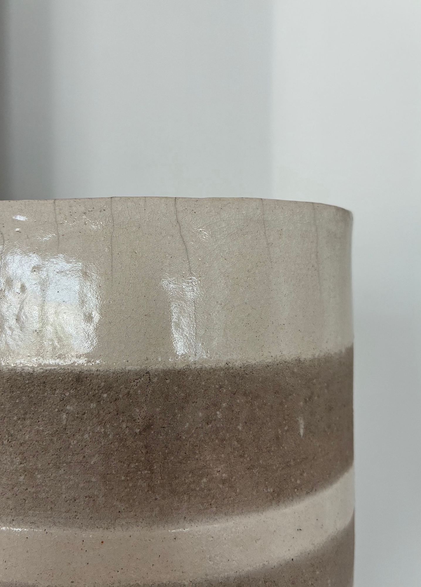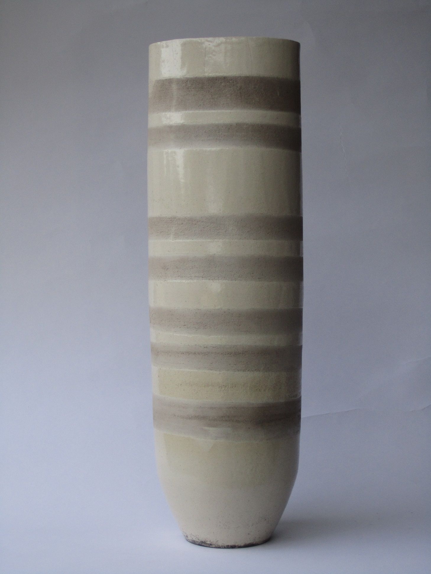 Pour cette artiste asiatique, dont l’oeuvre s’inscrit dans une abstraction sans compromis : « La sculpture existe par la forme et par la ligne, sur l’équilibre fragile de la matière, c’est un travail minimaliste, les oeuvres sont simples et pures. Je tourne et détourne la terre jusqu’à ce que la ligne me dise de cesser. » La technique du Raku (une technique d’émaillage originaire du Japon) donne aux sculptures en terre cuite de Tien Wen leur surface craquelée à l’esthétique dépouillée. Ici, cette sculpture est couverte d’un émail de couleur ivoire et de bandes cendreuses.