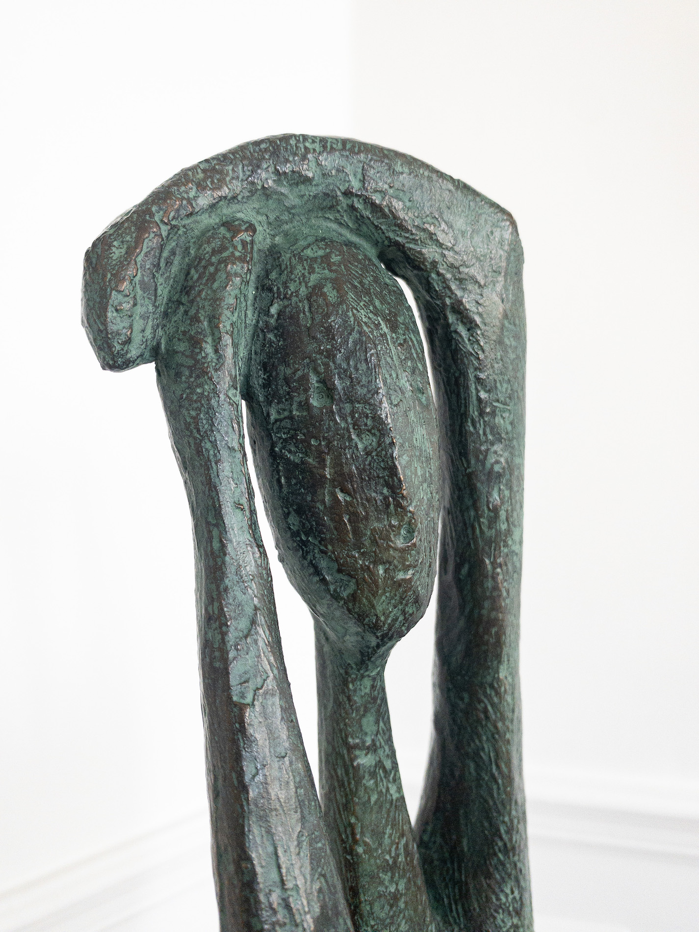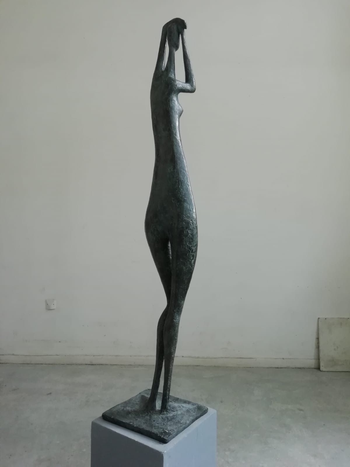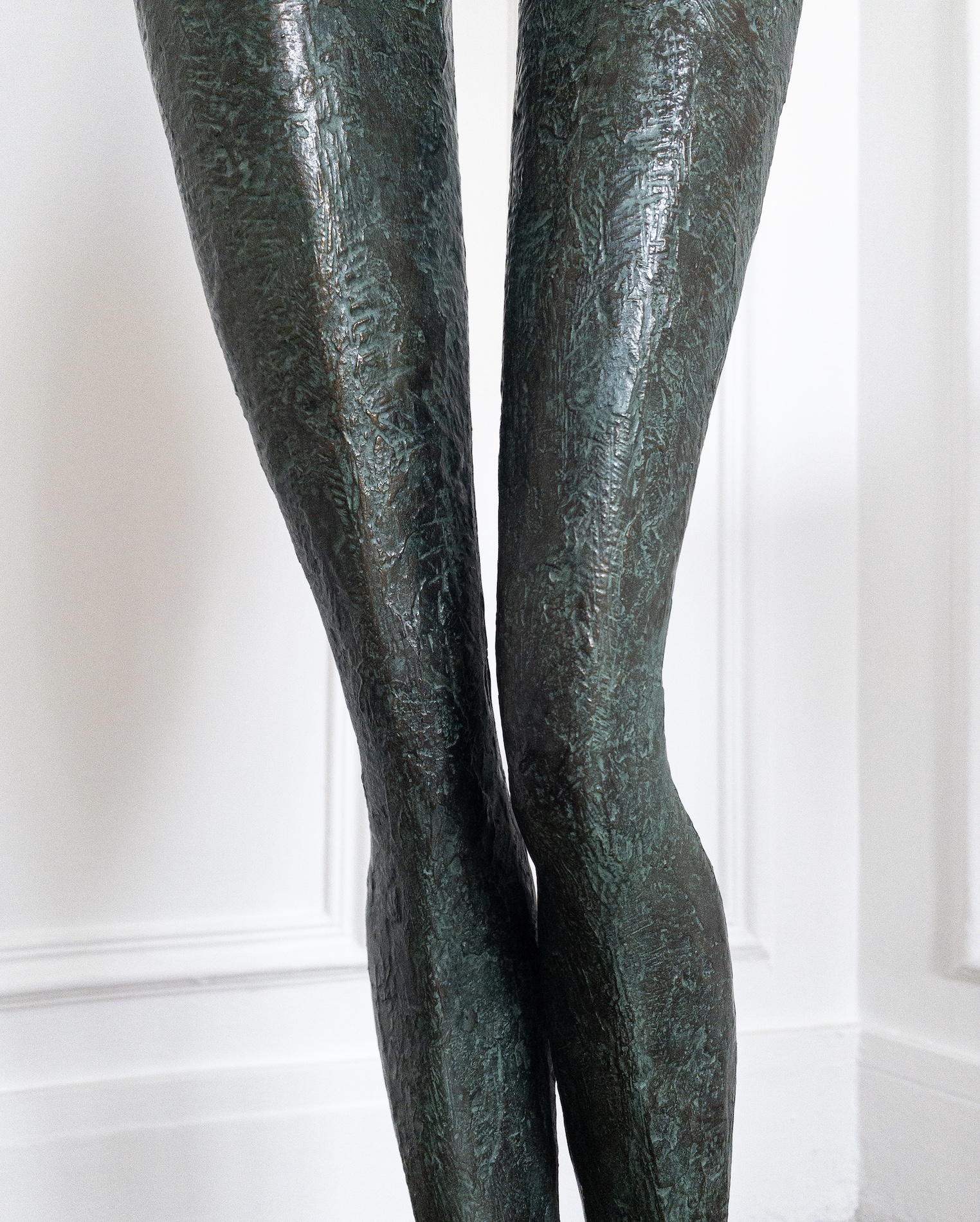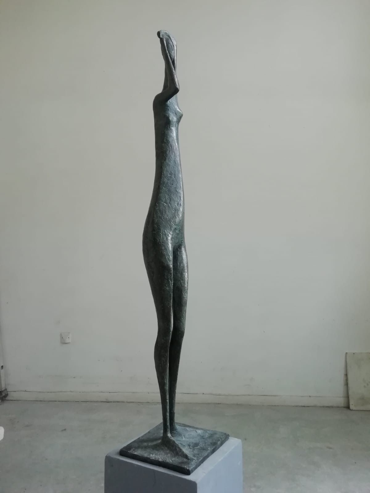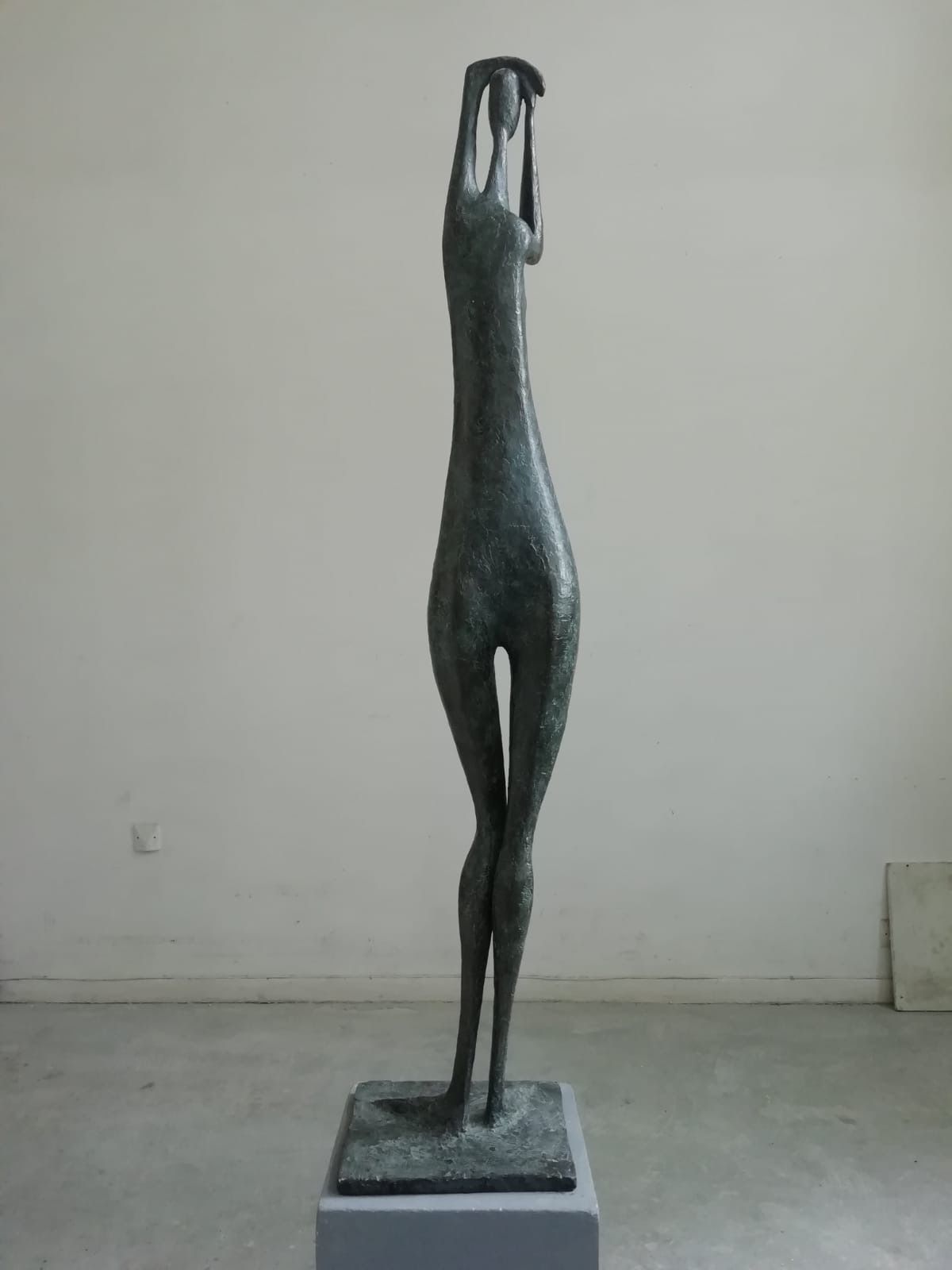 Cette sculpture figurative en bronze représente la silhouette élancée d’une femme se tenant debout et s’étirant gracieusement la colonne vertébrale et les bras. Pierre Yermia se plait à rechercher un équilibre entre force et fragilité : en effet, cette sculpture s’enracine à la fois profondément dans le sol, et s’élève aussi dans un lent mouvement vers la lumière. Les proportions de cette sculpture sont étonnantes : les formes sont allongées, les membres longilignes et fragiles contrastent avec le torse et le bassin de cette femme plus massifs, enfin sa tête réduite à l’essentiel est posée sur un long cou svelte et fuselé. L’artiste semble reprendre la posture du « contrapposto » qui désigne une attitude du corps humain où l’une des deux jambes porte le poids du corps, l’autre étant laissée libre et légèrement fléchie. Celle-ci était notamment utilisée par les sculpteurs antiques afin de mettre en valeur la musculature d’un corps. Ici, les jambes légèrement pliées, la hanche décalée ; cette posture stylisée par Pierre Yermia ajoute un esthétisme à cette œuvre.