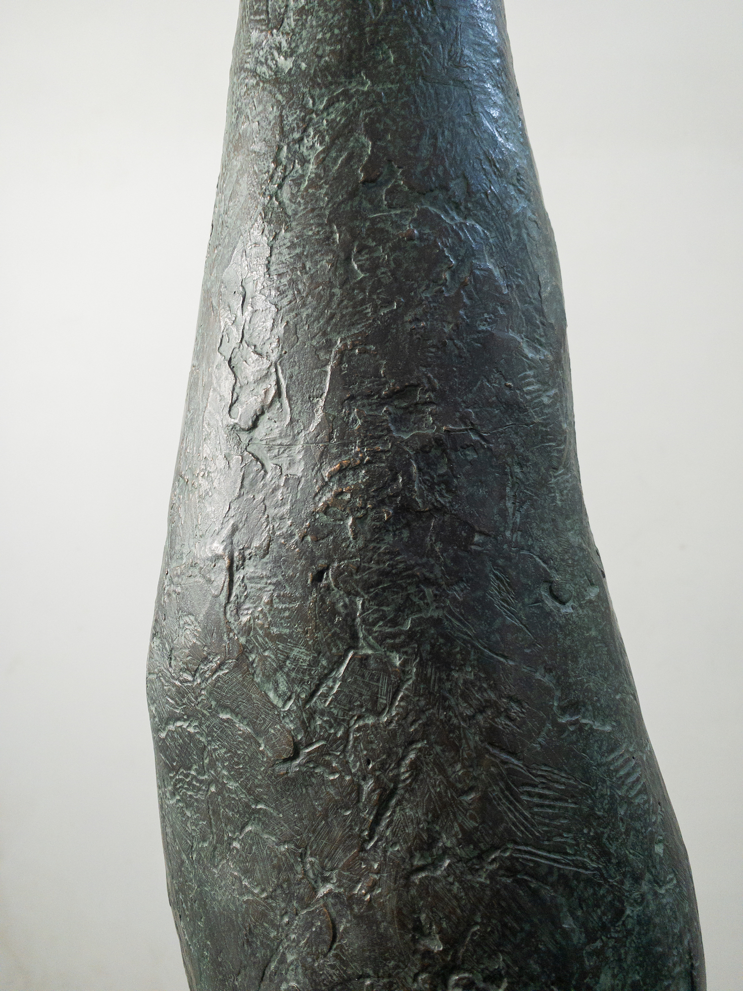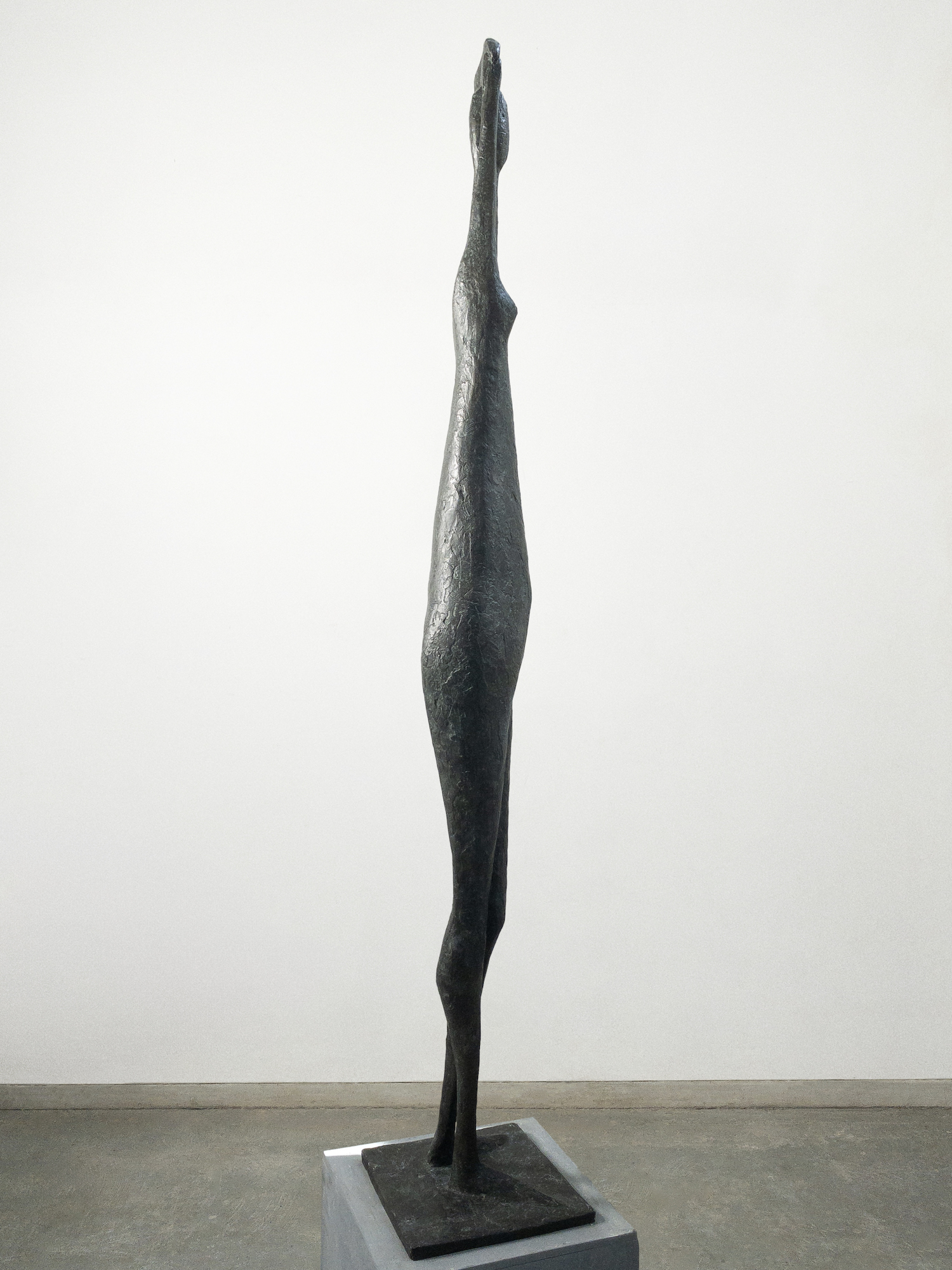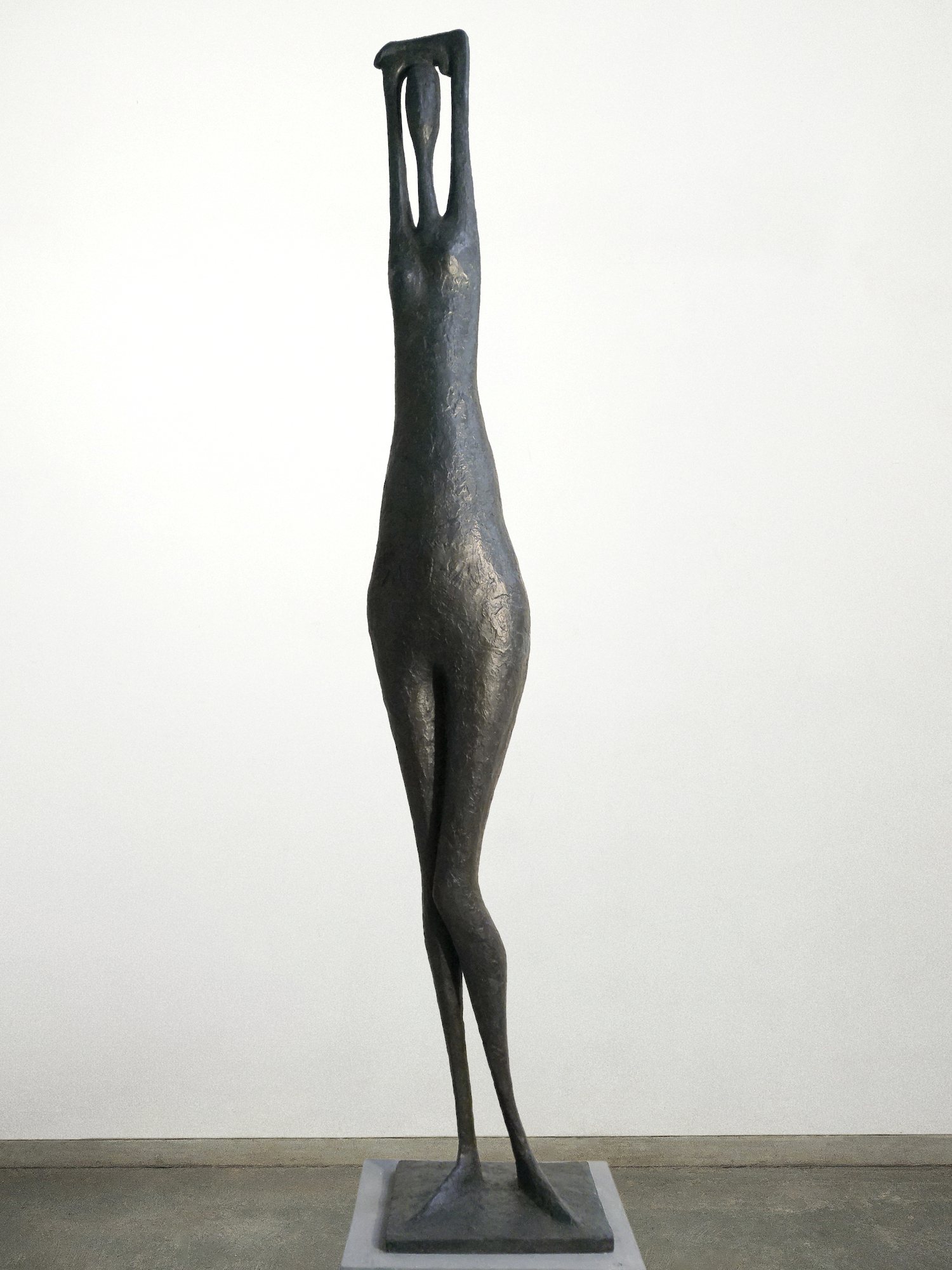 Cette sculpture figurative en bronze représente la silhouette élancée d’une femme se tenant debout et s’étirant gracieusement la colonne vertébrale et les bras. Pierre Yermia se plait à rechercher un équilibre entre force et fragilité : en effet, cette sculpture s’enracine à la fois profondément dans le sol, et s’élève aussi dans un lent mouvement vers la lumière. Les proportions de cette sculpture sont étonnantes : les formes sont allongées, les membres longilignes et fragiles contrastent avec le torse et le bassin de cette femme plus massifs, enfin sa tête réduite à l’essentiel est posée sur un long cou svelte et fuselé. L’artiste semble reprendre la posture du « contrapposto » qui désigne une attitude du corps humain où l’une des deux jambes porte le poids du corps, l’autre étant laissée libre et légèrement fléchie. Celle-ci était notamment utilisée par les sculpteurs antiques afin de mettre en valeur la musculature d’un corps. La posture stylisée par Pierre Yermia ajoute un esthétisme à cette œuvre. Dans cette série, l’artiste joue également sur les rapports des vides et des pleins de ses sculptures.