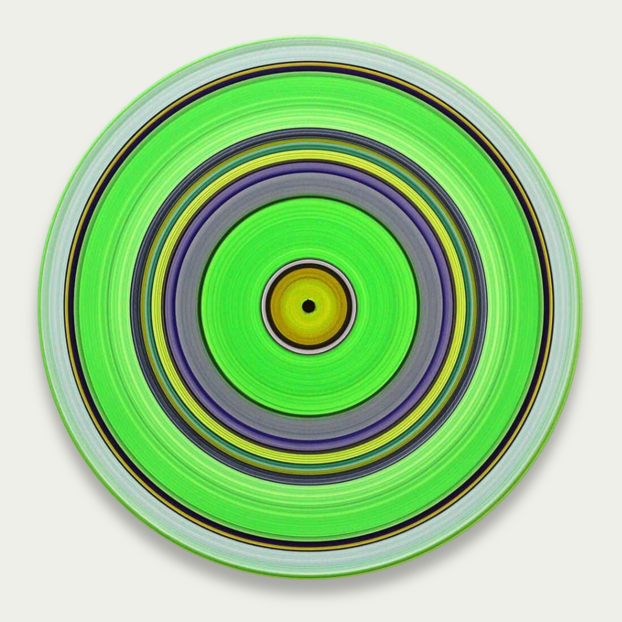 Dans cette dernière série Sound and Vision, la ligne reste le motif unique de ces compositions, mais elle s’illustre sur un nouveau support qui n’est autre que le disque vinyle. En peignant sur un plateau tournant, l’artiste a transformé ces supports de données acoustiques en supports visuels : les compositions musicales sont comme rejouées au pinceau, dans une sorte de transmutation du son en image. Composés individuellement dans une recherche permanente d’équilibre entre ligne, couleur et rythme, ces tableaux constituent un alphabet dans lequel l’artiste puise pour créer différentes installations et assemblages.