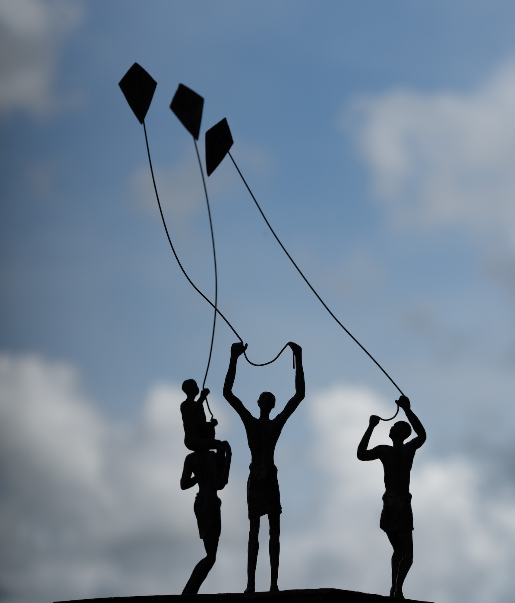 Groupe de 3 voiles d’enfance I est une sculpture en bronze de l’artiste contemporaine française Marine de Soos. Cette œuvre d’art figuratif à l’esthétique délicate et légère représente un groupe d’hommes et d’enfants faisant voler un cerf-volant avec un enfant. L’œuvre est inspirée d’une scène de vie imaginaire ou vécue par l’artiste.