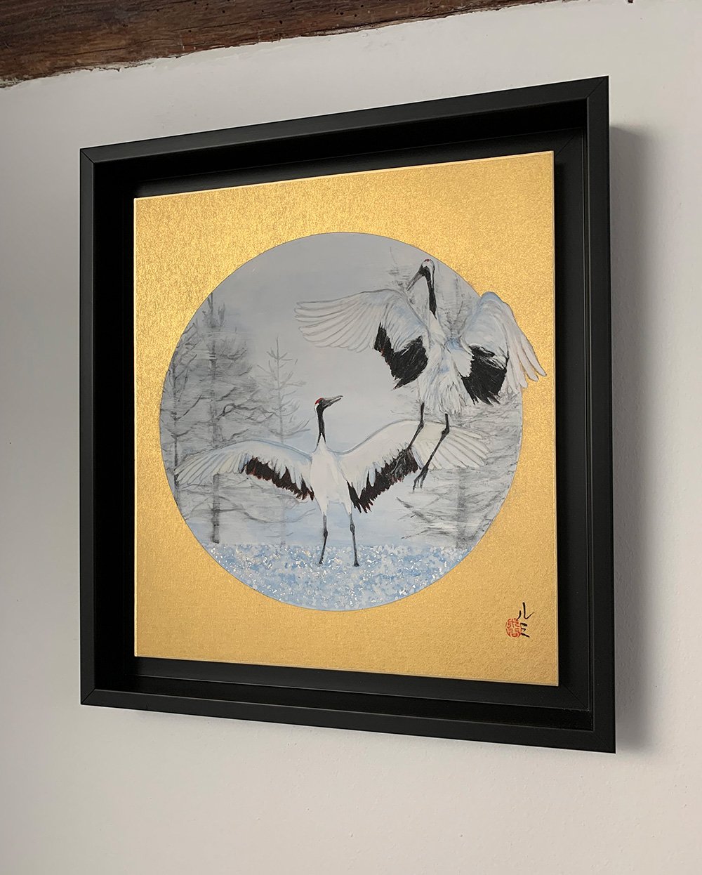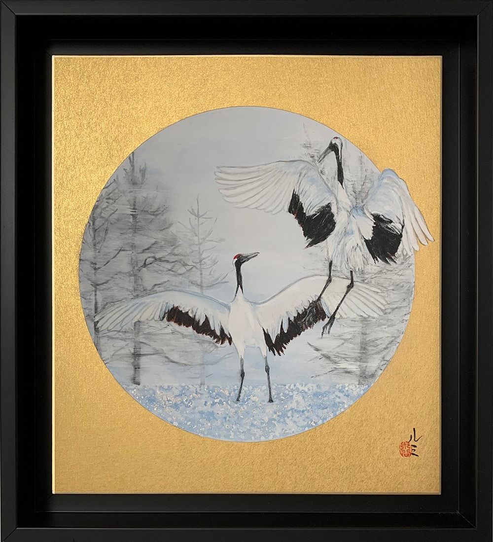 Grues dansantes II est une peinture de l’artiste contemporaine franco-japonaise Lumi Mizutani. Cette peinture de petit format, réalisée avec les pigments de couleur et l’encre de chine, représente deux grues du Japon. Ce sont des oiseaux parmi les plus grands au monde, avec un long cou et des longues pattes qui leur confèrent une allure très gracieuse. Elles ont la particularité d’être blanches et noires avec une petite partie rouge sur le haut du crâne, qui leur vaut l’appellation de « grues au sommet vermillon » en Chine.