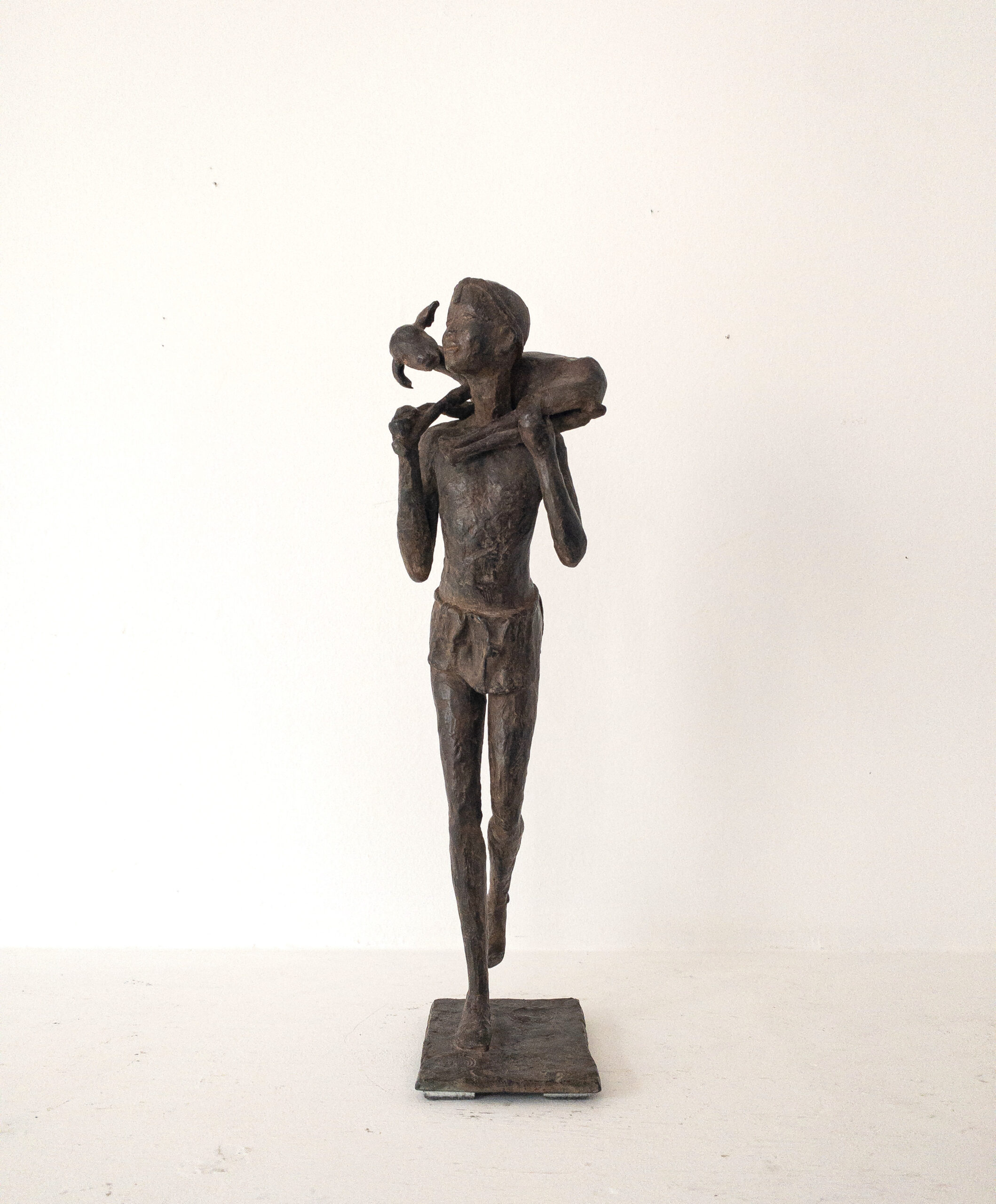 Heïdrun est une sculpture en bronze de l’artiste contemporaine française Marine de Soos. Cette œuvre d’art figuratif représente un jeune homme souriant et heureux, simplement vêtu, marchant avec une petite chèvre sur ses épaules. Heidrun est le nom d’une chèvre qui fait partie de la mythologie nordique. Inspirée d’une scène de vie imaginaire ou vécue par l’artiste, cette figure en bronze peut tout à fait être installée à l’extérieur.