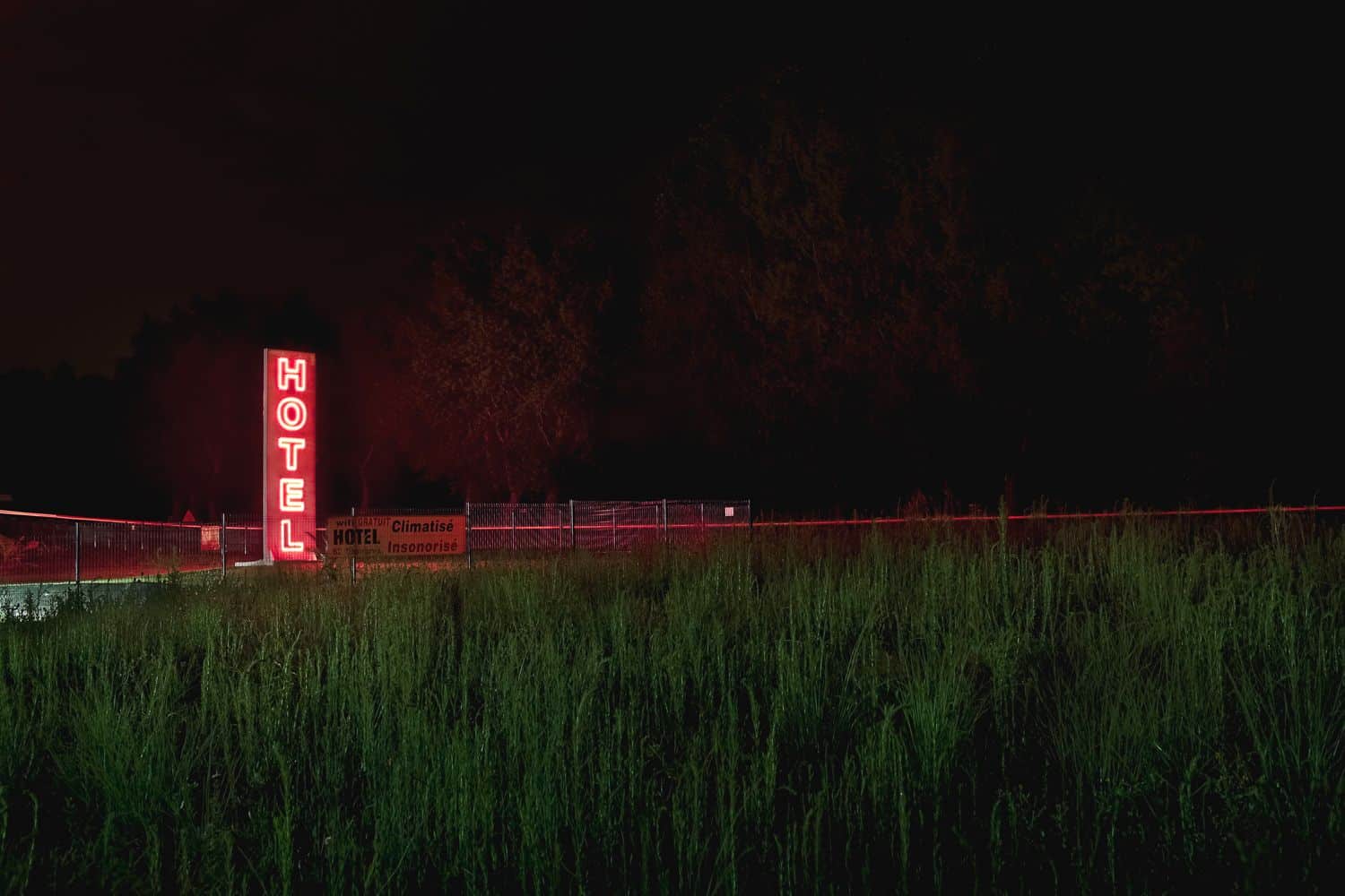 Hotel est une photographie de l’artiste contemporain Xavier Dumoulin issue de la série « Passager de la nuit ». Préoccupé par des problématiques environnementales, Xavier Dumoulin révèle, avec ses photographies, une croissante dichotomie entre l’homme et son environnement.
