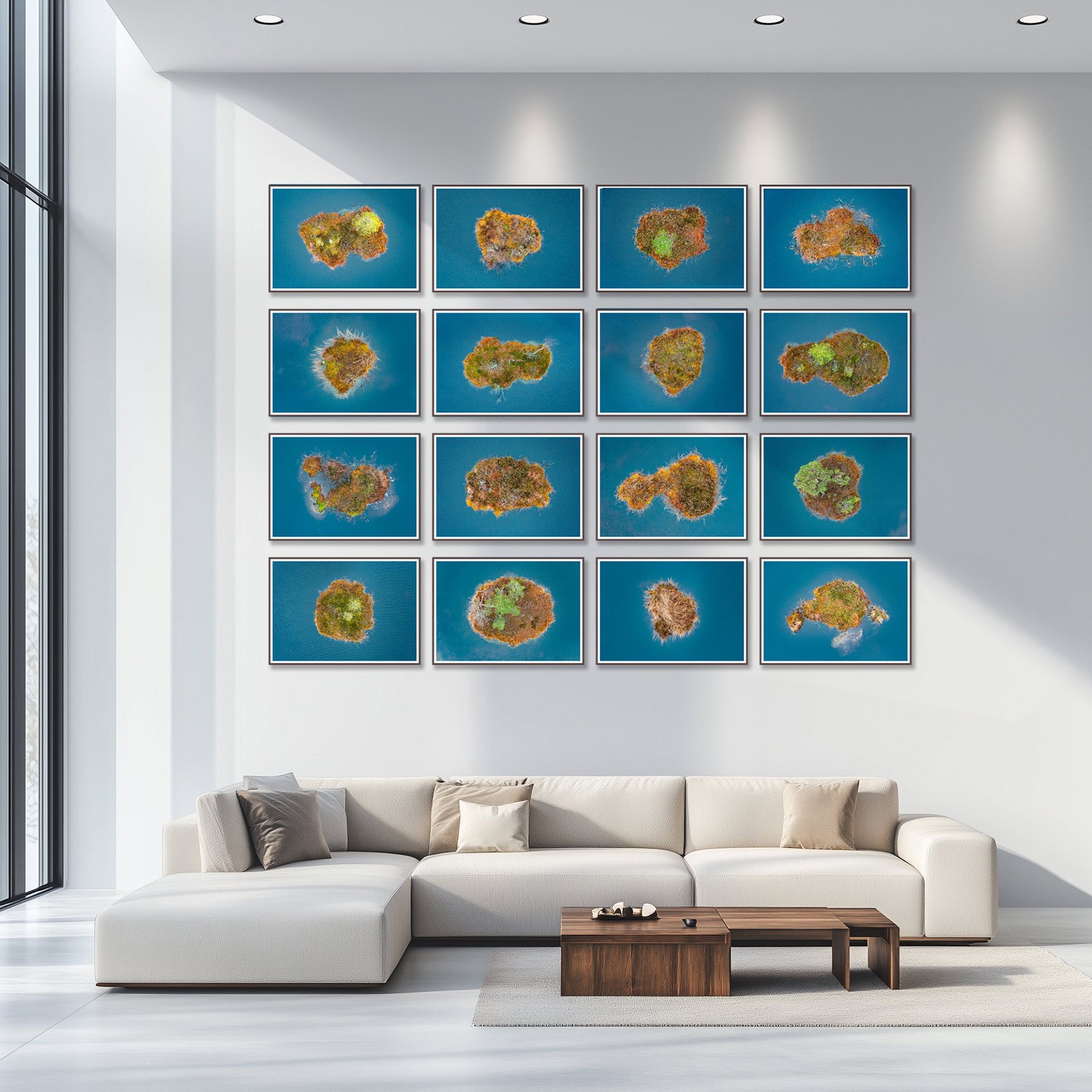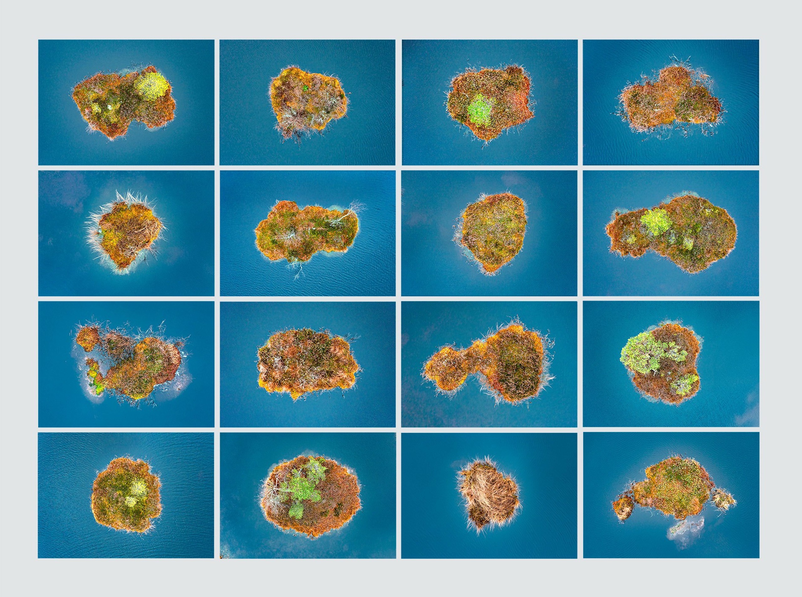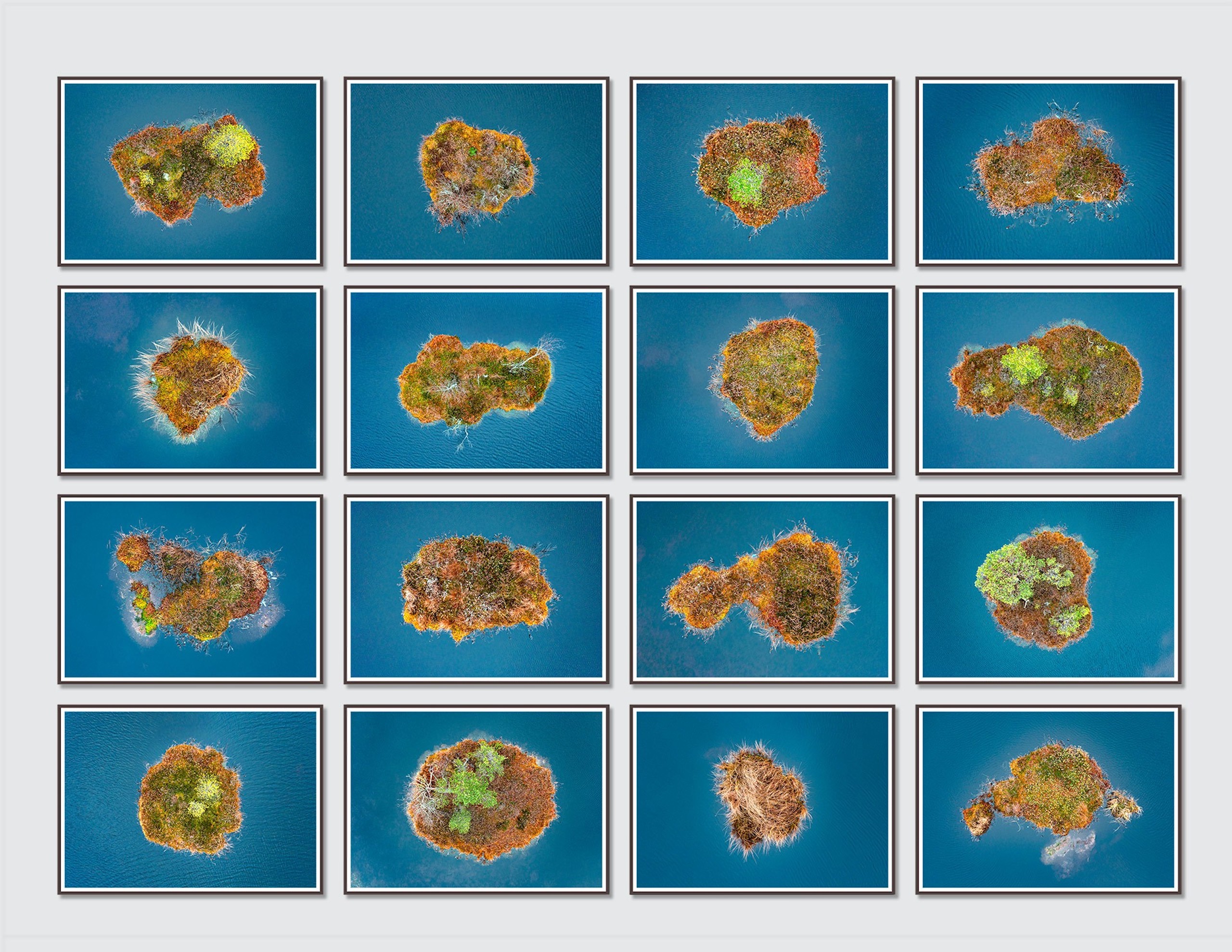 Installation de 16 photographies de la série The Bog Islands est un ensemble de 16 photographies réalisées par l’artiste contemporain allemand Bernhard Lang.