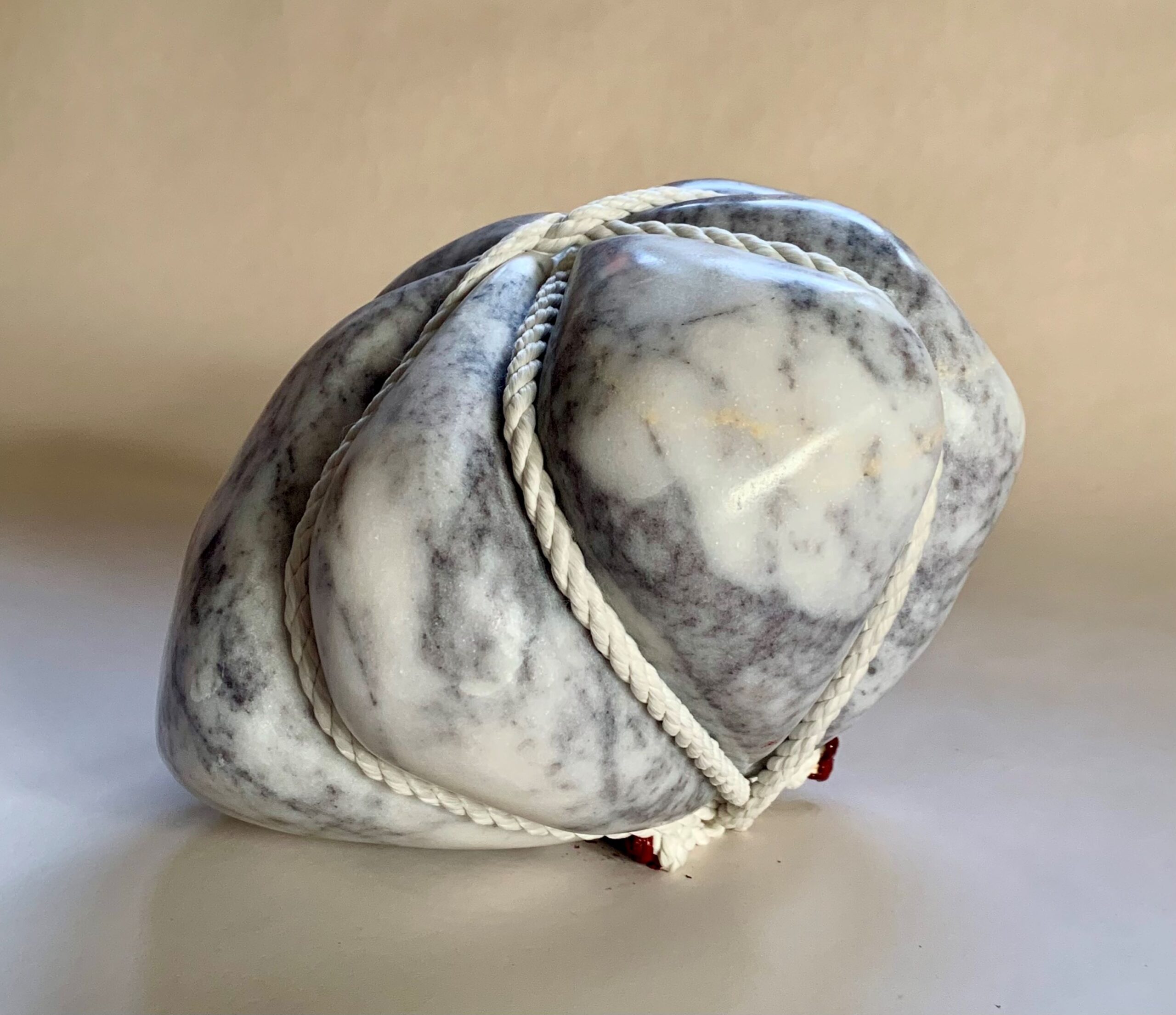 L’artiste instaure un dialogue visuel entre deux matériaux très différents pour leur aspect et caractéristiques. La corde, comme si elle contenait la forte pression exercée par une pierre devenue dynamique, transforme cette dernière en un matériau modulable et souple remettant donc en question sa dureté. Cet alliage est donc étonnant et curieux : qui de la corde ou de la pierre exerce une pression sur l’autre ?