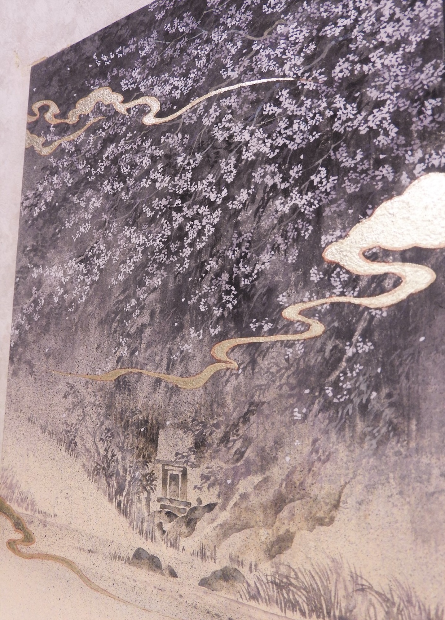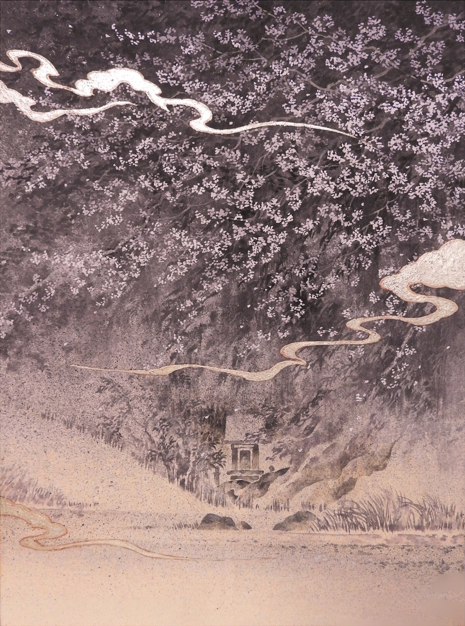 | Description | Pigments, encre Sumi et feuille d'argent sur papier japonais monté sur panneau de bois |