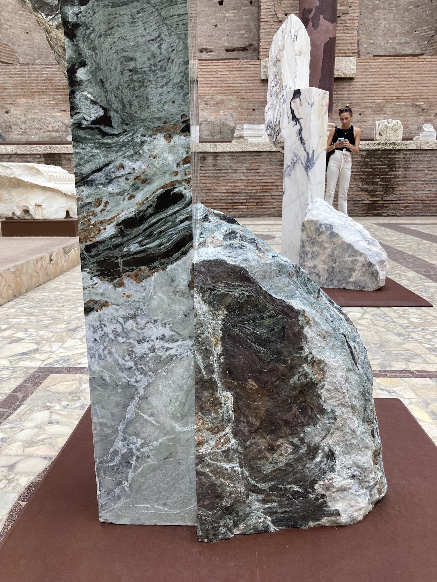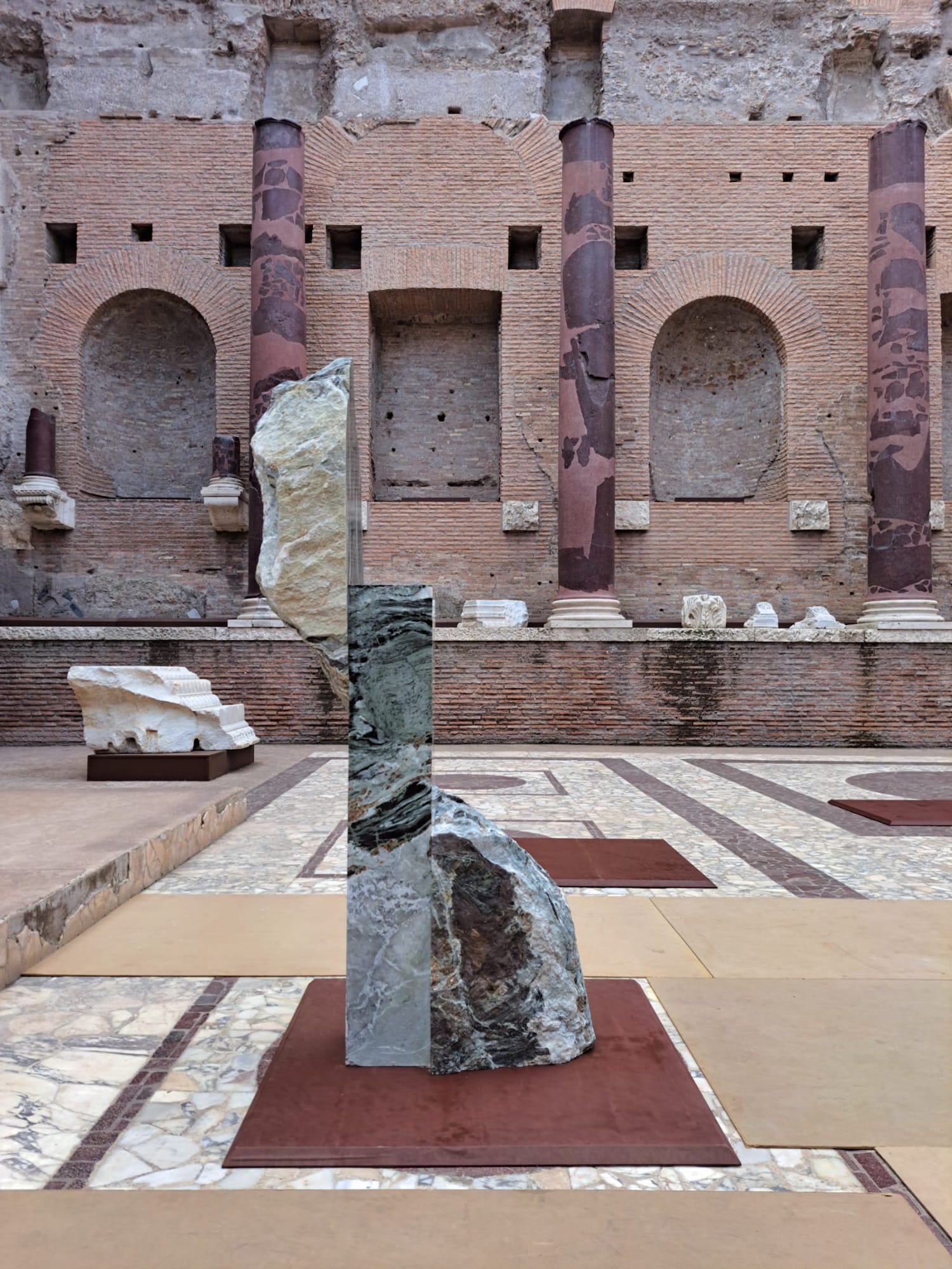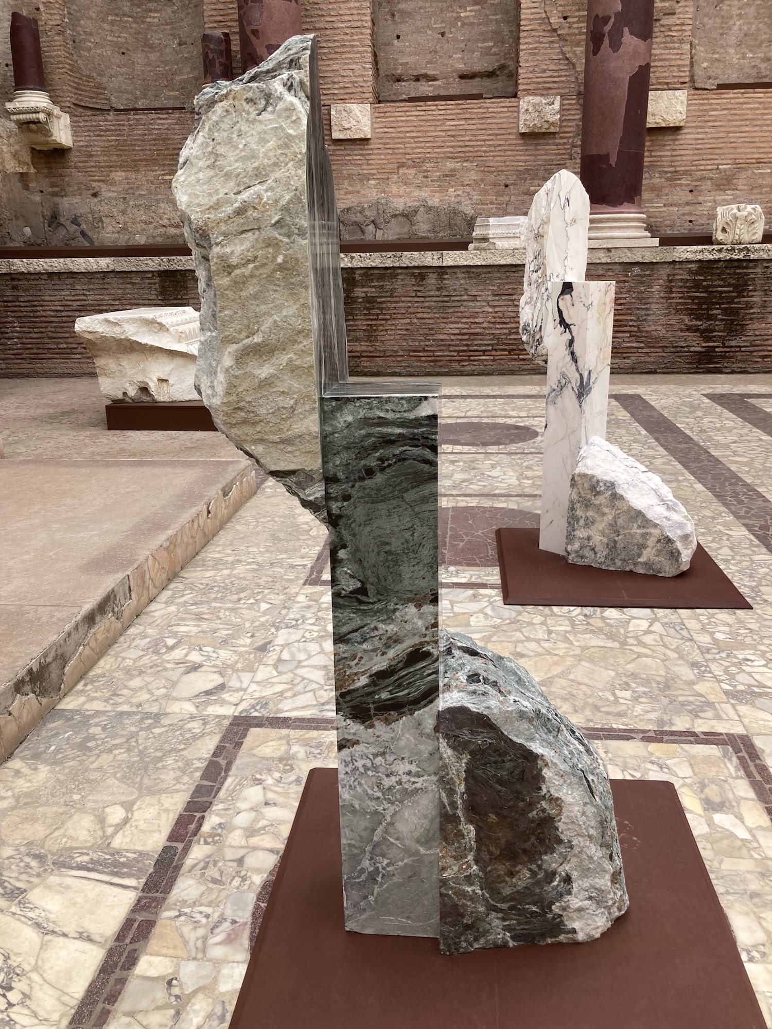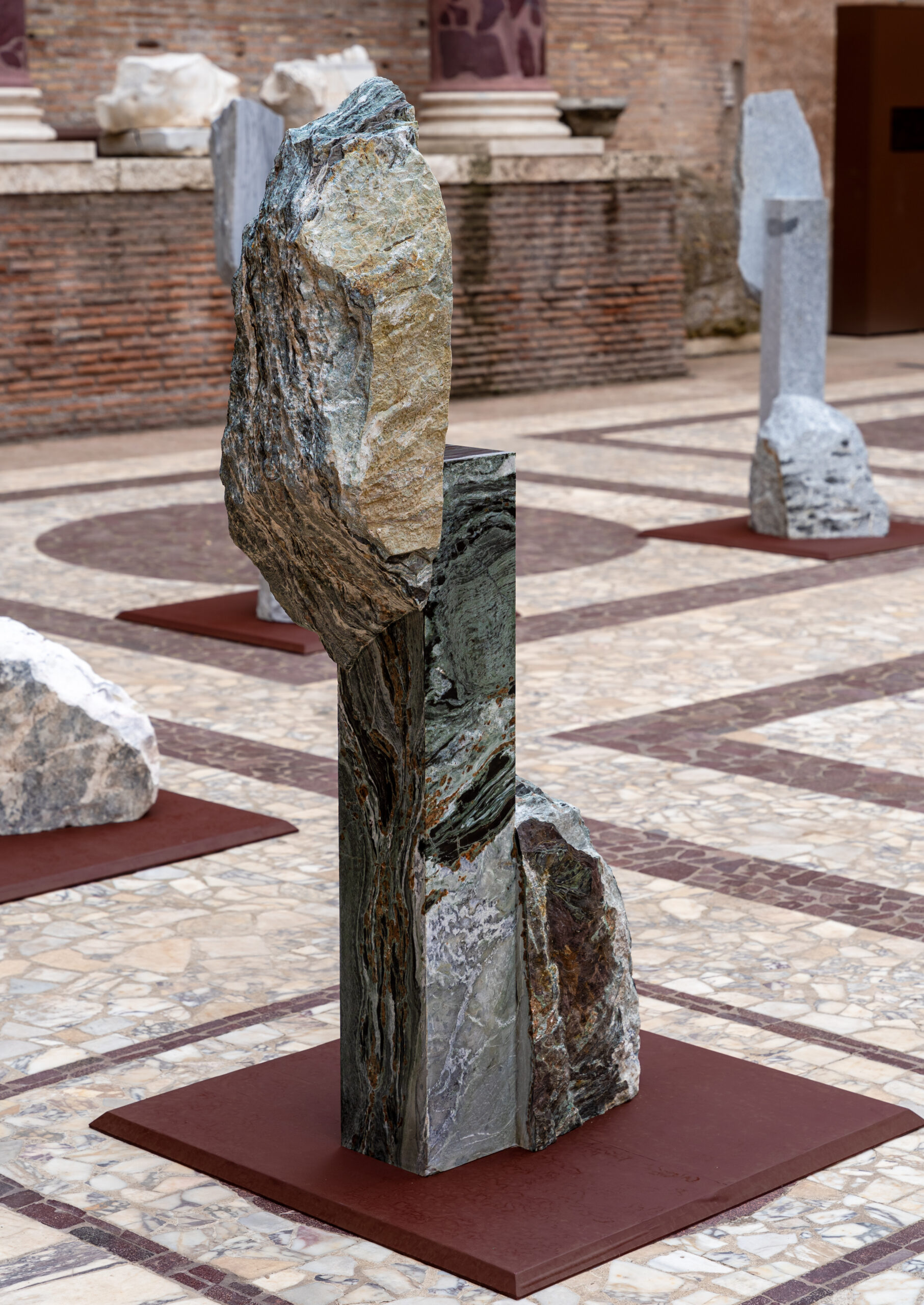 Chaque œuvre de la série « Korai » est de forme identique, mais est réalisée dans un marbre d’exception distincte : Cipollino d’Elbe, Fantastico d’Arni, Rosso Collemandina, Portoro, Bardiglio, le marbre statuaire de la carrière de Michel-Ange… Ces marbres sont typiques de l’époque de l’architecture romaine impériale, en profonde harmonie avec l’essence du lieu qui les abrite le temps de l’exposition : le Temple de Vénus et de Rome, immense bâtiment sacré inauguré en 136 après J.-C.