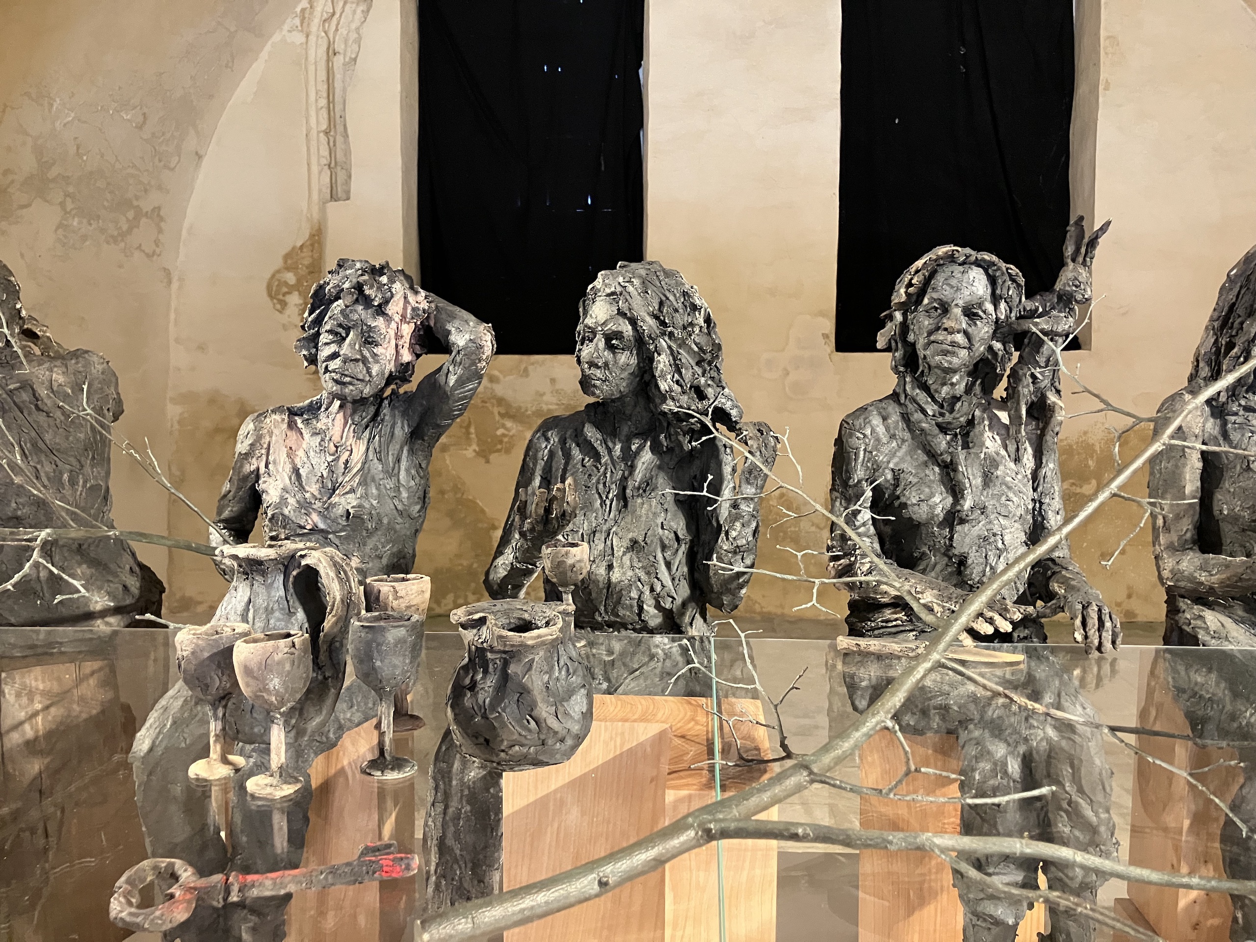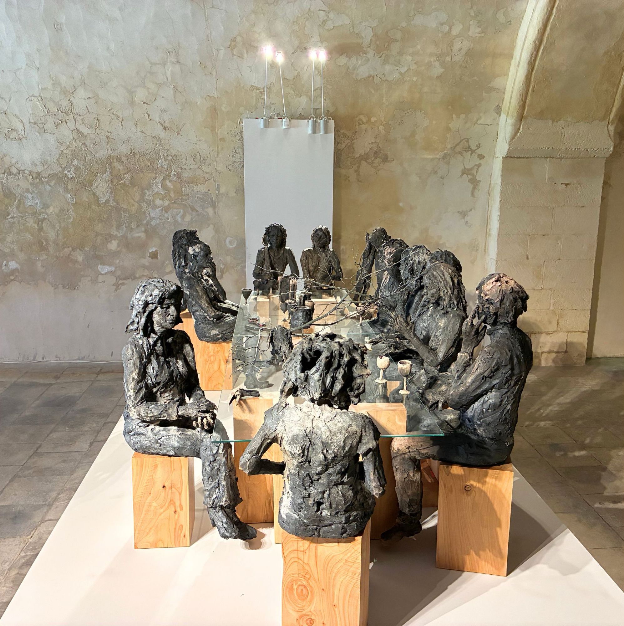 La table des Dames est une installation de l’artiste contemporain Cécile Raynal qui rassemble des portraits de femmes issues de l’entourage de l’artiste, des amies ou des personnes qu’elle a invitées à poser pour mieux les connaître. Ces portraits sont rassemblés autour d’une table, sorte de banquet au féminin qui peut évoquer La Cène. Les figures adoptent des postures variées : certaines échangent, d’autres écoutent, tandis que quelques-unes semblent plongées dans leurs pensées. A cette scène sont associés diverses sculptures d’animaux et d’objets qui témoignent toujours des associations faites par l’artiste avec ses propres références : mythes, fables, images qui resonnent différemment selon chaque spectateur. Une figure apparaît plus lointaine, en spectateur. Loin d’être un récit figé, l’œuvre invite chacun à composer sa propre narration, à associer librement les personnages et les symboles qui s’offrent à lui.