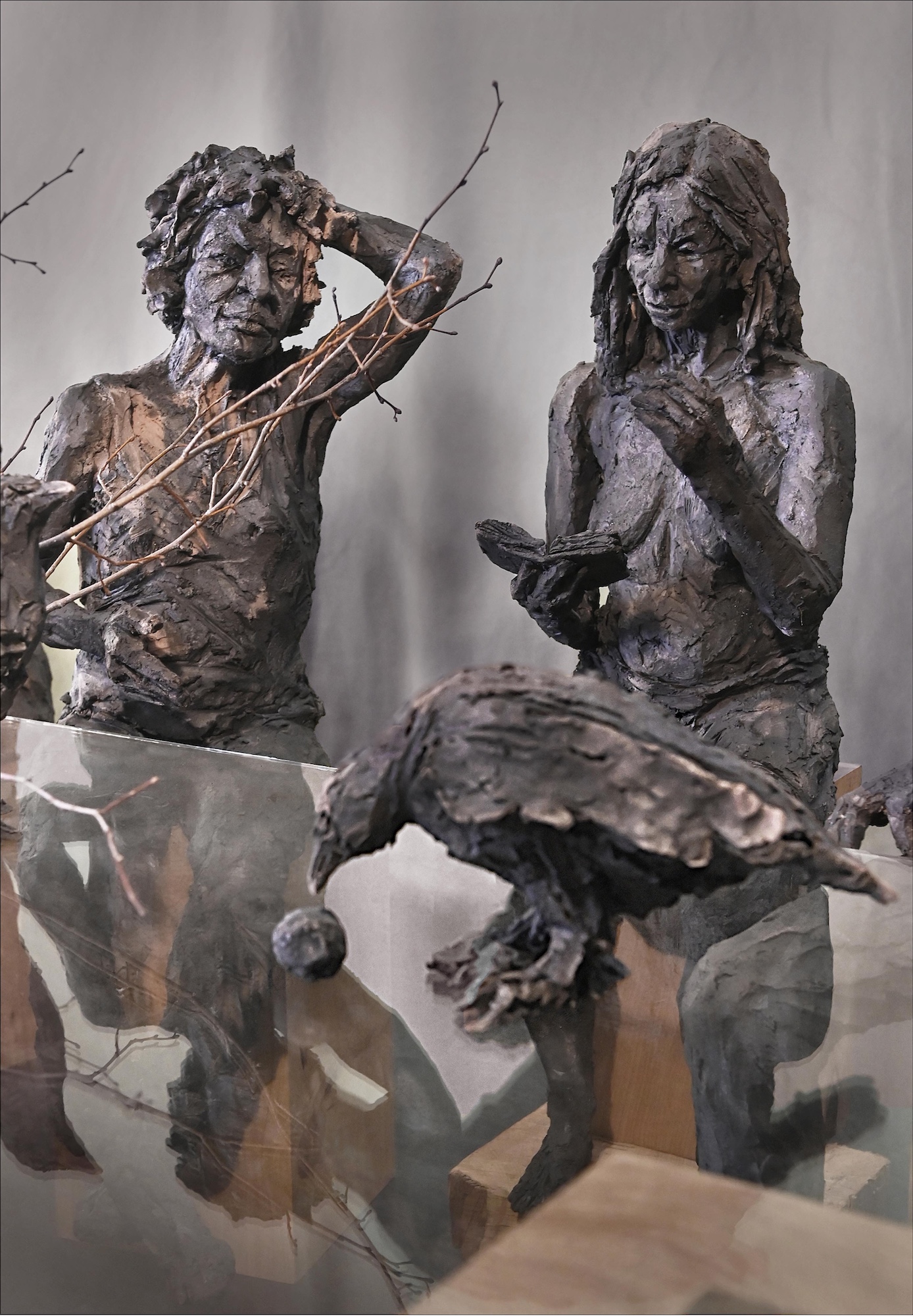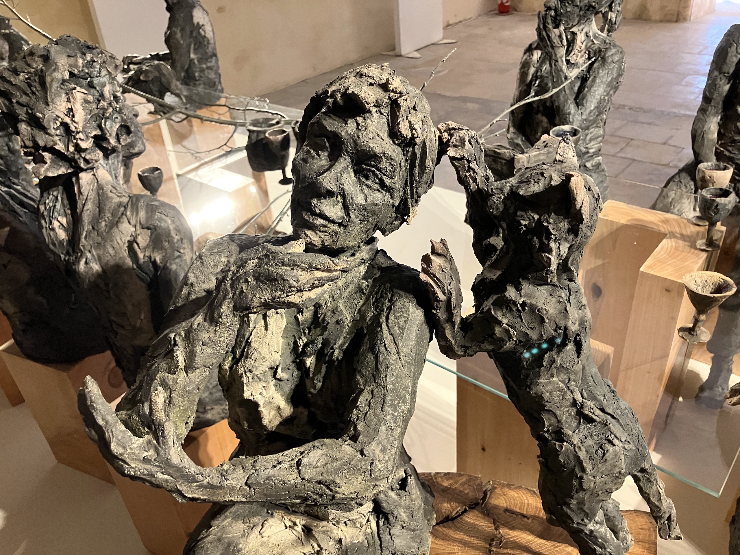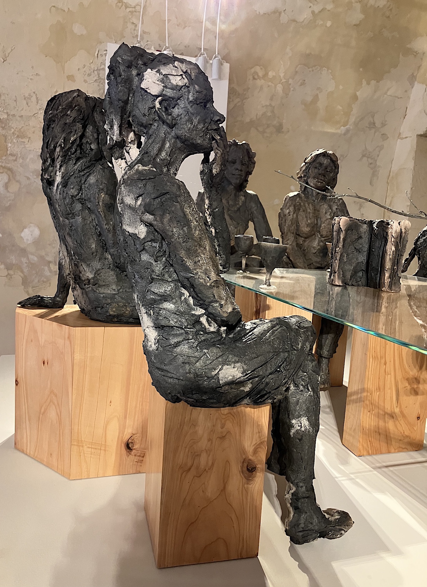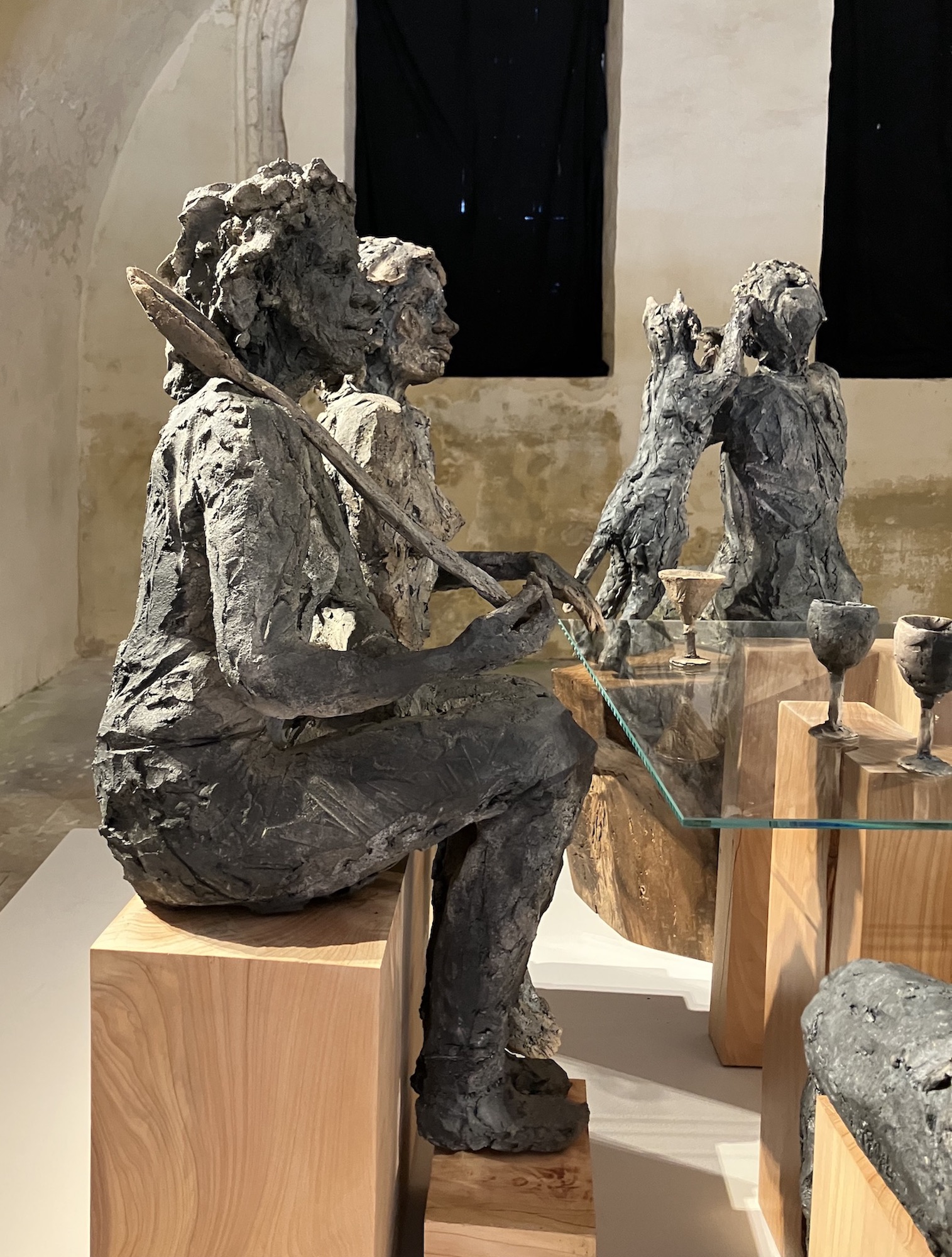 | Description | Grès enfumé, verre, bronze, pigments, bois de cyprès |