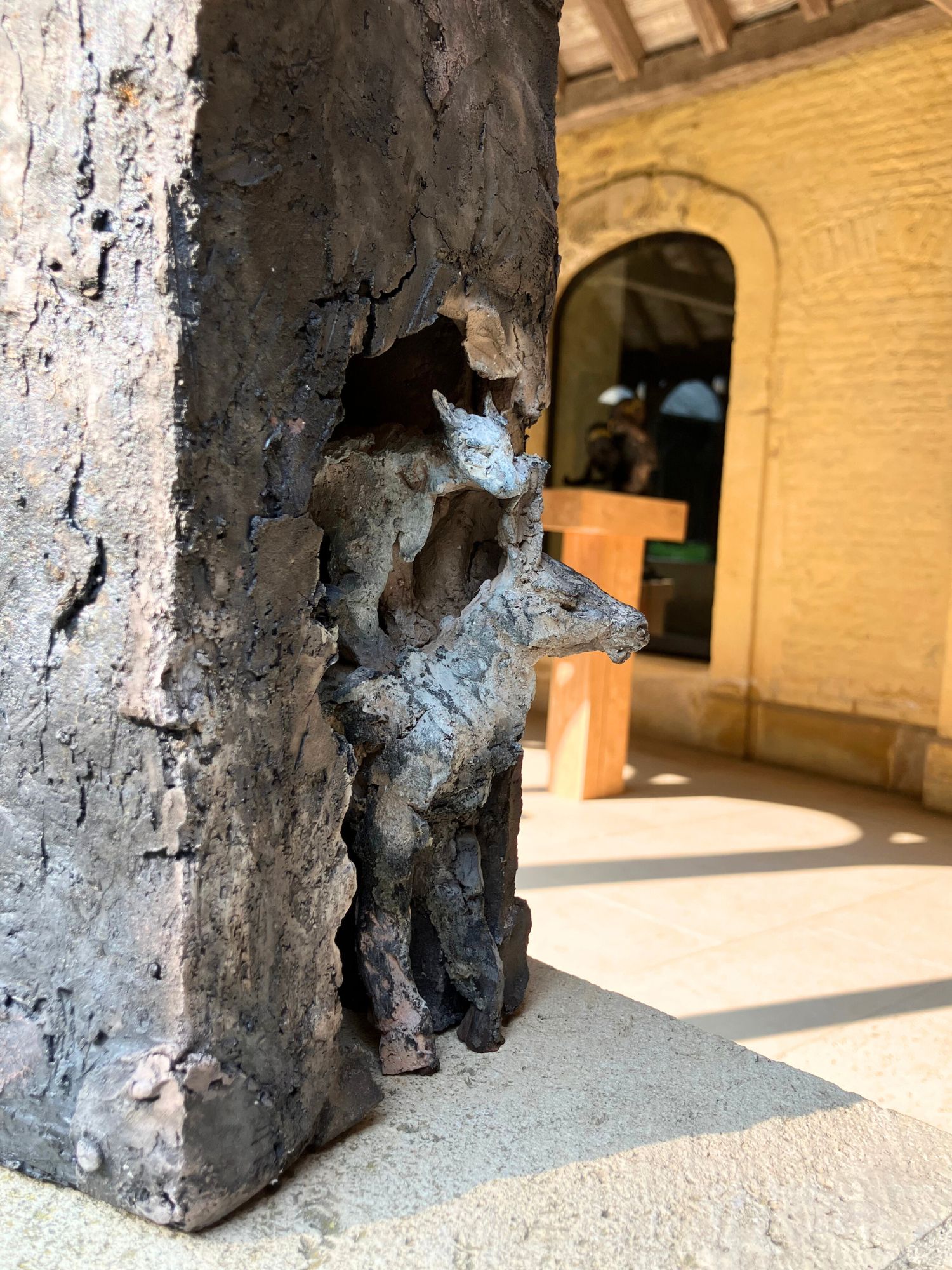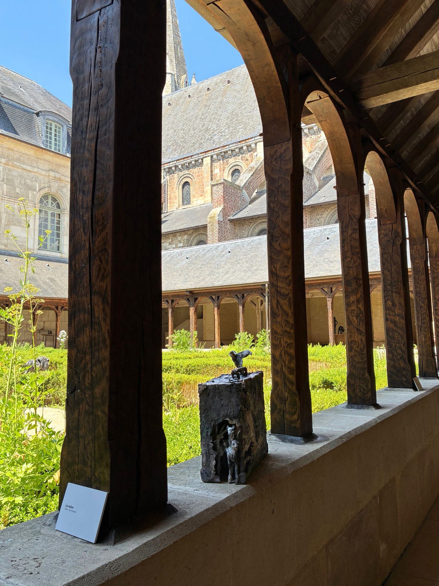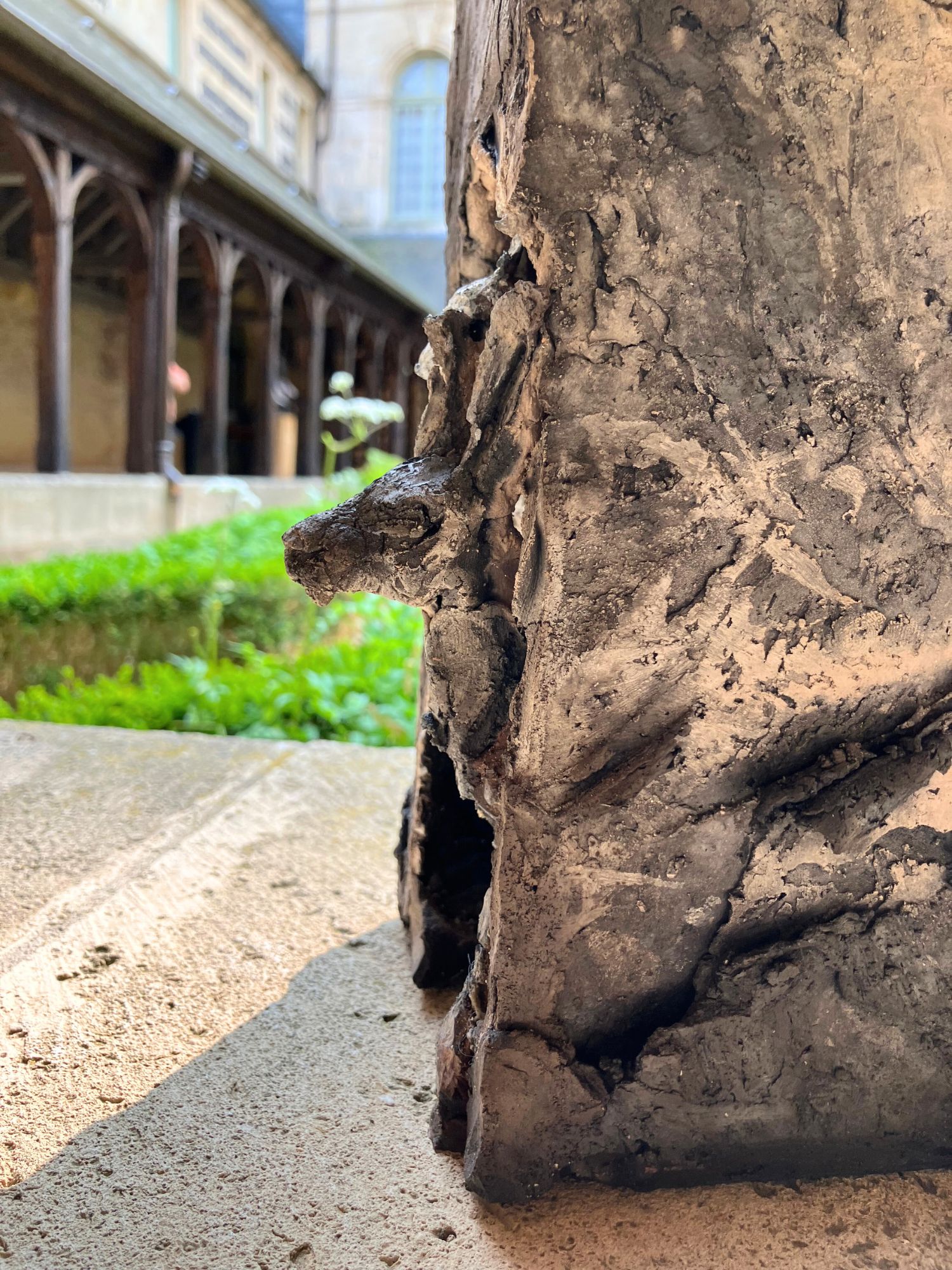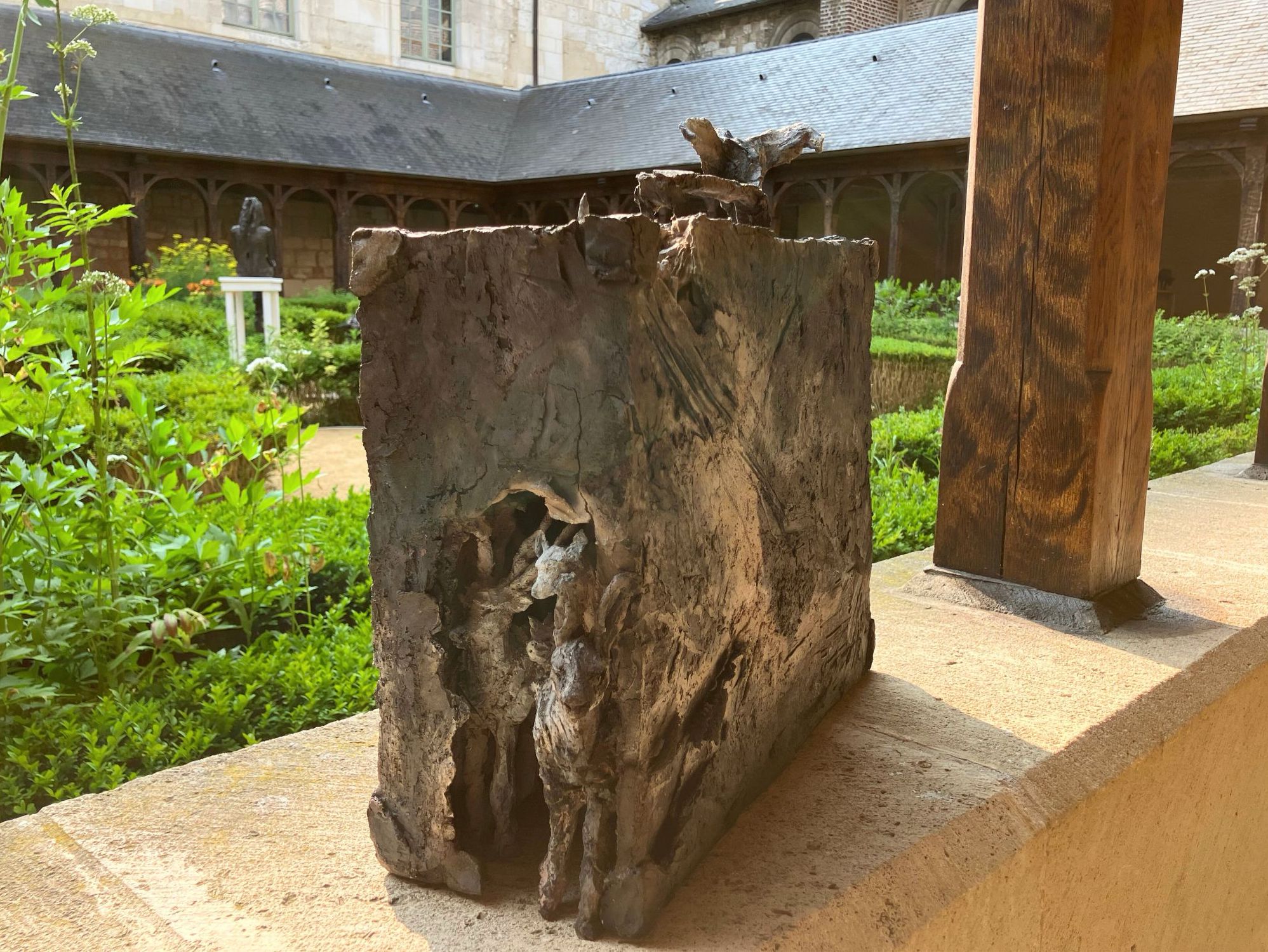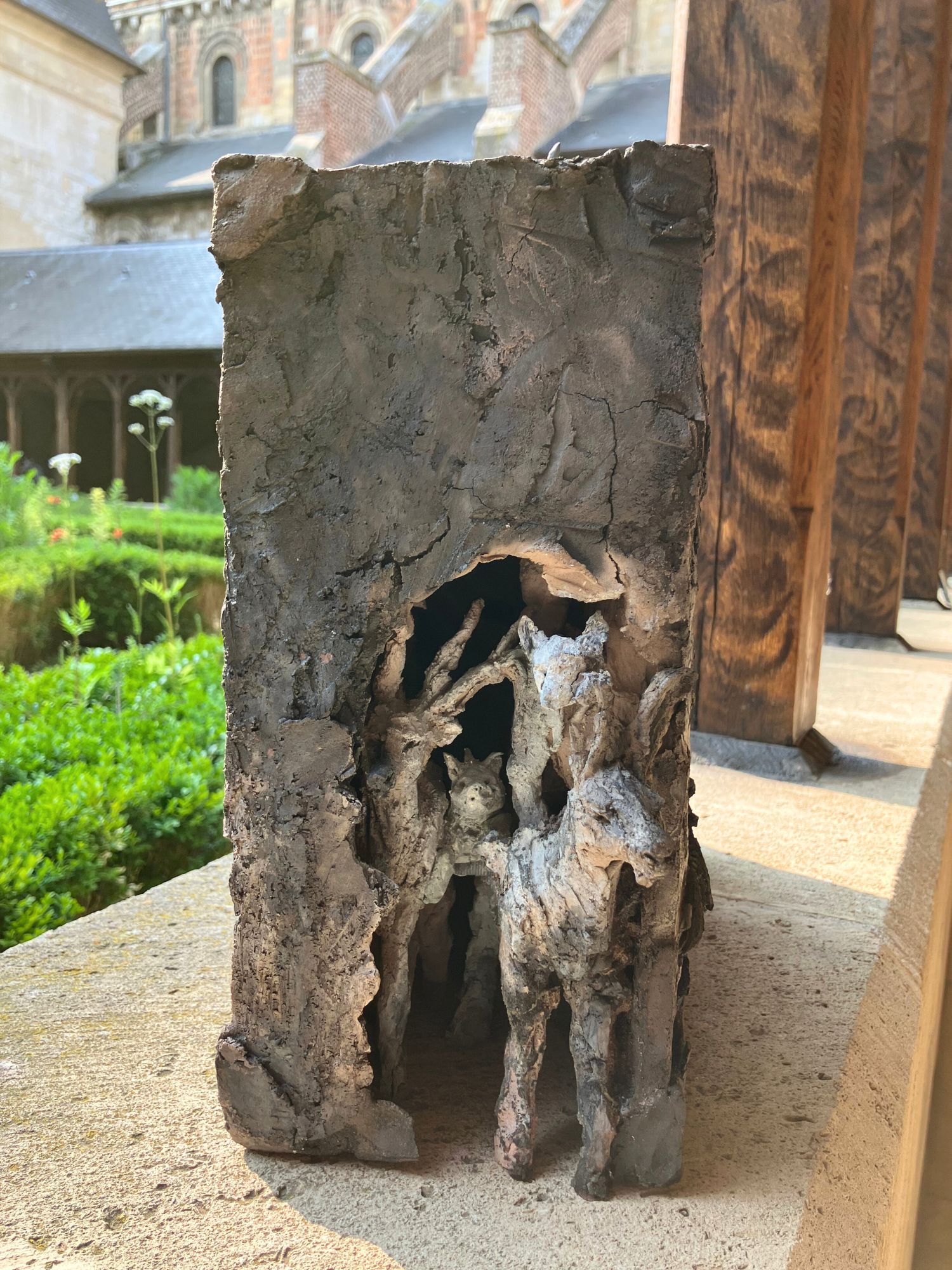 Cette sculpture a été exposée à l’exposition personnelle de Cécile Raynal, À la table des Dames, à l’Abbaye de Montivilliers, en Normandie (2025). Dans ce lieu historique où vécurent il y a longtemps femmes, sœurs et abbesses, la sculptrice a choisi de présenter des œuvres réunissant portraits de femmes et de bêtes. Les sculptures de Cécile Raynal ne cherchent pas à séduire, elles peuvent même parfois paraître inquiétantes. Rugueuses, elles portent en elles les traces d’un passage par la matière, par l’épreuve, et pourtant elles se dressent, debout, vivantes. Elles convoquent un monde où la part animale, féminine, instinctive ou rebelle est assumée comme une force essentielle. Dans les espaces restaurés de l’Abbaye, l’exposition retrace les quinze dernières années du parcours singulier de l’artiste française (plus d’informations sur cette exposition ici).