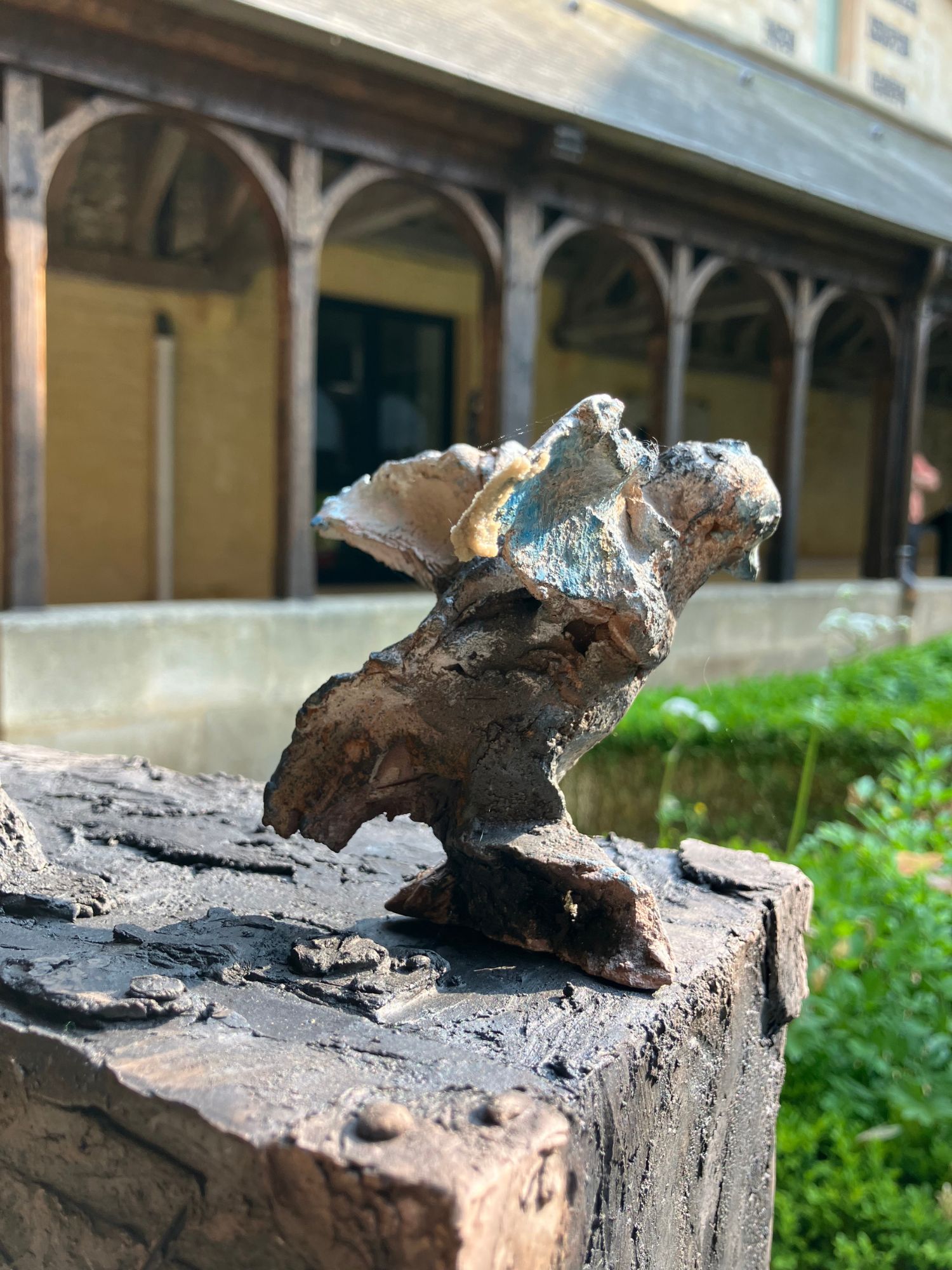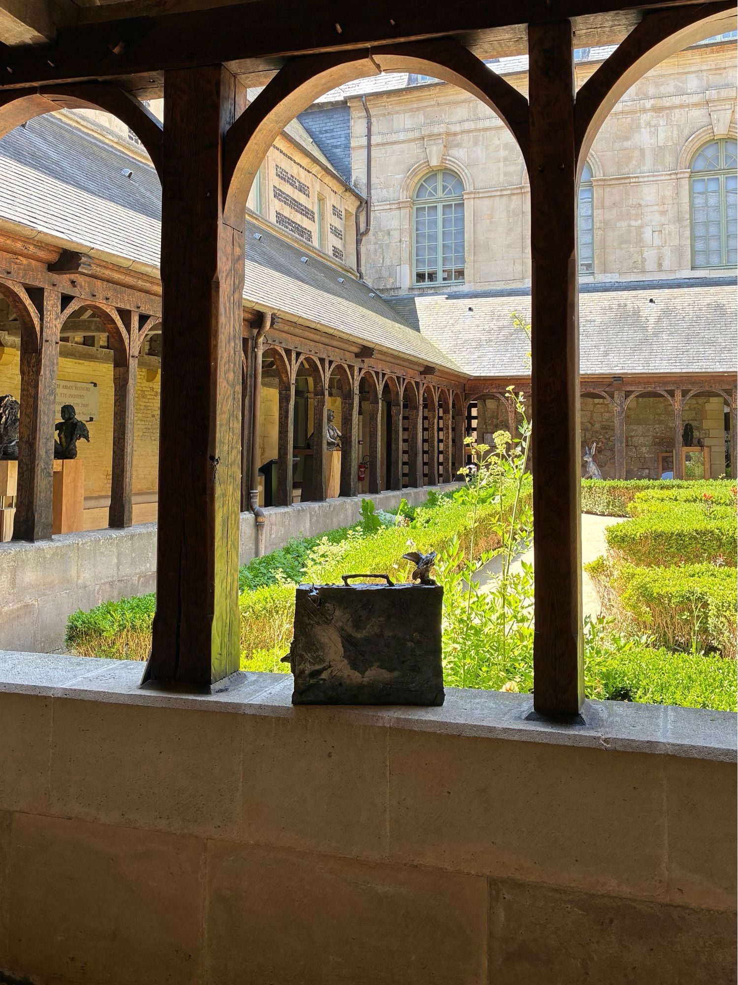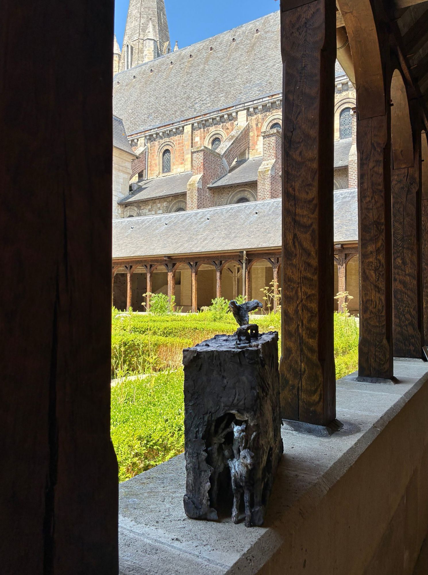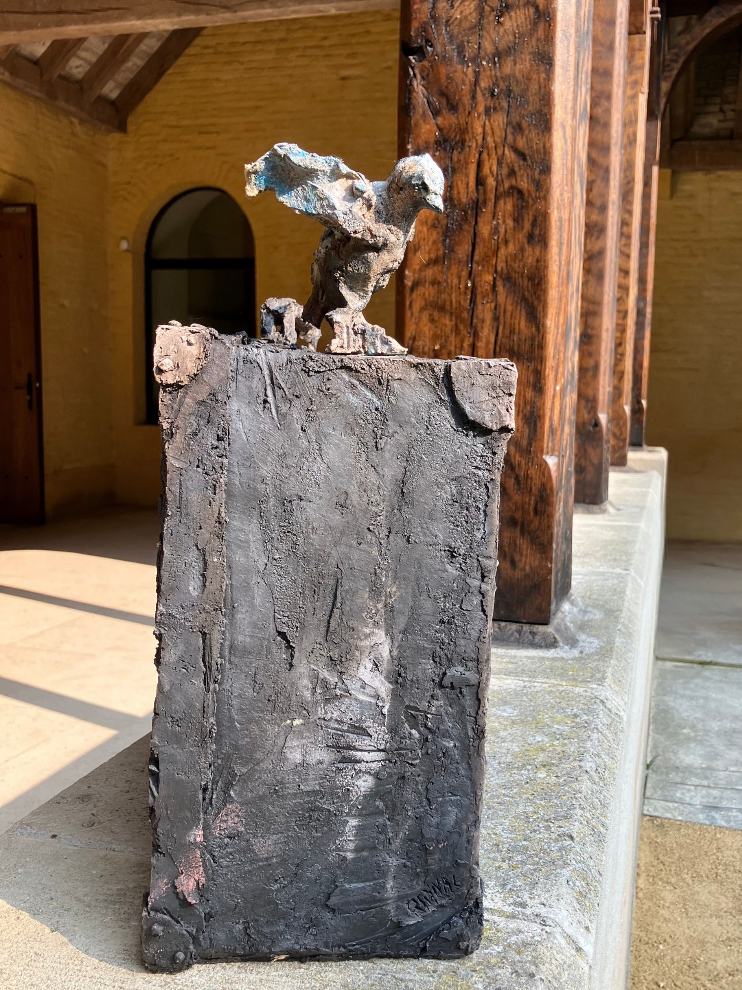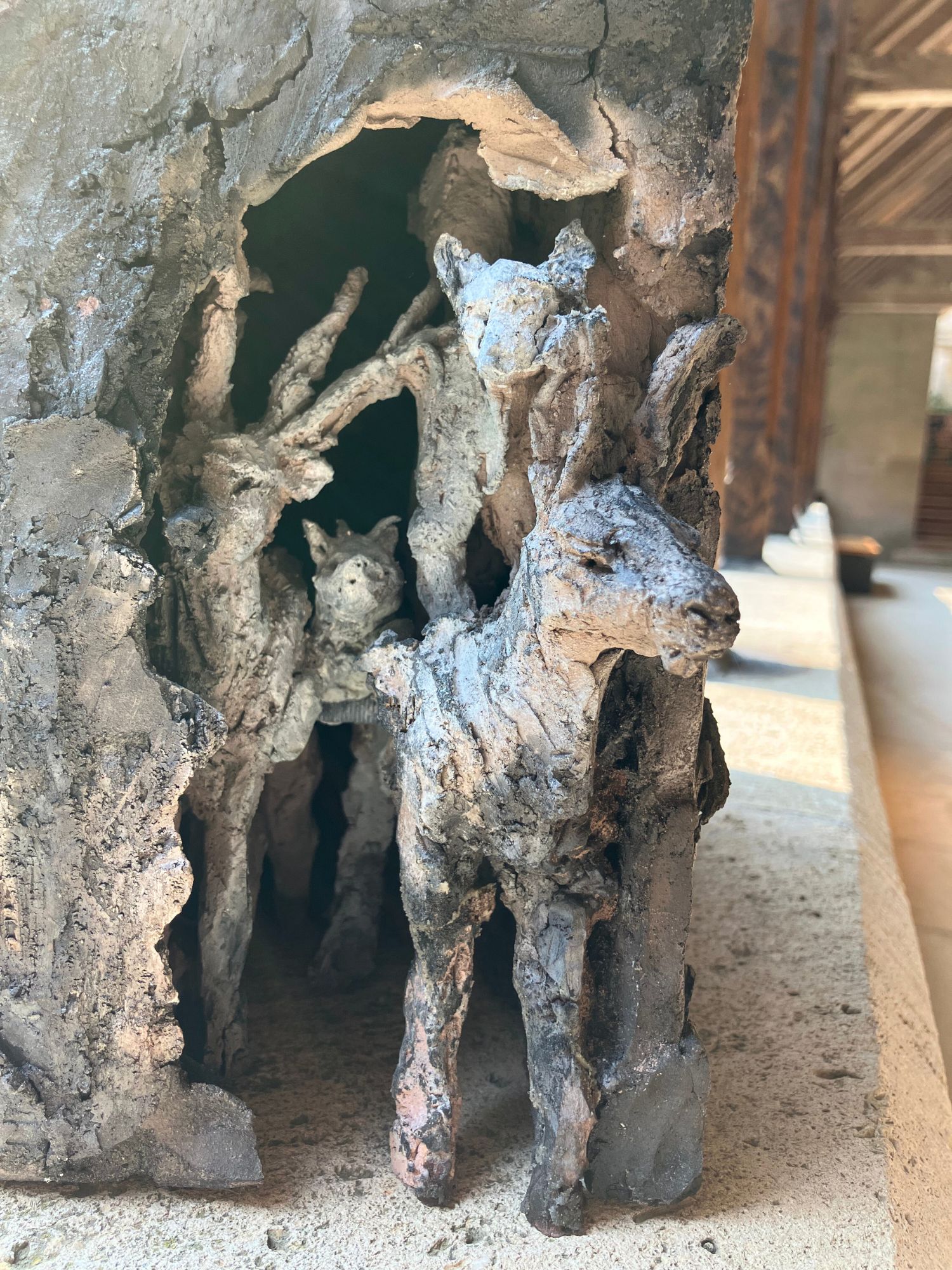 Cette sculpture a été exposée à l’exposition personnelle de Cécile Raynal, À la table des Dames, à l’Abbaye de Montivilliers, en Normandie (2025). Dans ce lieu historique où vécurent il y a longtemps femmes, sœurs et abbesses, la sculptrice a choisi de présenter des œuvres réunissant portraits de femmes et de bêtes. Les sculptures de Cécile Raynal ne cherchent pas à séduire, elles peuvent même parfois paraître inquiétantes. Rugueuses, elles portent en elles les traces d’un passage par la matière, par l’épreuve, et pourtant elles se dressent, debout, vivantes. Elles convoquent un monde où la part animale, féminine, instinctive ou rebelle est assumée comme une force essentielle. Dans les espaces restaurés de l’Abbaye, l’exposition retrace les quinze dernières années du parcours singulier de l’artiste française (plus d’informations sur cette exposition ici).