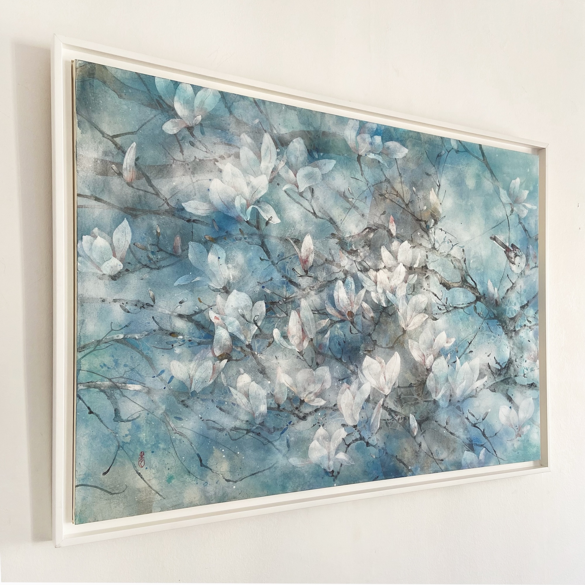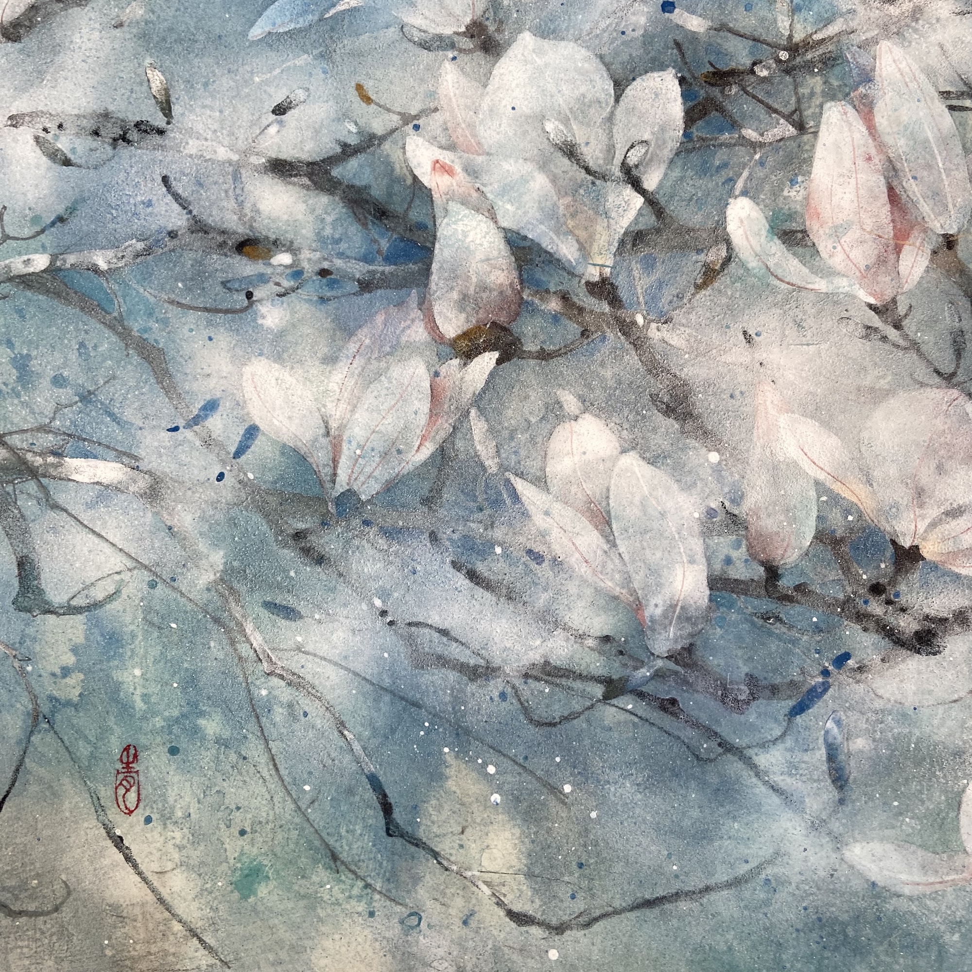 Chen Yiching est spécialiste du « nihon-ga », peinture traditionnelle japonaise, qui signifie littéralement peinture (ga) japonaise (nihon). Cette technique, très exigeante, consiste à n’utiliser que des matériaux entièrement naturels (bois, papier, roche, sable, os) dans la réalisation d’une œuvre. Les pigments, obtenus grâce à des minéraux tels que l’azurite ou la malachite, sont broyés avec de la colle animale (nikawa) réalisée avec de la peau et des os d’animaux ou de poissons. Le papier est marouflé sur bois ou sur soie tendue. Le principe est celui d’une peinture à l’eau et l’espace est créé grâce au yohaku, ou zones vides.