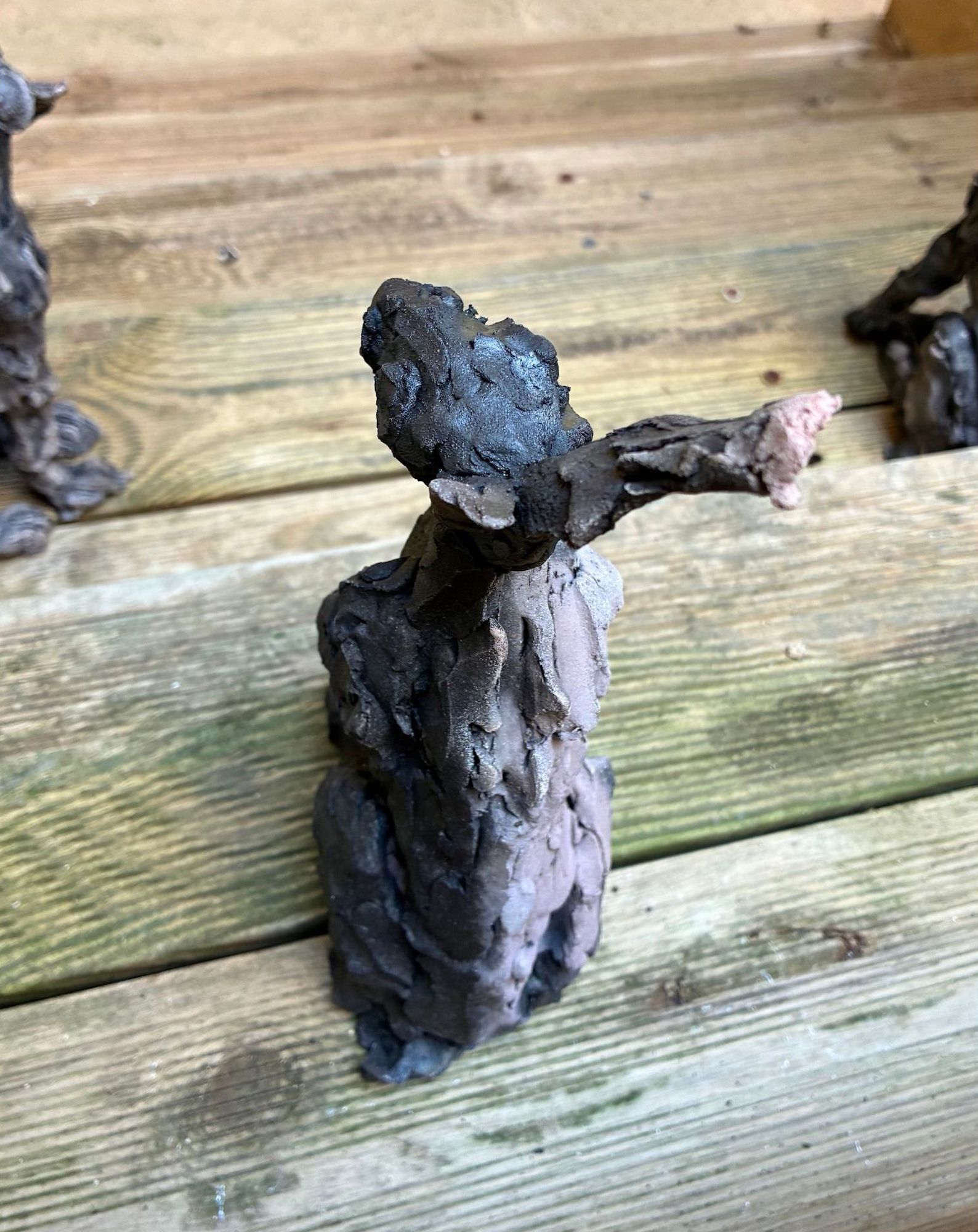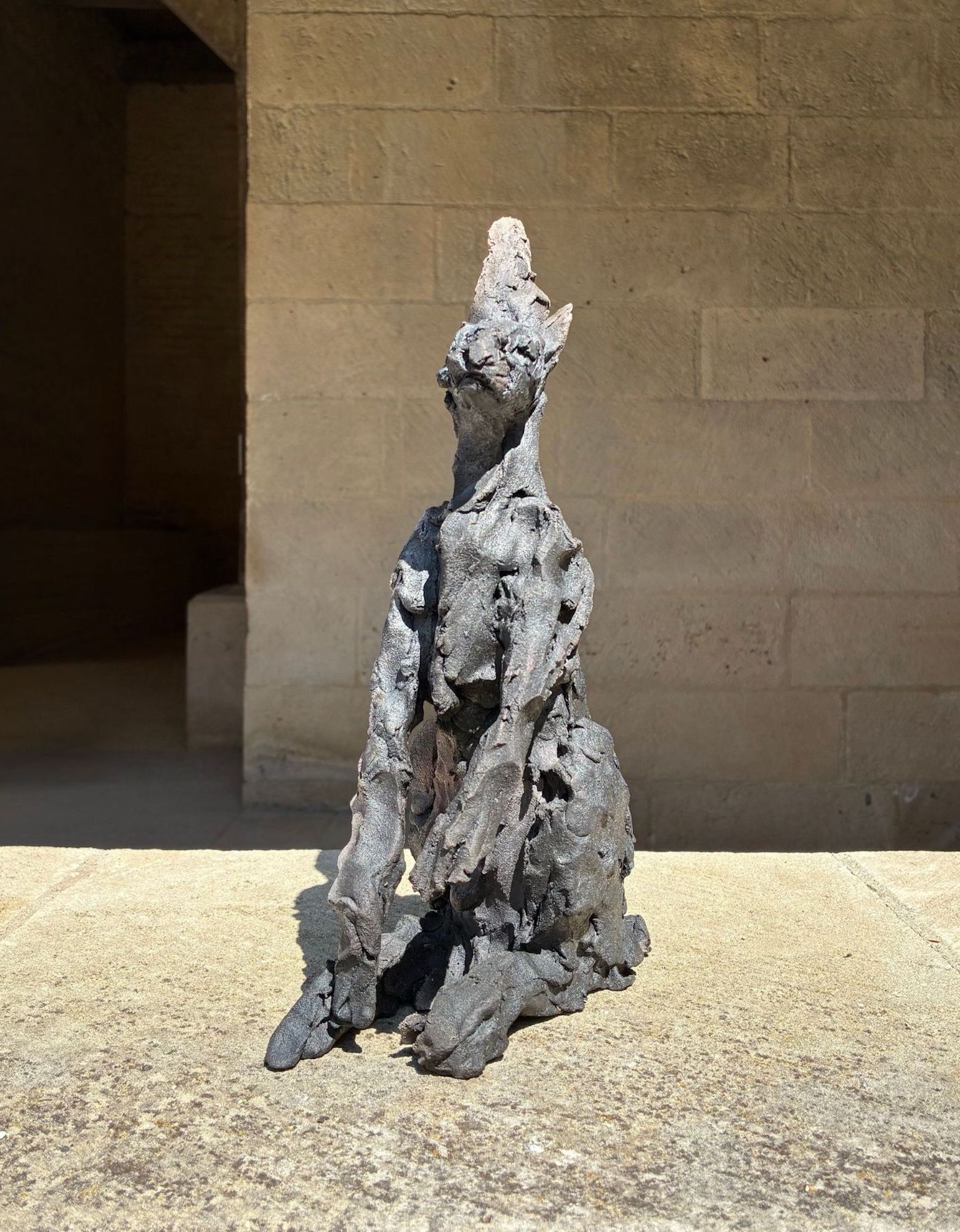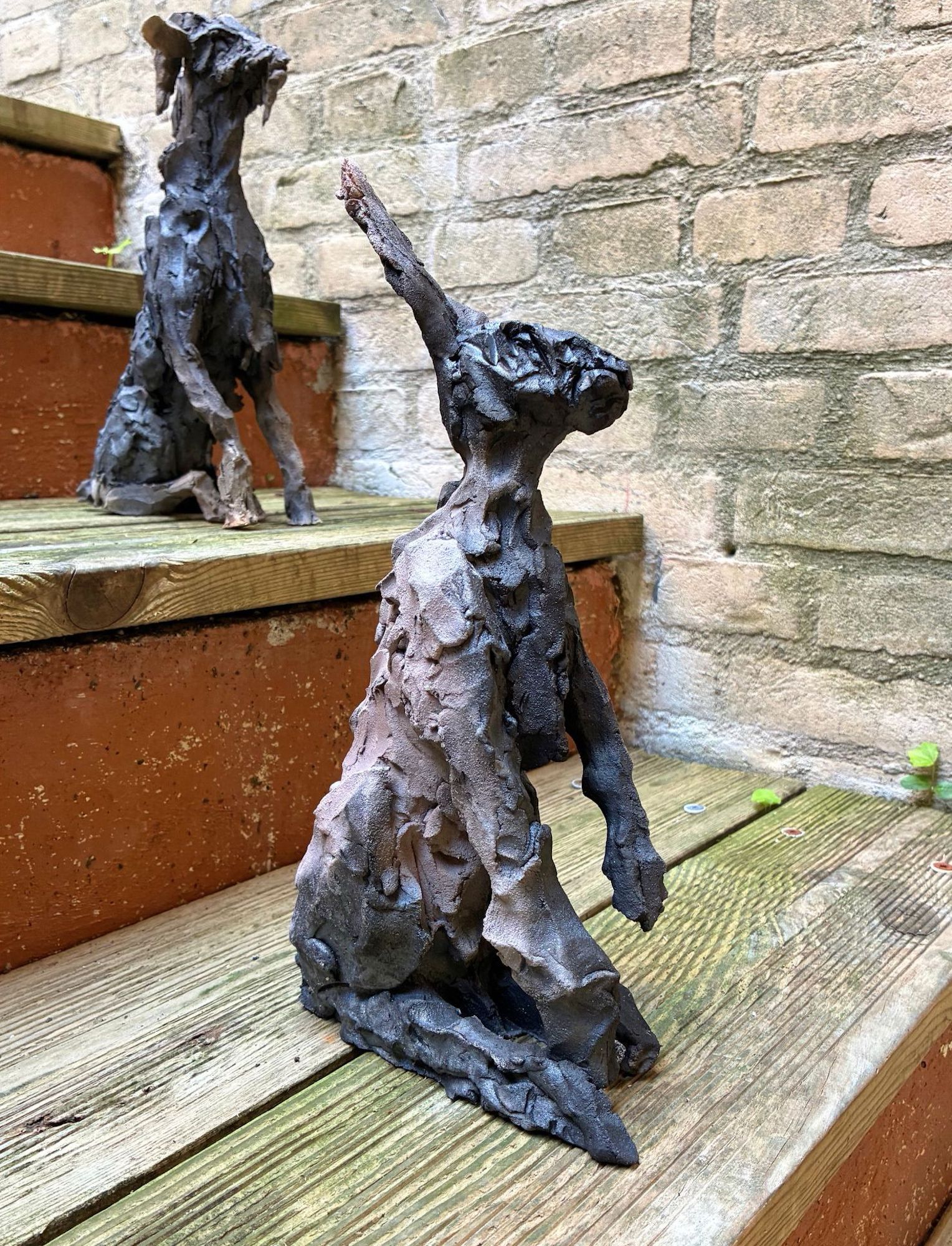 Les bêtes (liévre) est une sculpture en grès enfumé de l’artiste Française contemporaine Cécile Raynal. Cette sculpture représente un lièvre assis, droit avec une posture attentive.