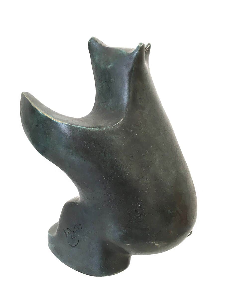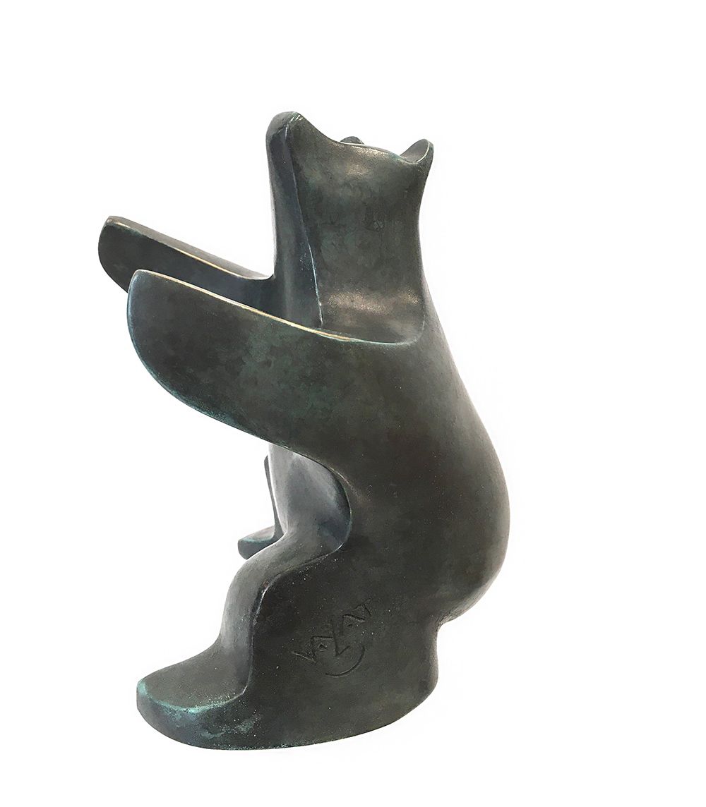 Tout droit sorti de l’enfance, l’ours apparaît dans le vocabulaire sculptural bestiaire d’Eric Valat. Après les Fauteuils Ours en polyester aux couleurs vives et dynamiques, Eric Valat poursuit son interprétation de la représentation de l’ours avec cette sculpture en bronze petit format. L’artiste souhaite ici réinventer la représentation traditionnelle de l’ours : l’animal tend les bras vers l’avant, comme s’il voulait enlacer quelqu’un ou quelque chose. La sculpture montre une élaboration des formes de l’animal qui tende vers l’épuration et l’harmonie. La patine aux tonalités marbrées vertes lui confère élégance et légèreté.