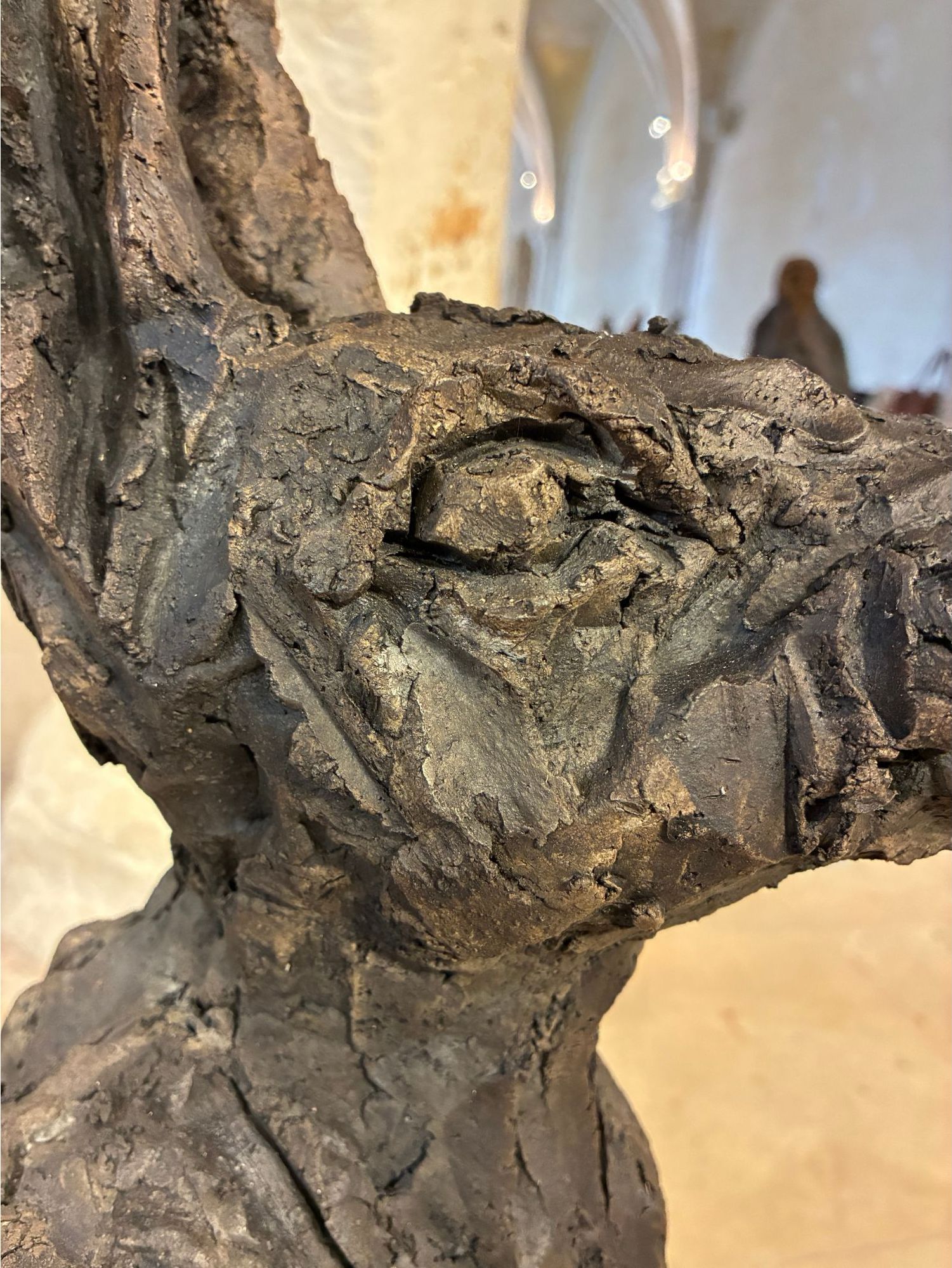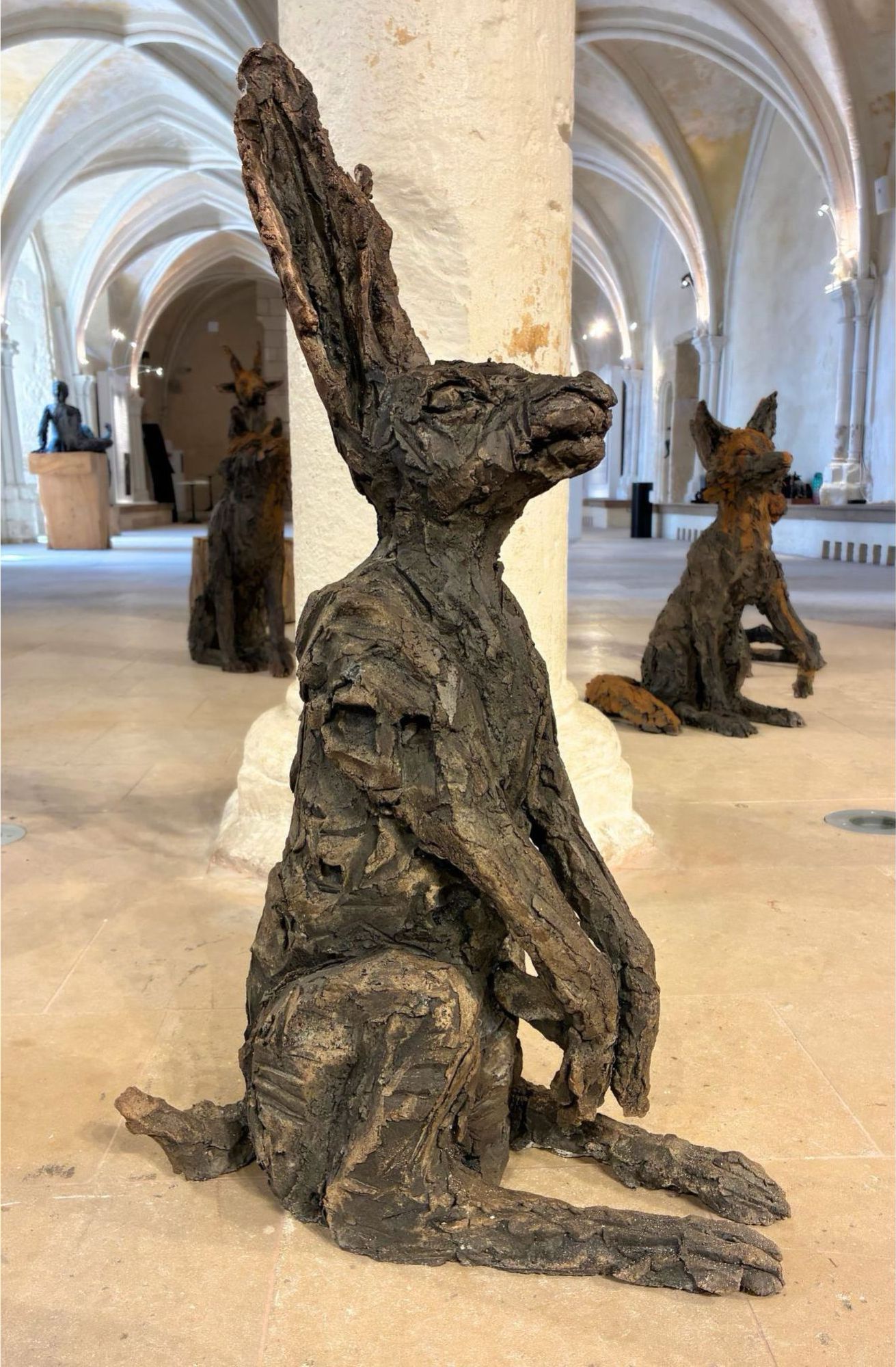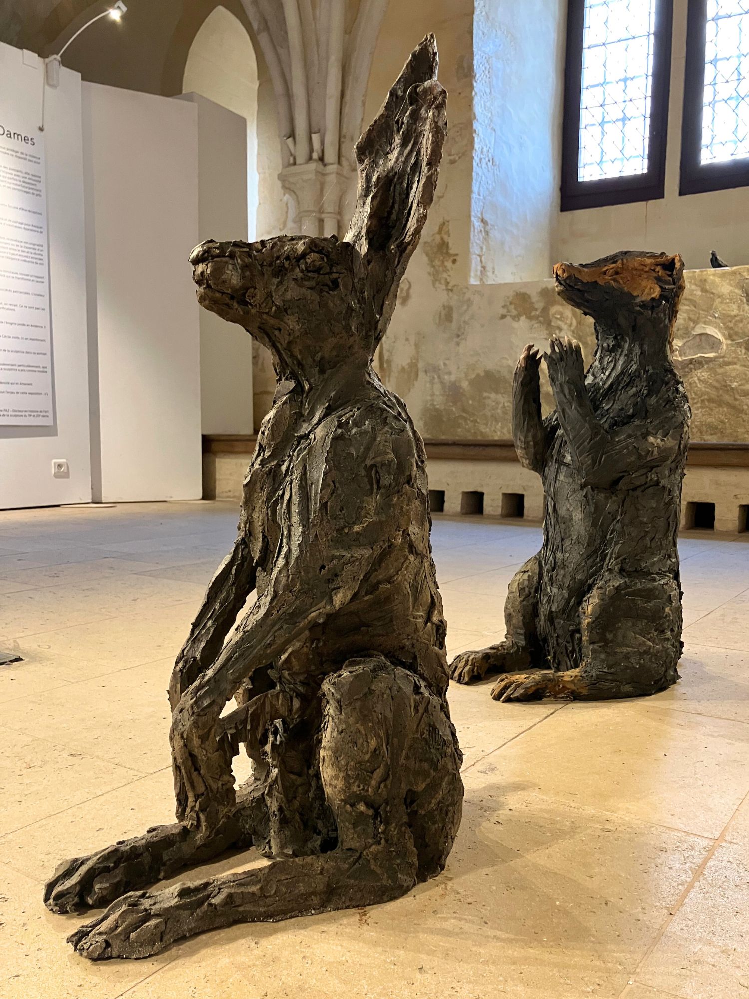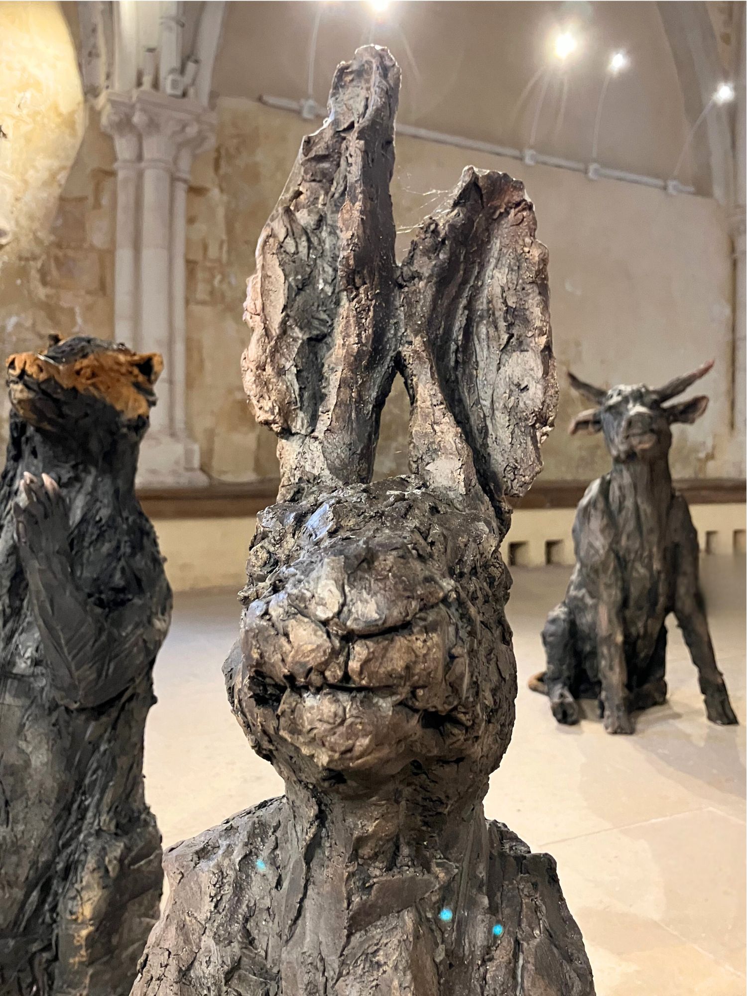 L’installation Chœur de bêtes, à laquelle l’artiste travaille depuis plusieurs années, a été exposée à l’exposition personnelle de Cécile Raynal, À la table des Dames, à l’Abbaye de Montivilliers, en Normandie (2025). Dans ce lieu historique où vécurent il y a longtemps femmes, sœurs et abbesses, la sculptrice a choisi de présenter des œuvres réunissant portraits de femmes et de bêtes. Les sculptures de Cécile Raynal ne cherchent pas à séduire, elles peuvent même parfois paraître inquiétantes. Rugueuses, elles portent en elles les traces d’un passage par la matière, par l’épreuve, et pourtant elles se dressent, debout, vivantes. Elles convoquent un monde où la part animale, féminine, instinctive ou rebelle est assumée comme une force essentielle. Dans les espaces restaurés de l’Abbaye, l’exposition retrace les quinze dernières années du parcours singulier de l’artiste française (plus d’informations sur cette exposition ici).