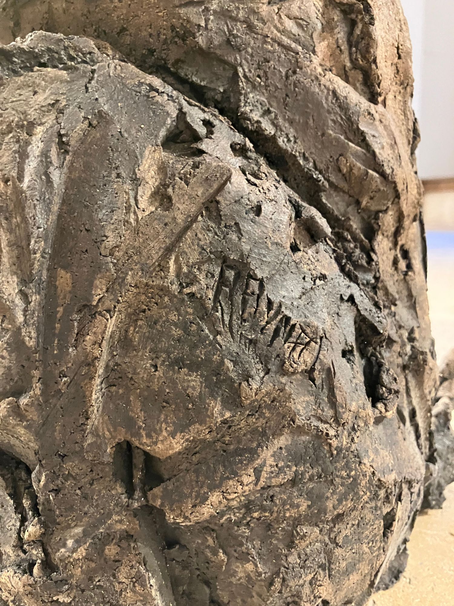 Description: Grès enfumé, résine, plâtre, argile végétale