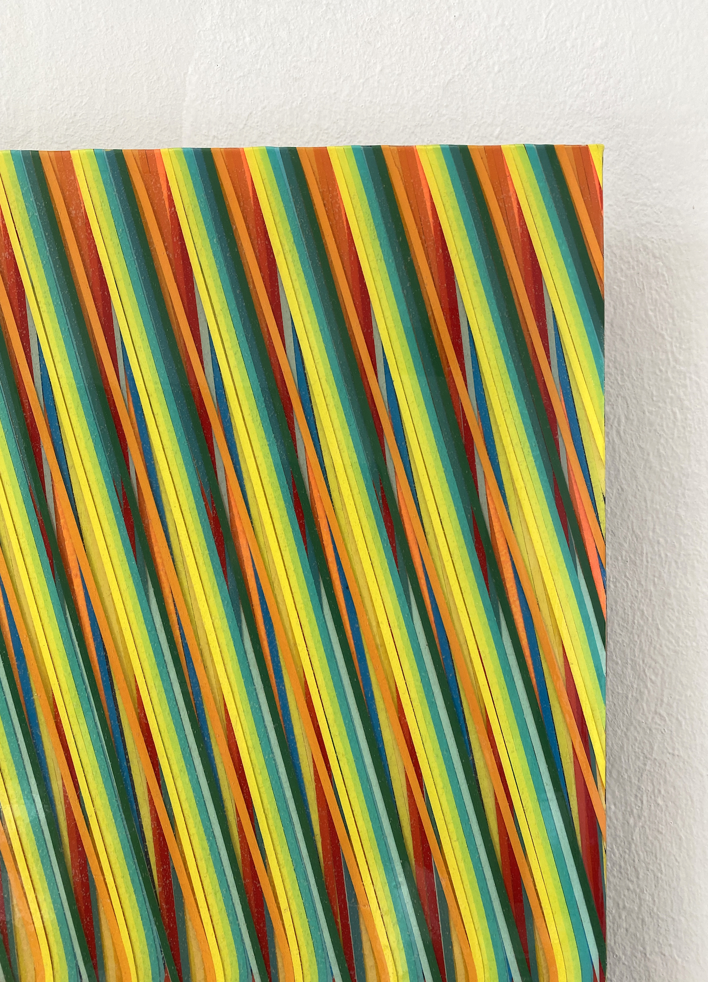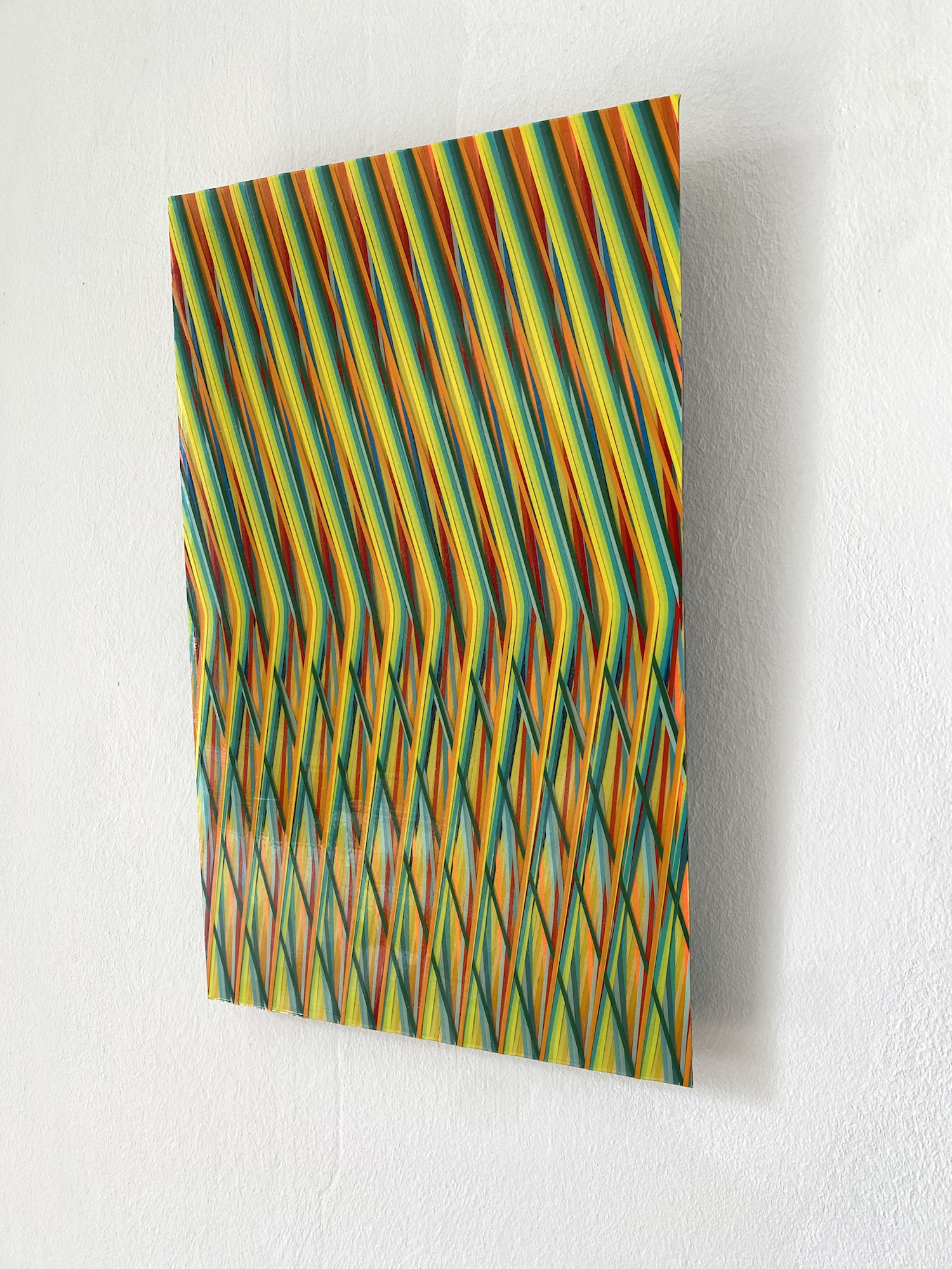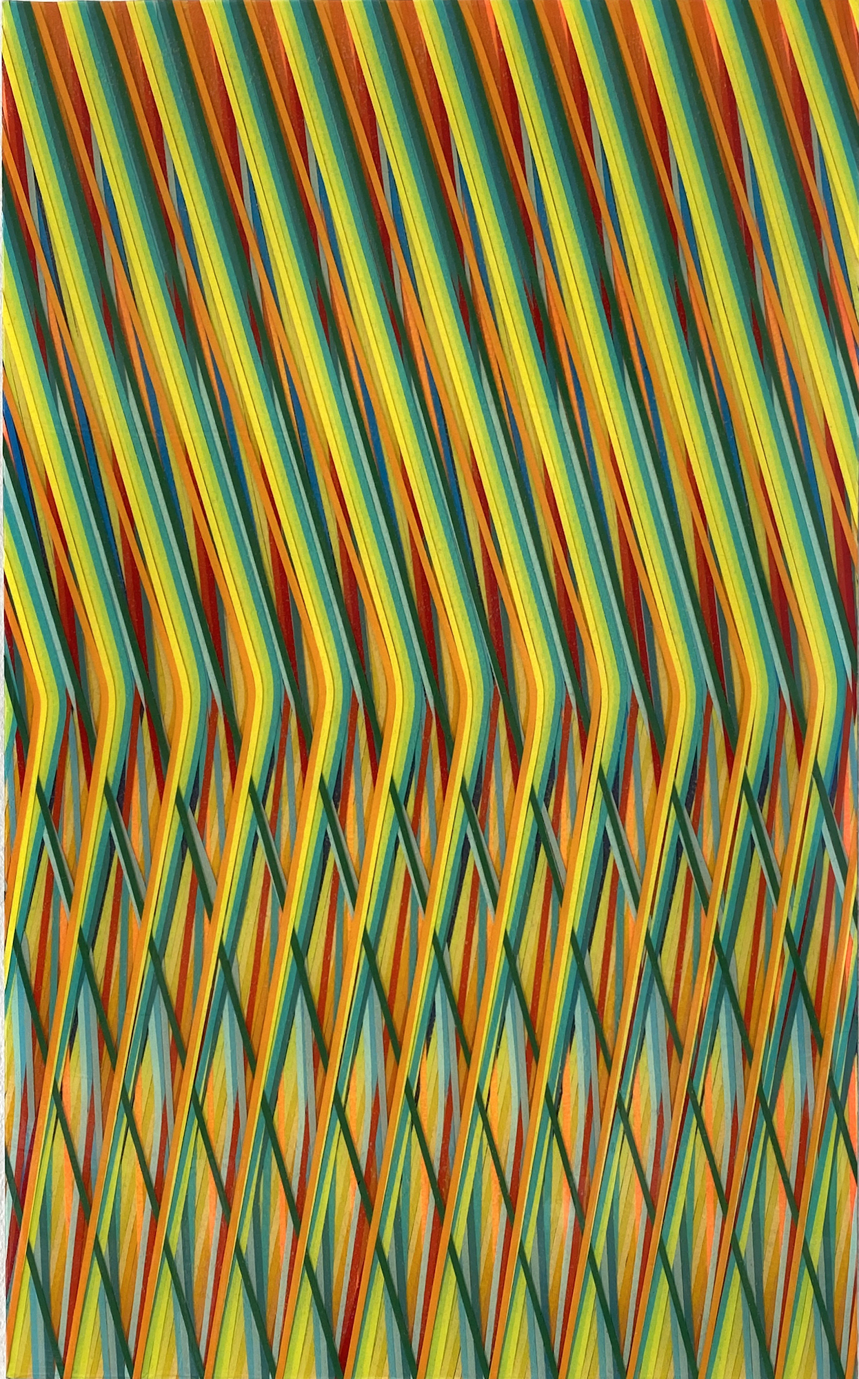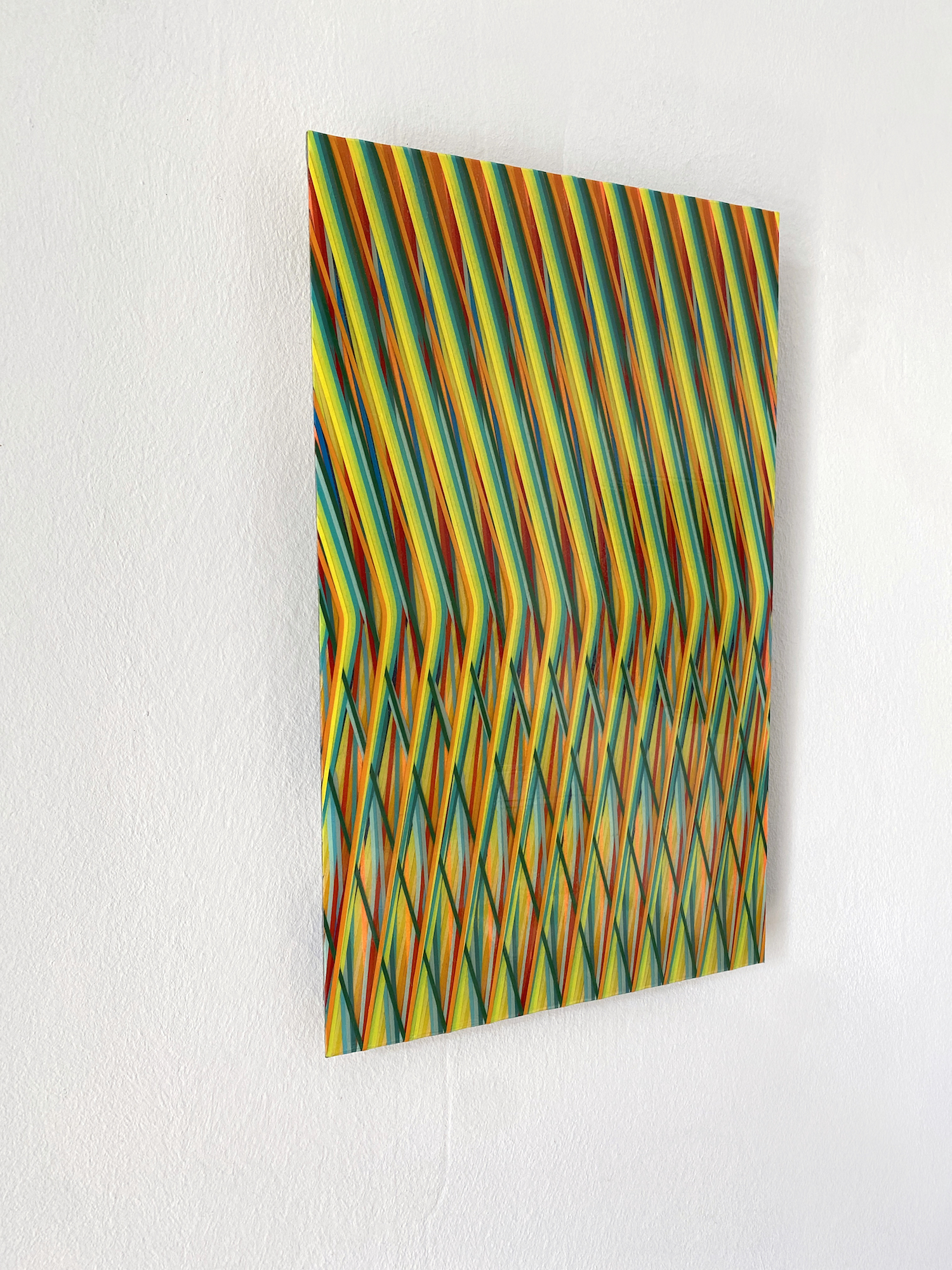 Cette œuvre, réalisée sur aluminium, est un tableau de peinture abstraite. Digne d’une illusion d’optique, cette peinture met au défi la vision du spectateur : les lignes verticales de couleurs vives s’entrecroisent et se superposent dans un mouvement descendant qui participe à partager le tableau en deux parties. Dans la partie supérieure, les couleurs s’alternent de manière régulière et ordonnée, puis les lignes se brisent, conservant tout de même leur régularité. Plusieurs impressions paradoxales émergent de cette œuvre picturale qui évolue selon les points de vue que l’on adopte pour la regarder, elle apparait tour à tour désordonnée ou rigoureuse, lisse ou texturée.