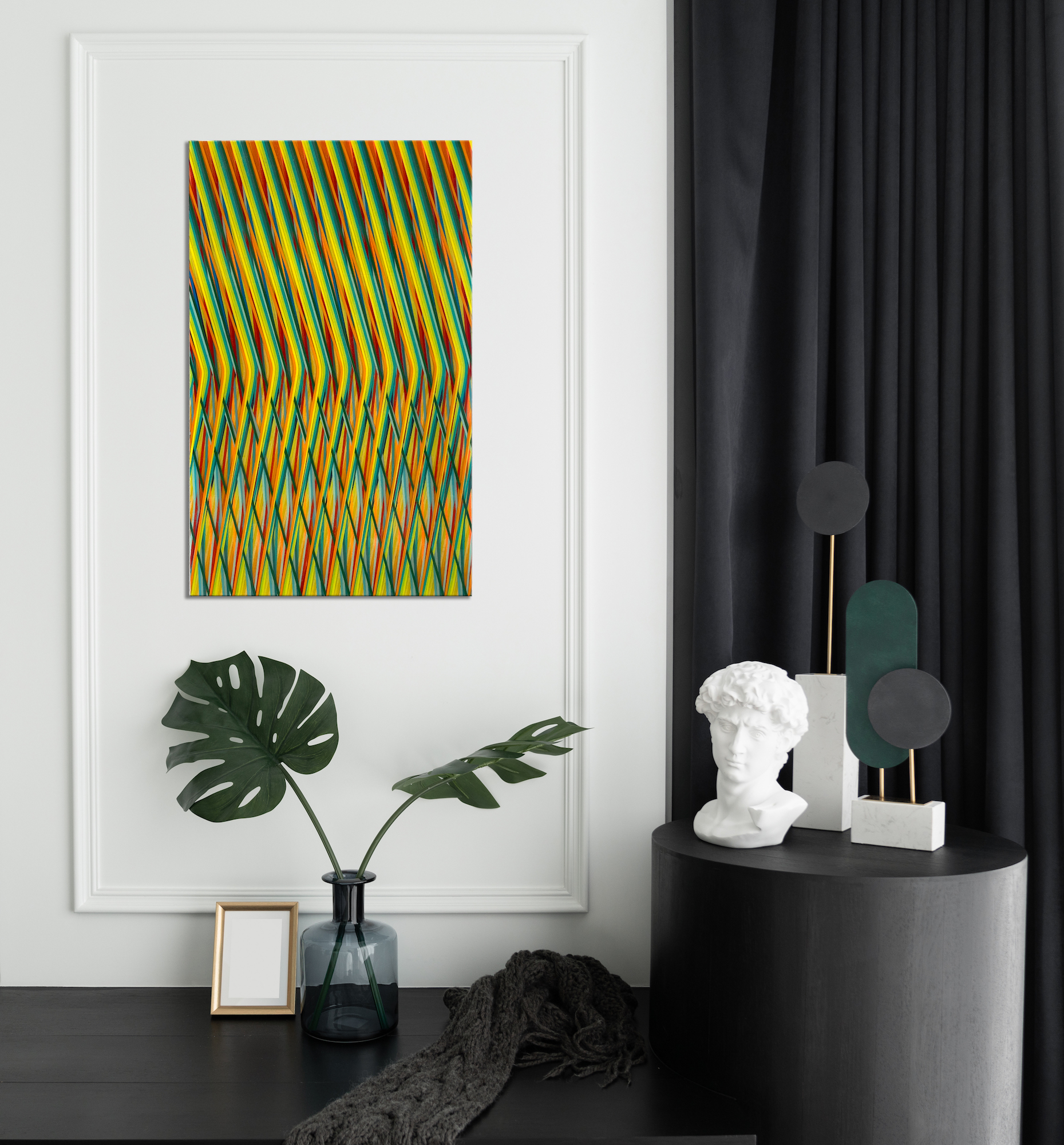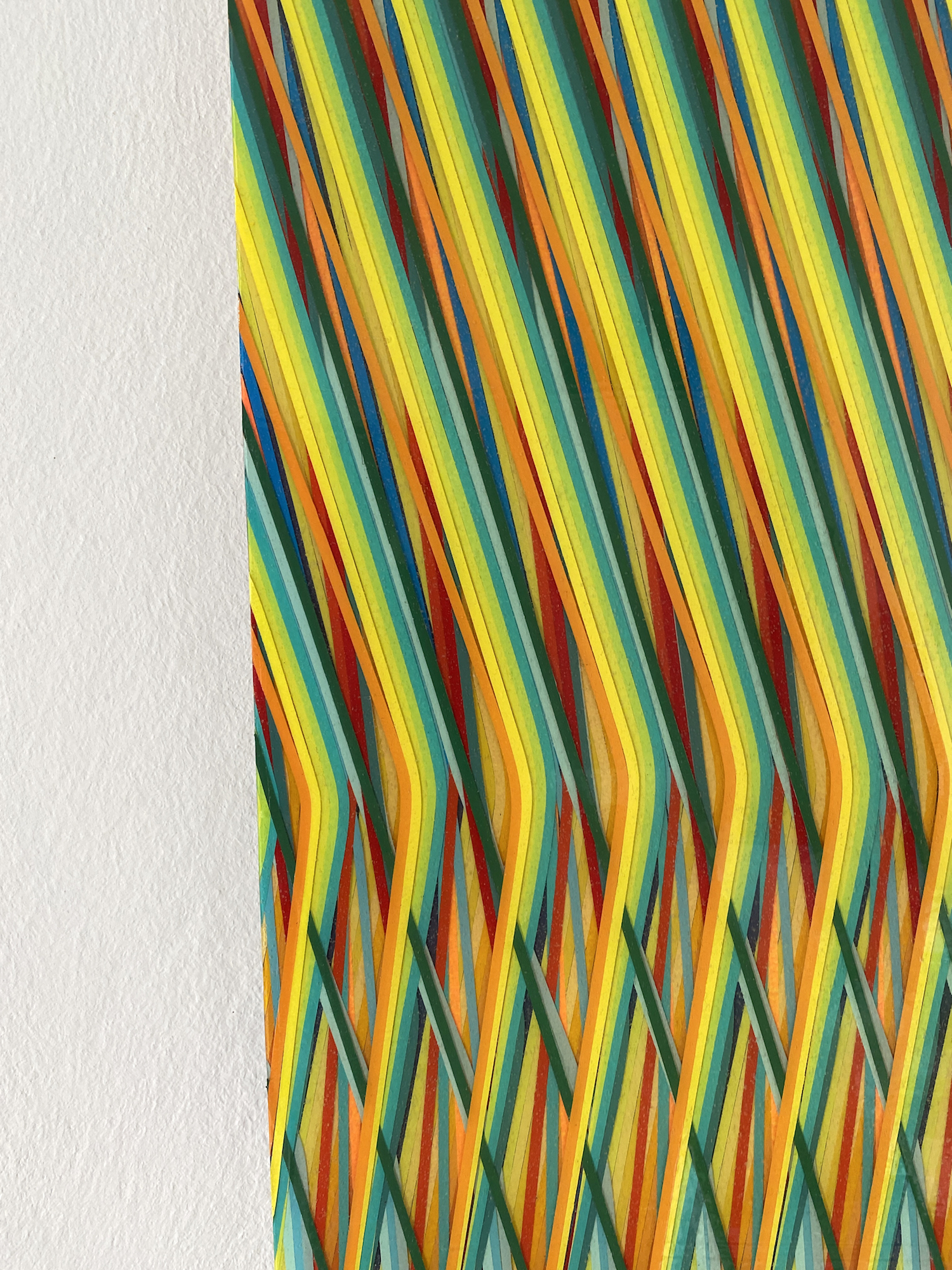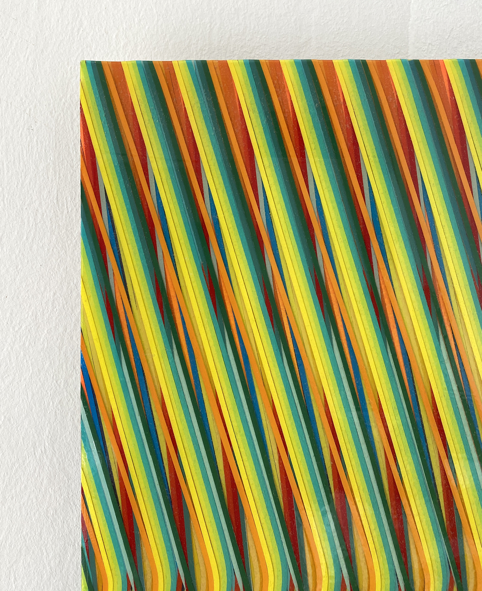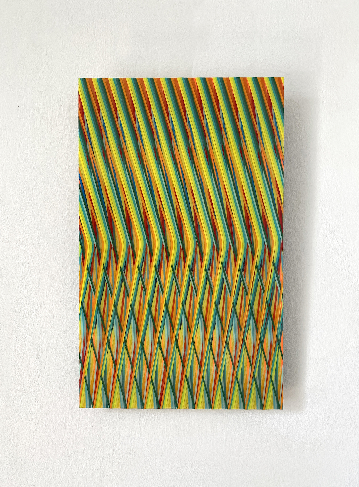 Cette œuvre, réalisée sur aluminium, est un tableau de peinture abstraite. Digne d’une illusion d’optique, cette peinture met au défi la vision du spectateur : les lignes verticales de couleurs vives s’entrecroisent et se superposent dans un mouvement descendant qui participe à partager le tableau en deux parties. Dans la partie supérieure, les couleurs s’alternent de manière régulière et ordonnée, puis les lignes se brisent, conservant tout de même leur régularité. Plusieurs impressions paradoxales émergent de cette œuvre picturale qui évolue selon les points de vue que l’on adopte pour la regarder, elle apparait tour à tour désordonnée ou rigoureuse, lisse ou texturée.