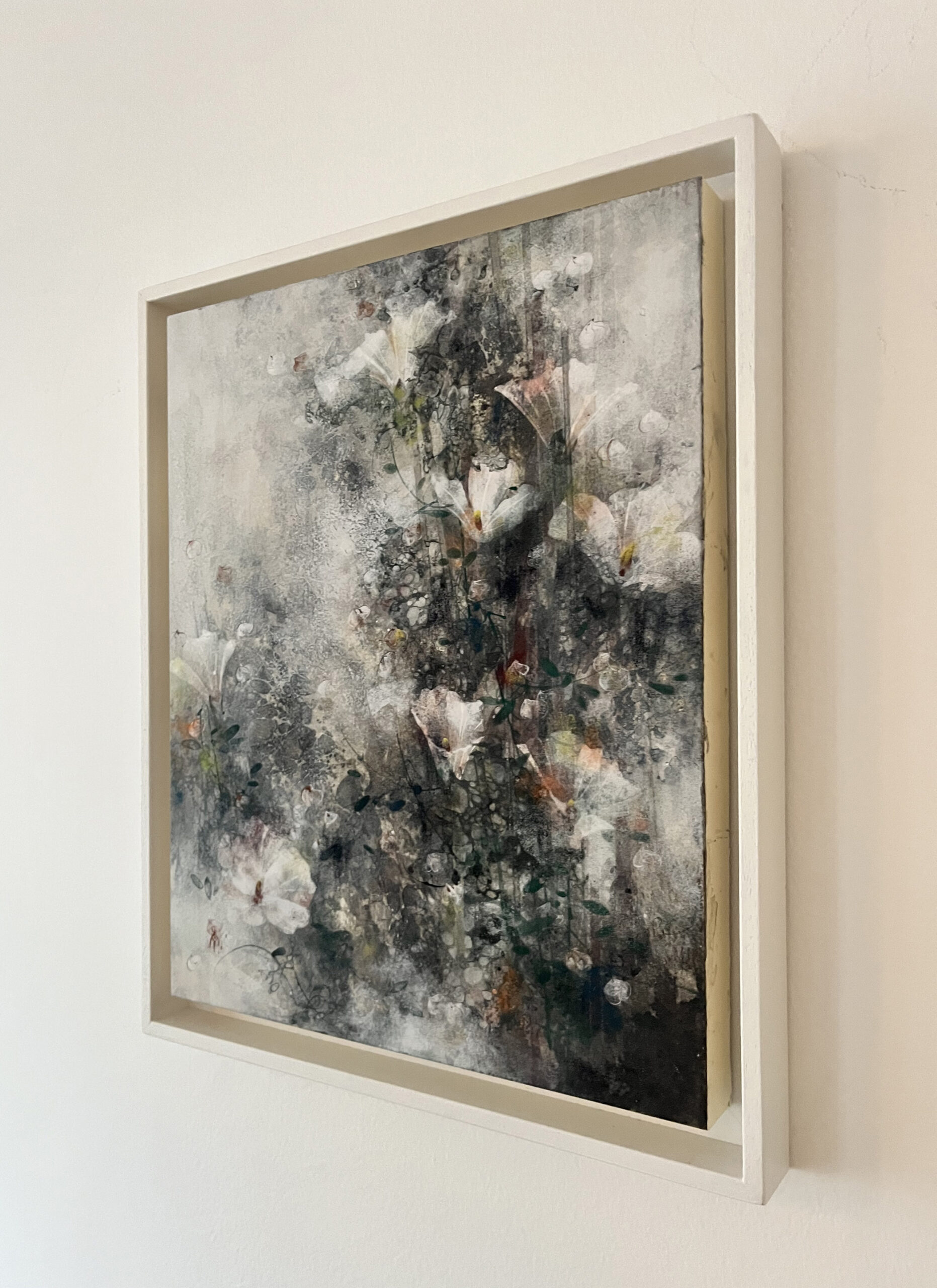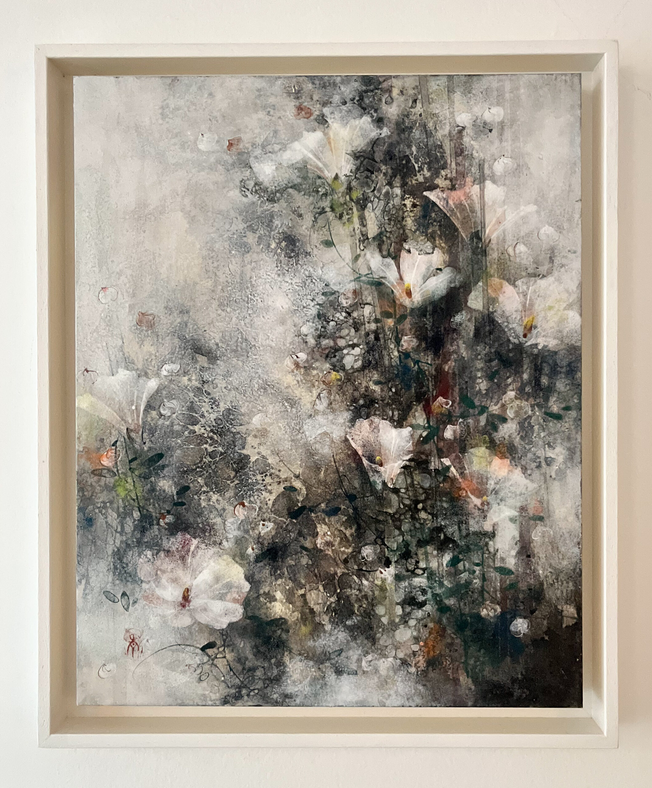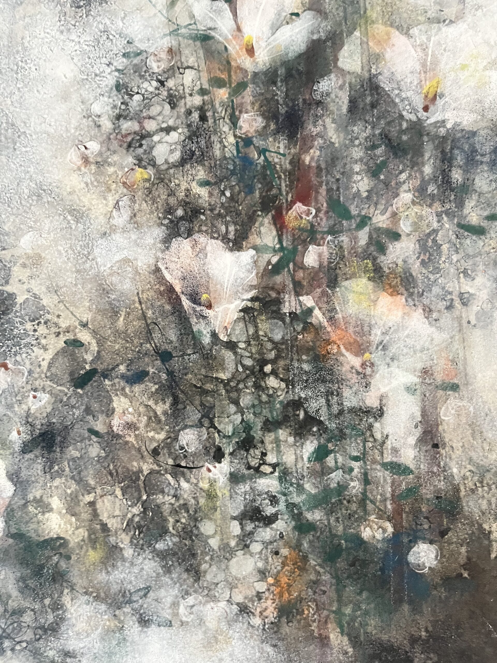 Dans cette oeuvre, l’artiste reprend le motif floral, récurrent dans son travail. Ici, de délicates fleurs blanches, en boutons ou déjà écloses. L’artiste parvient à donner une impression de profondeur saisissante en atténuant le dessin des pétales, très distinctes au premier plan, puis davantage fondues dans des masses abstraites d’un blanc neige.