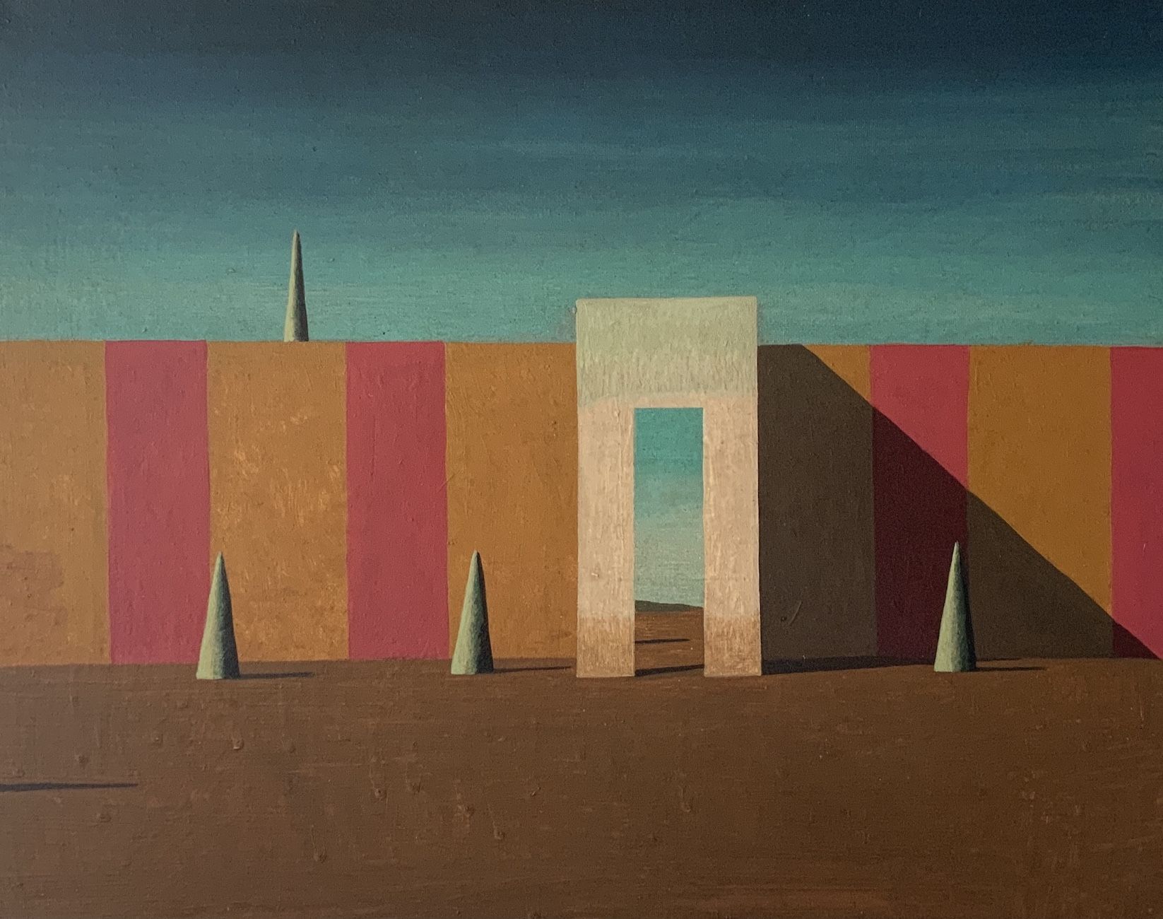 Dans ses peintures, l’artiste établit un dialogue entre l’architecture et le paysage, dans une figuration soumise à la géométrie et une atmosphère toujours énigmatique. La conception de ces espaces et la simplification des formes (poussée jusqu’aux limites de l’abstraction) traduisent une conception théâtrale de l’architecture.
