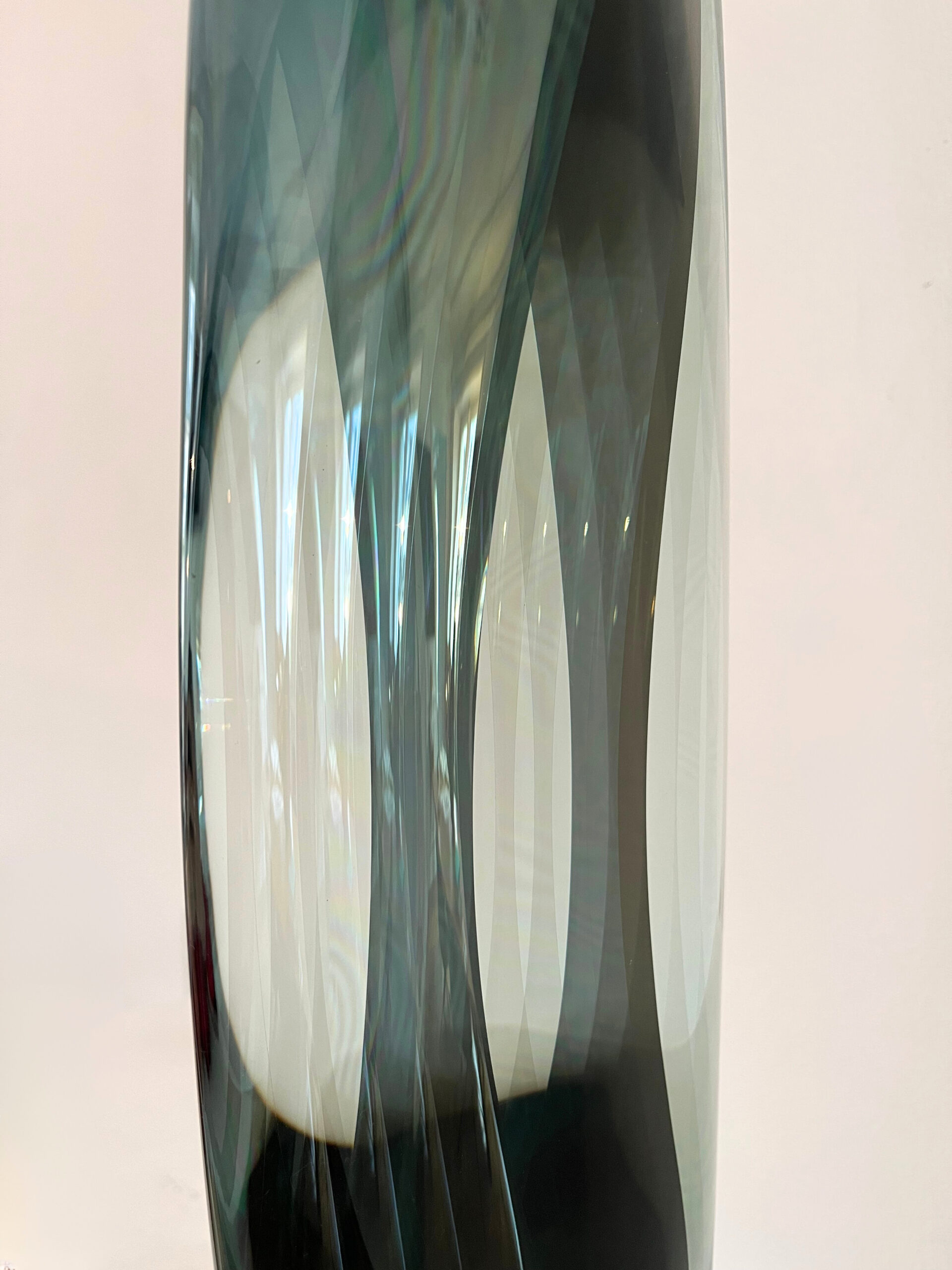 Les sculptures en verre de l’artiste japonais surprennent l’observateur grâce à leur aspect changeant et à leur présence élégante et poétique. Nuances de vert très intenses ou très claires, volumes réels ou illusoires, espaces intérieurs que l’on tente de décrypter, distorsions imprévisibles reflétées sur la surface, sens de mouvement crée par l’alternance de concavités et convexités… Le verre, avec sa capacité à réfracter la lumière, est le protagoniste absolu de ces œuvres, mis en valeur par le travail habile et expérimenté de l’artiste. Les formes organiques des sculptures rappellent les éléments de la nature : les ondulations provoquées par le vent sur l’eau ou sur l’herbe, les vagues de la mer, la rondeur des pierres.