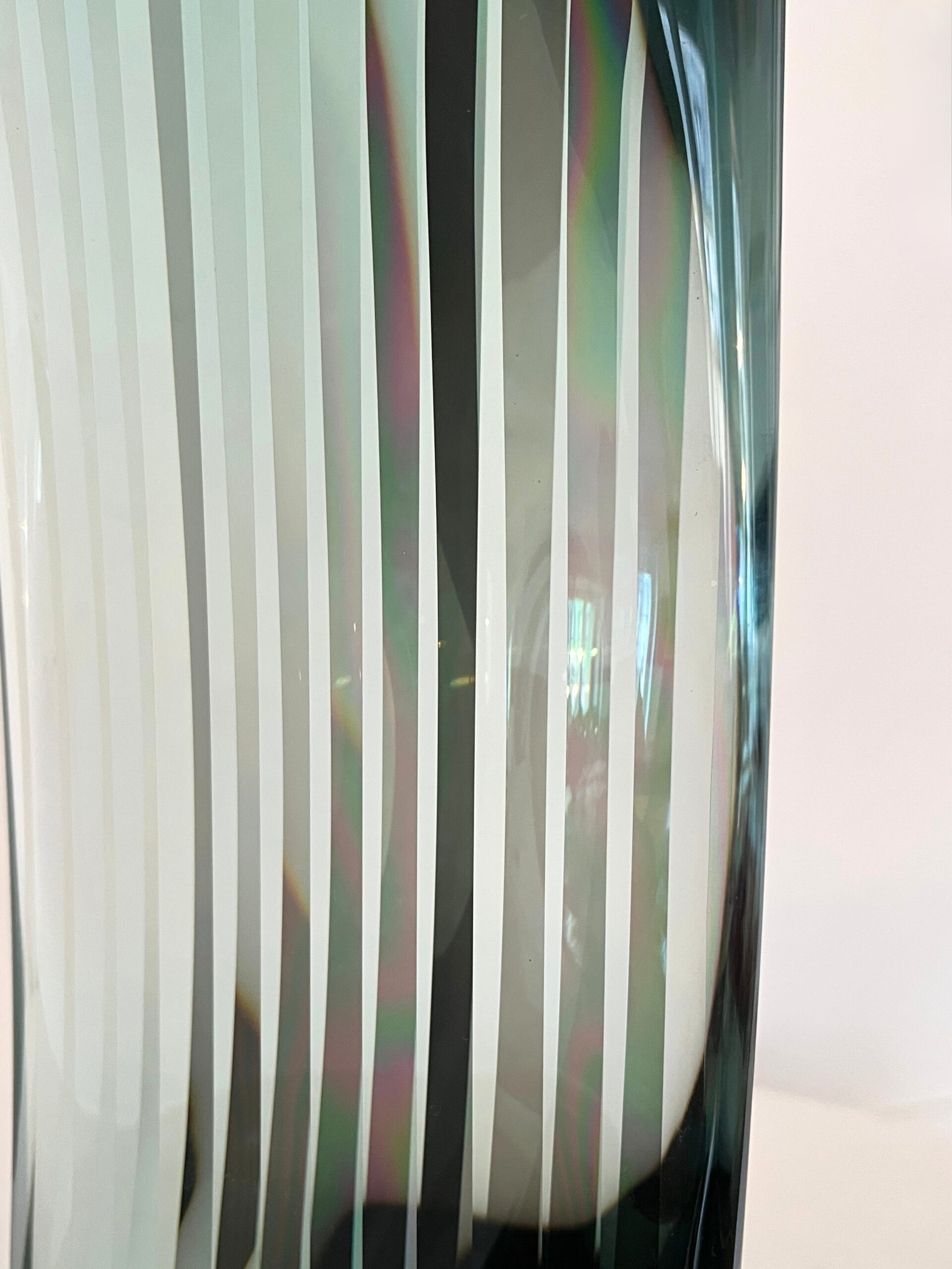Dans la série « Move », initiée dans les années 2000, l’artiste présente des sculptures verticales, qui se dressent dans l’espace avec une présence à la fois puissante et délicate. Pour cette série, Toshio Iezumi travaille particulièrement sur les ondulations, alternant les formes convexes et concaves qui confèrent aux sculptures un effet de mouvement. L’artiste se sert aussi d’un miroir semi-transparent, inséré à l’intérieur de la pièce, pour accentuer encore davantage les jeux de réflexion et de transmission de la lumière.