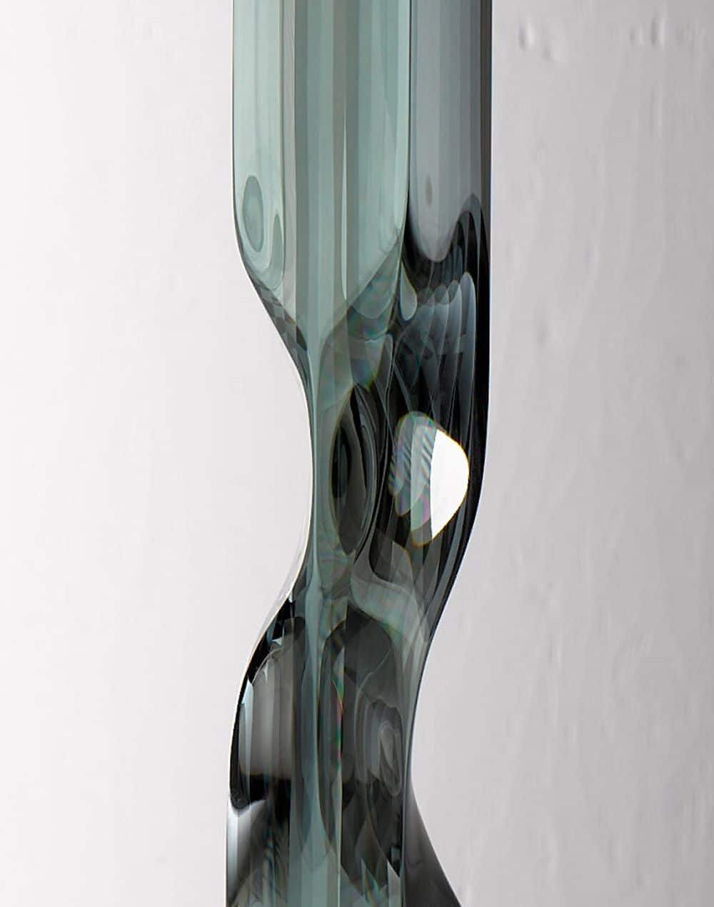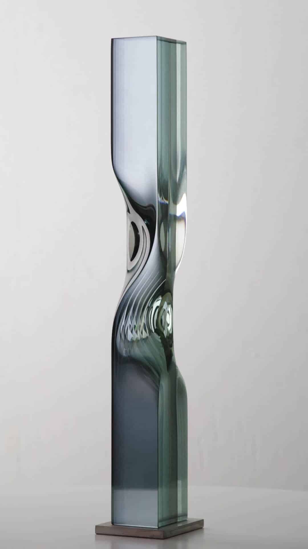 Les sculptures en verre de l’artiste japonais surprennent l’observateur grâce à leur aspect changeant et à leur présence élégante et poétique. Nuances de vert très intenses ou très claires, volumes réels ou illusoires, espaces intérieurs que l’on tente de décrypter, distorsions imprévisibles reflétées sur la surface, sens de mouvement crée par l’alternance de concavités et convexités… Le verre, avec sa capacité à réfracter la lumière, est le protagoniste absolu de ces œuvres, mis en valeur par le travail habile et expérimenté de l’artiste. Les formes organiques des sculptures rappellent les éléments de la nature : les ondulations provoquées par le vent sur l’eau ou sur l’herbe, les vagues de la mer, la rondeur des pierres.