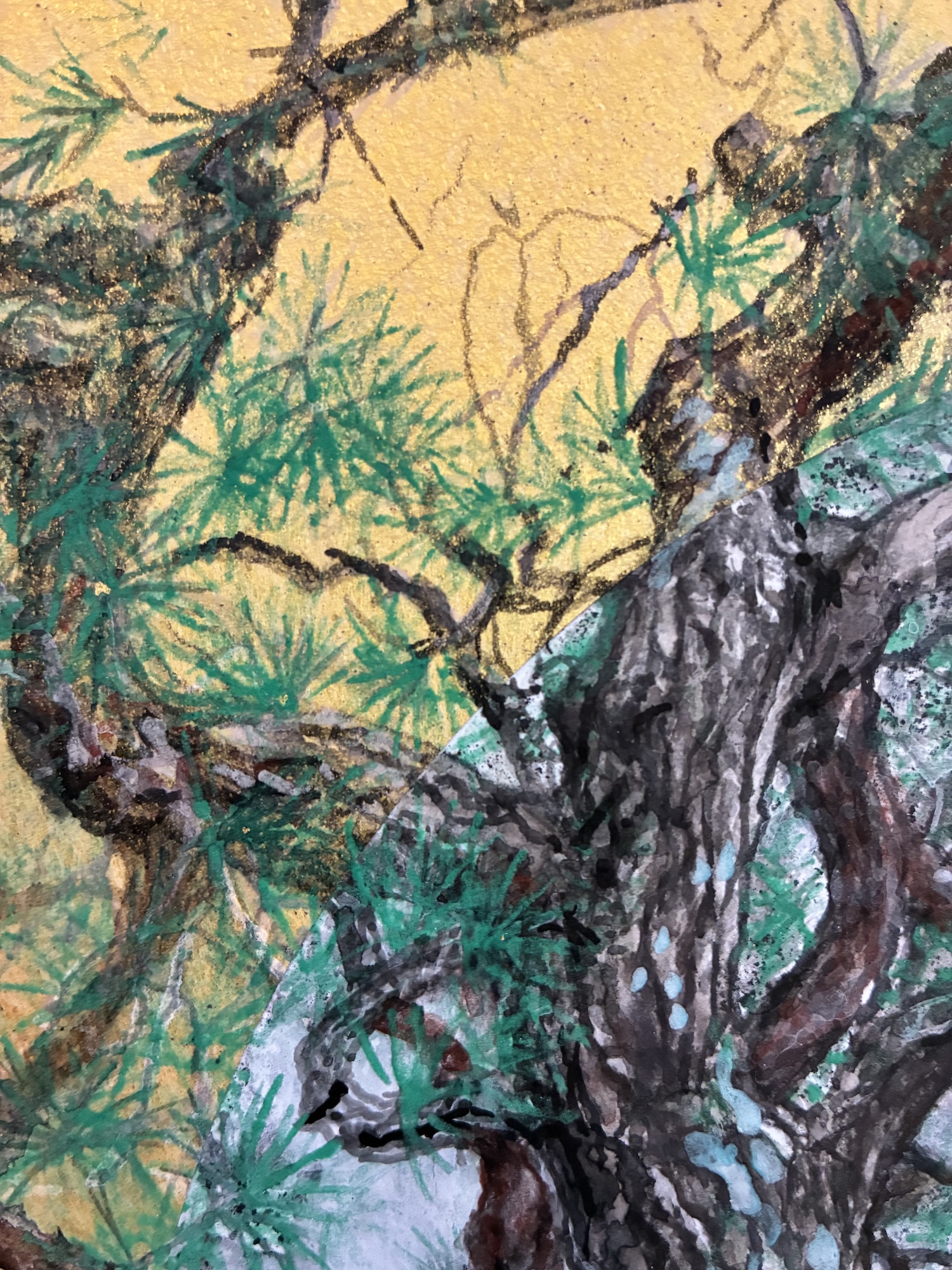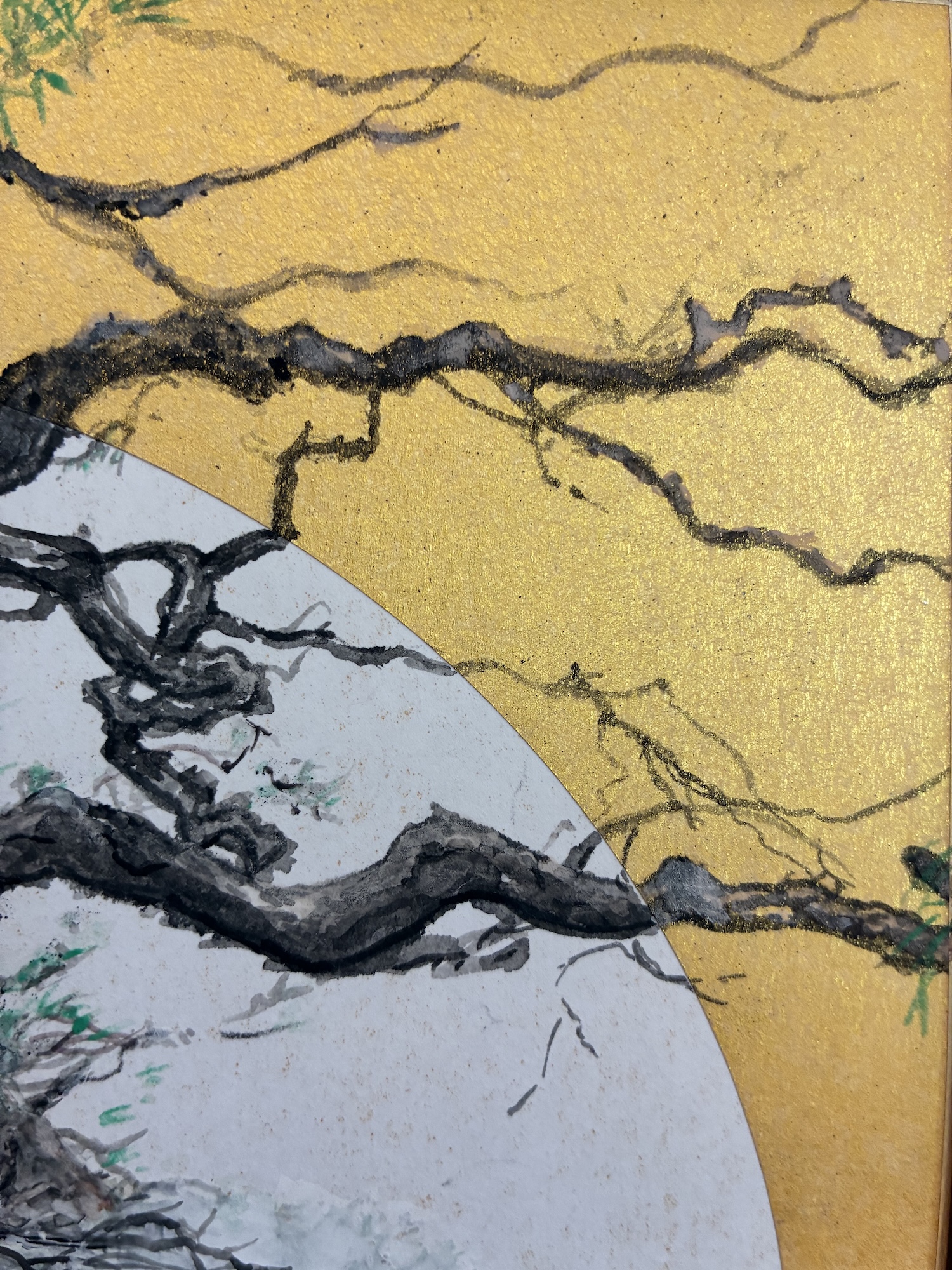 | Description | Pigments japonais, encre de Chine et feuilles d’or sur carton japonais |