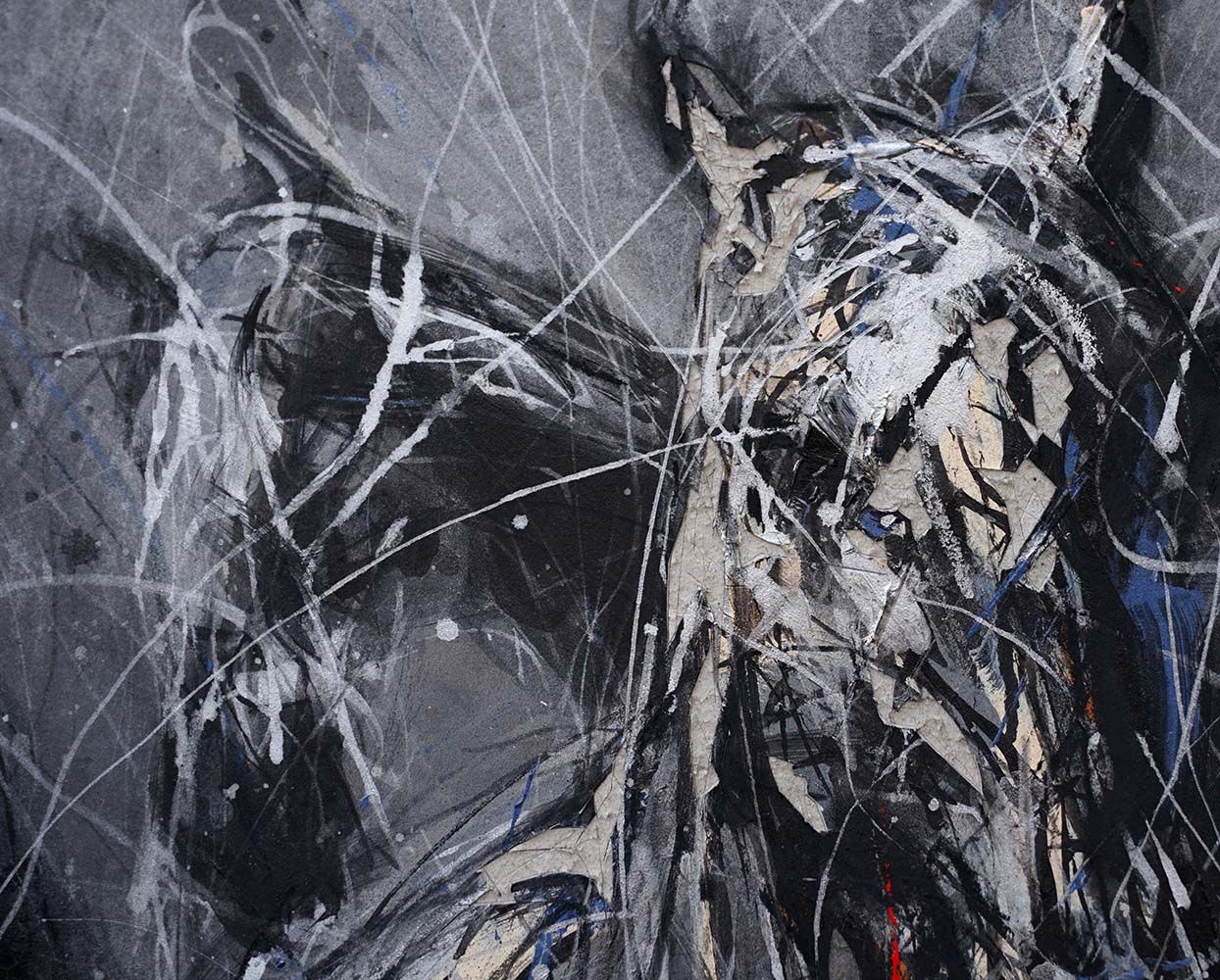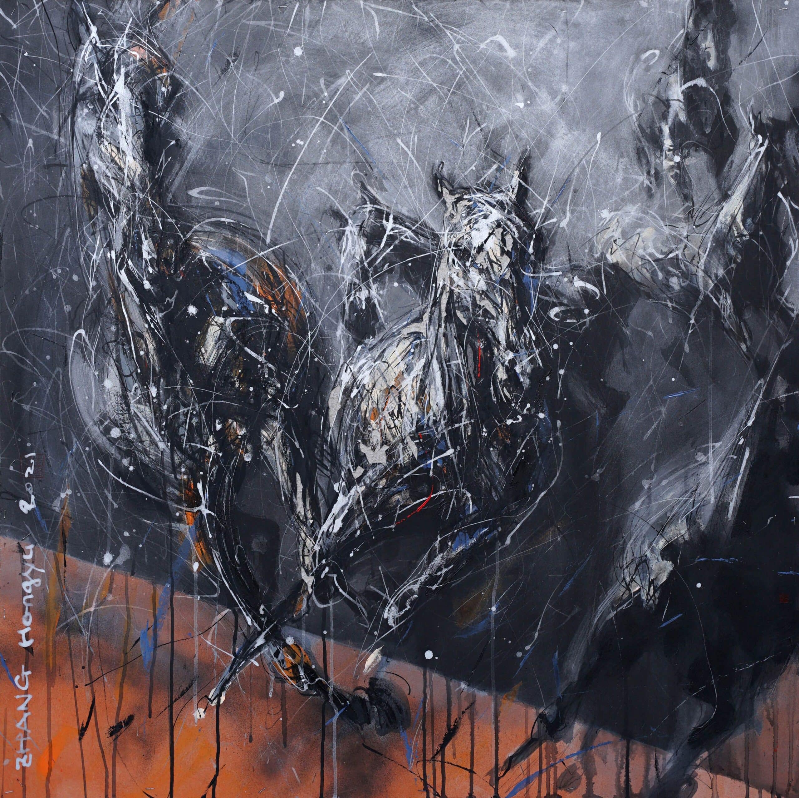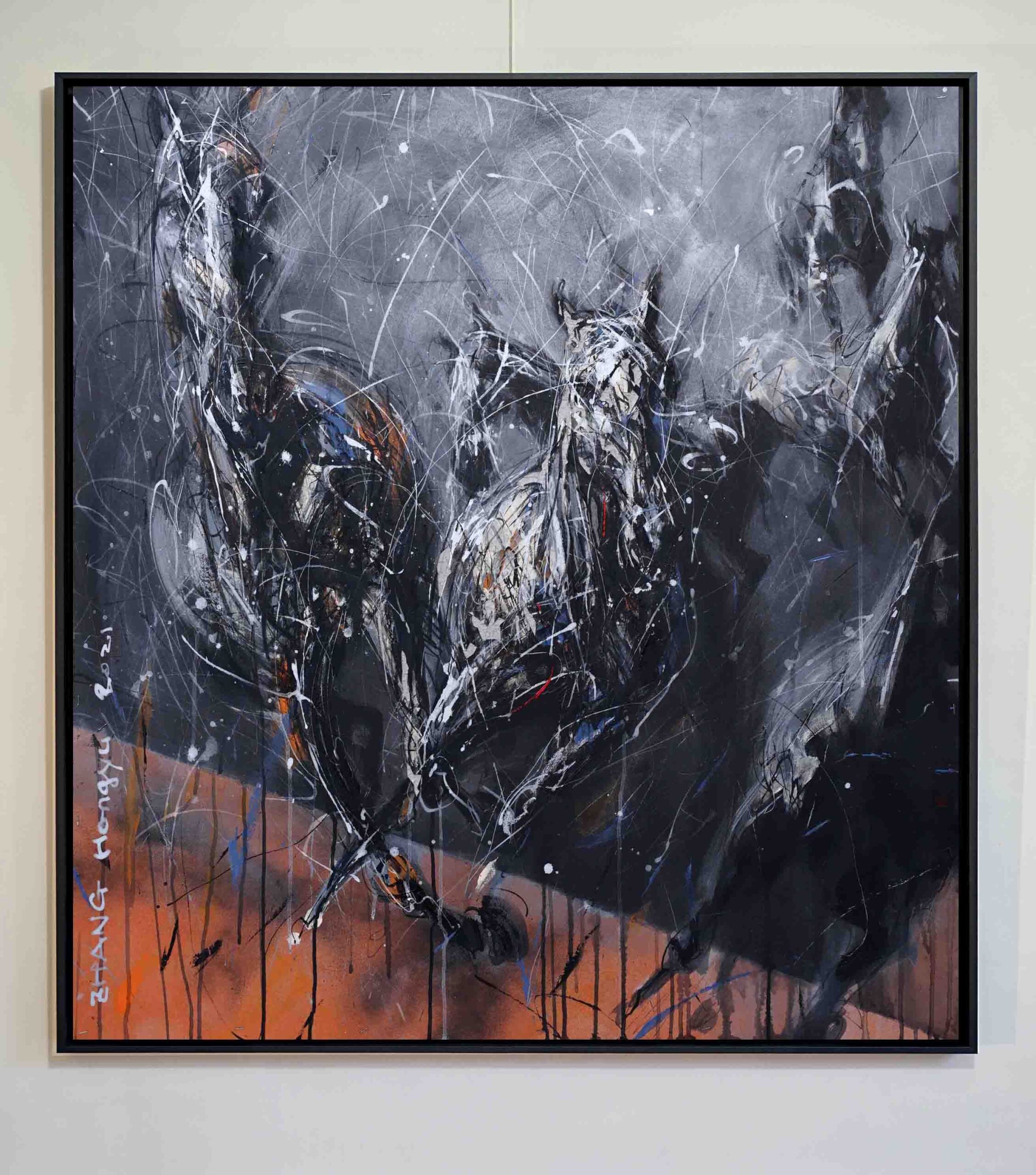 Avec une grande économie de couleurs (du noir, du rouge et du bleu, plus ou moins dilués pour obtenir différentes tonalités) et avec une impressionnante virtuosité technique Hongyu Zhang parvient à saisir la beauté fugace de cette apparition. Grâce à la gravure, il esquisse la silhouette de l’animal, en creusant la surface de son support (un panneau en carton). Le trait – un héritage de sa formation à la calligraphie traditionnelle chinoise – est l’élément fondamental de son art : il lui sert ici à donner à la fois de l’énergie et de l’élégance à ses chevaux au galop. L’artiste applique ensuite ses couleurs à l’aide de différentes techniques : l’encre, la peinture acrylique et le pastel. Le blanc éclatant souligne les lignes et certains volumes. Ces touches nerveuses contrastent avec les coulures oranges et noires, accentuant la dimension dramatique de cette œuvre d’art contemporain. L’artiste utilise notamment une encre argentée, dont les reflets sont brillants.