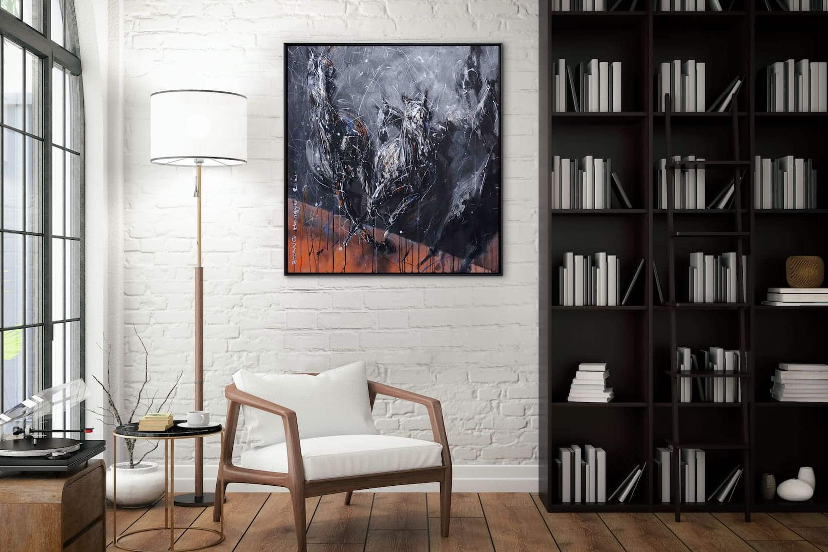 | Encadrement | Cette peinture est vendue encadrée (caisse américaine). Dimensions de l'oeuvre encadrée : 105 x 105 cm |