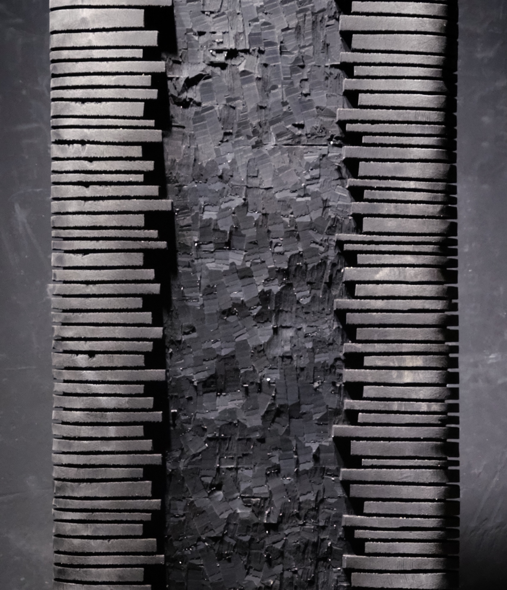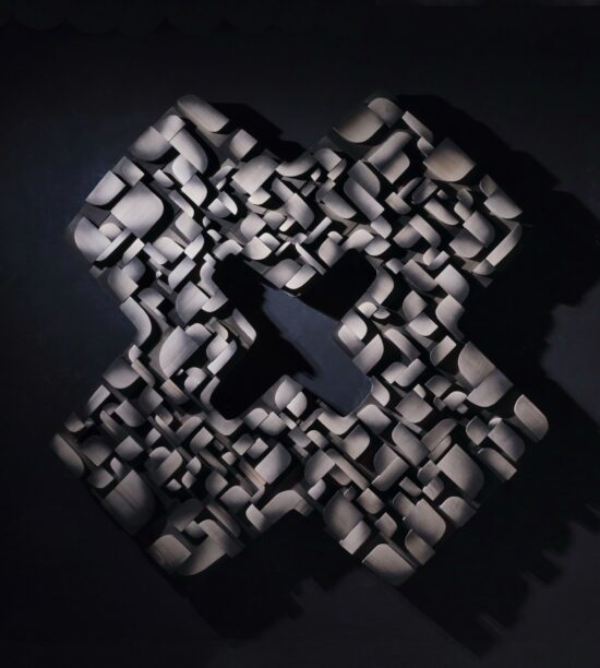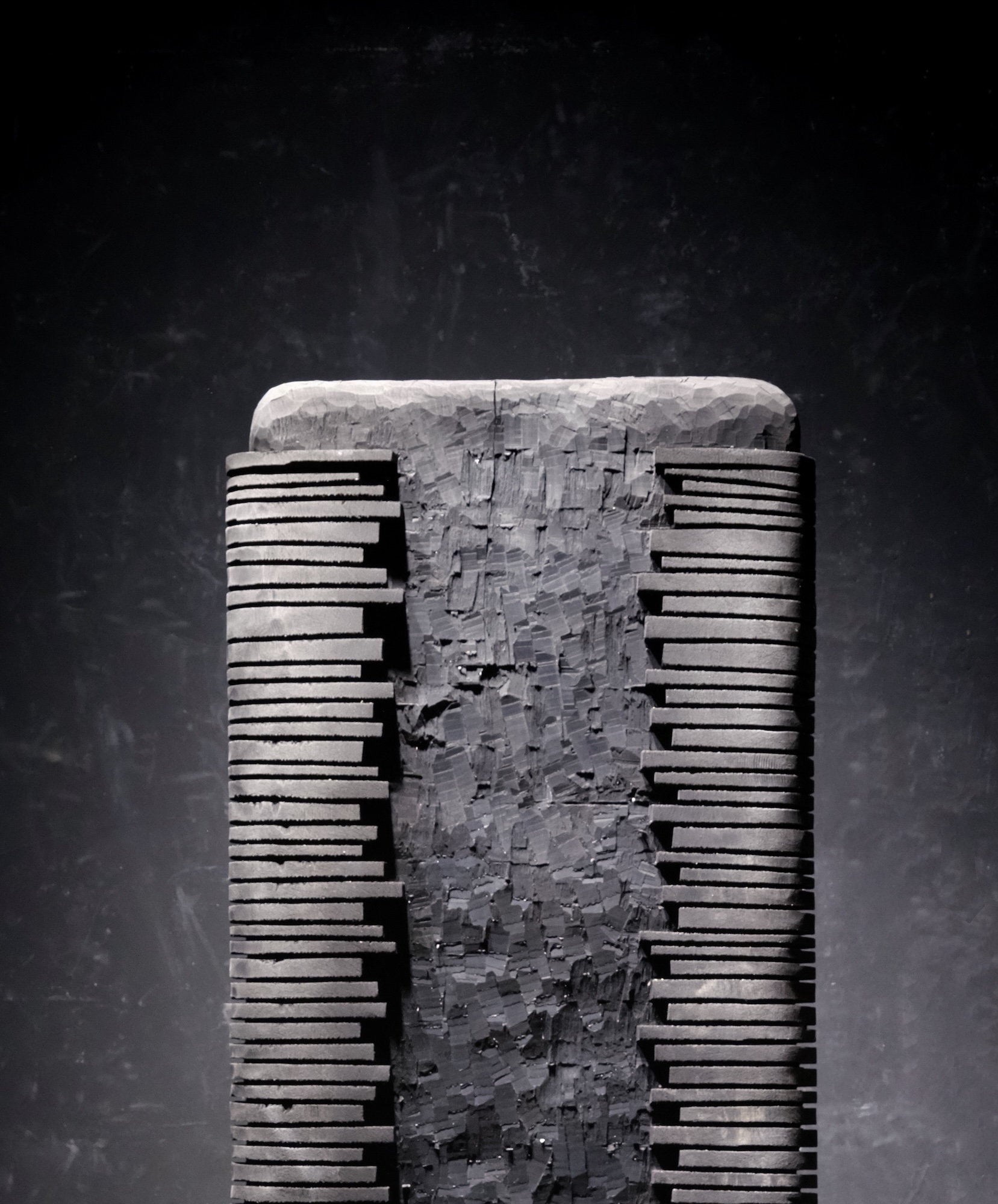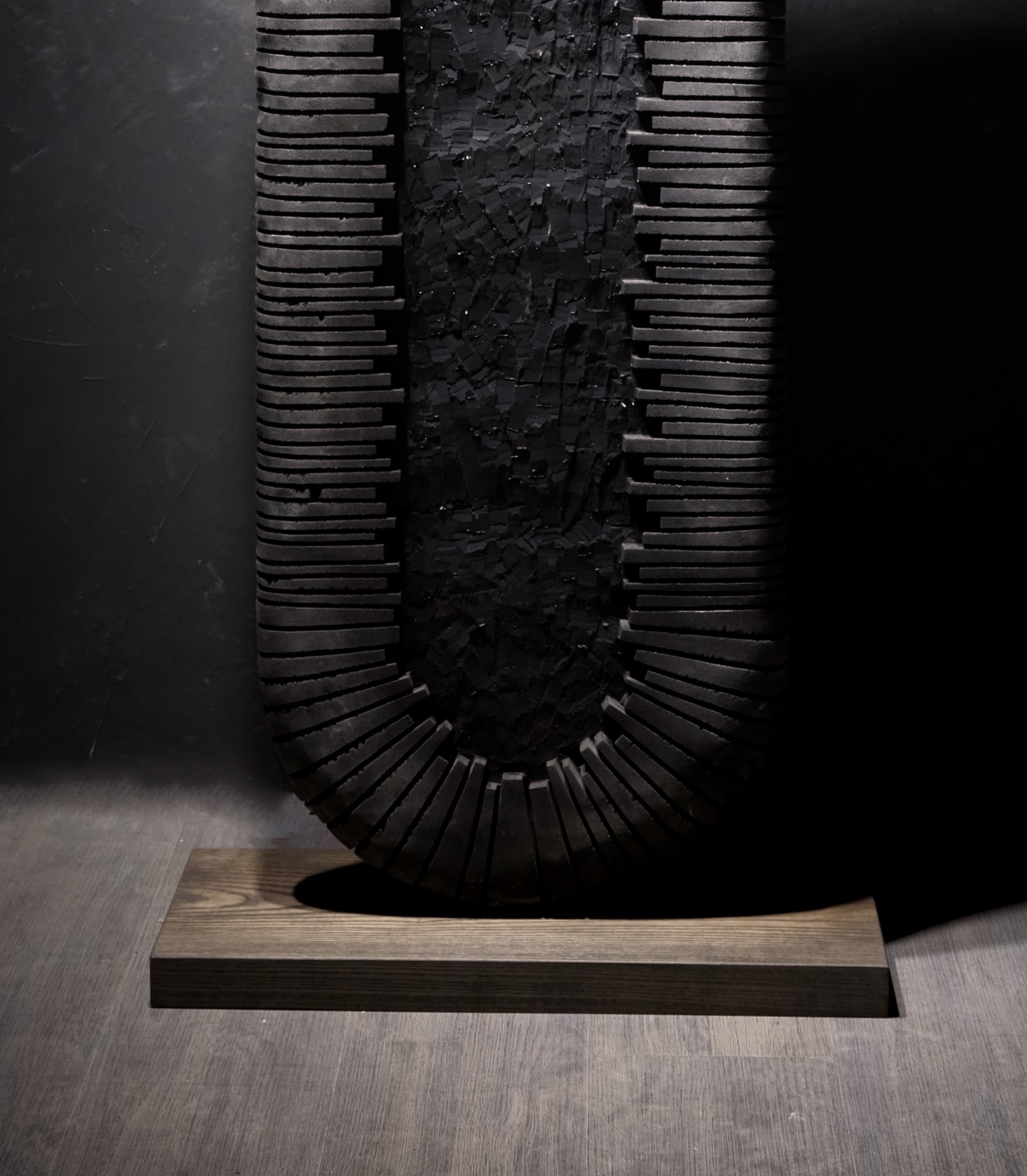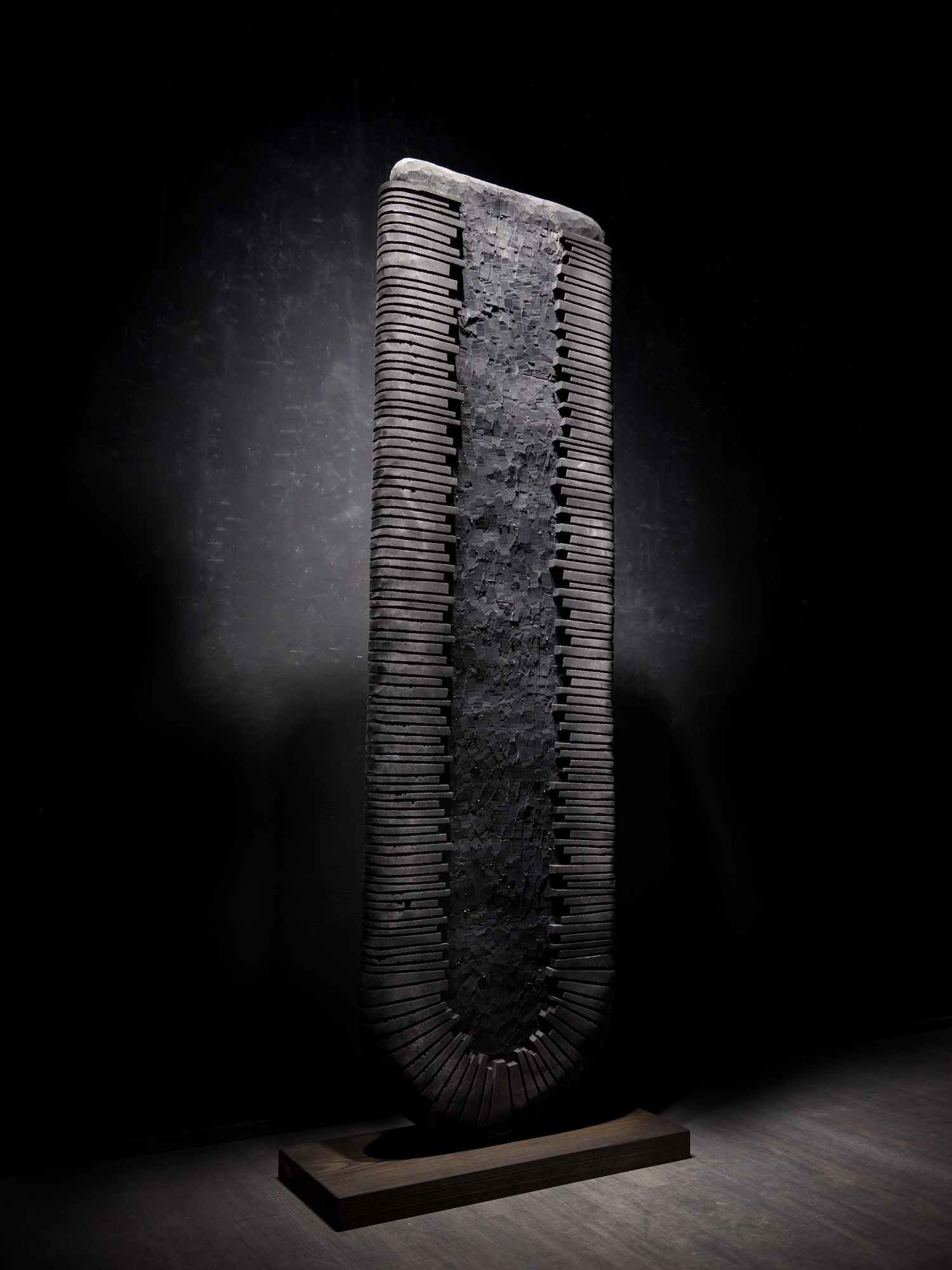 Une fois dans la tranquillité de son atelier, Thierry Martenon sculpte ses pièces à l’aide des outils traditionnels des métiers du bois, mettant à profit l’expertise acquise grâce à son expérience en ébénisterie. Pour la finition, il explore des techniques variées et singulières telles que le brossage, le brûlage, le sablage, la gravure, ainsi que l’application de patines à l’encre de Chine et de laques. L’objectif de ce travail est de créer des œuvres très texturées et capables de capturer la lumière, car, selon l’artiste : « C’est elle qui anime la pièce de bois, c’est elle qui la fait vibrer. » Un superbe jeu d’ombre et de lumière sublime le bois, lui insufflant une impression de mouvement.