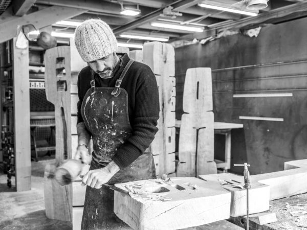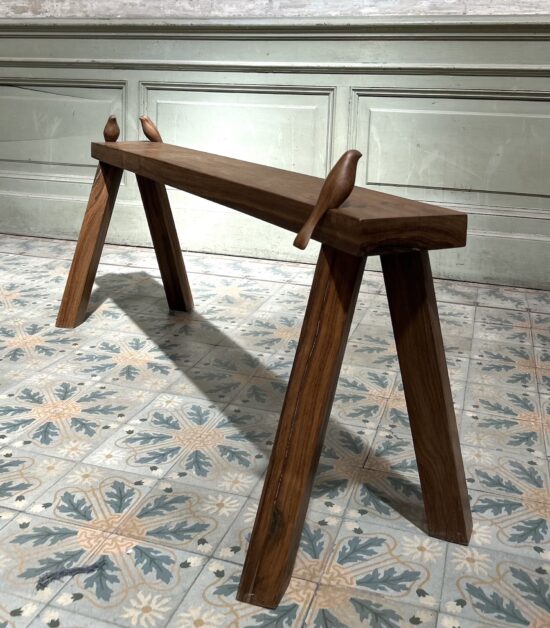 Thierry Martenon vit et travaille dans son village natal, situé dans le massif de la Chartreuse, en Savoie. La montagne et la forêt font partie de son quotidien et lui fournissent une source constante d’inspiration. Les formes et textures qu’il observe dans la nature, qu’il s’agisse de rochers, d’écorces ou de champignons, nourrissent ses créations. Son processus créatif commence par le dessin, une étape essentielle qui lui permet de trouver la forme idéale. La sélection du tronc est particulièrement exigeante, reposant sur des critères précis. Le sculpteur travaille exclusivement avec des essences locales telles que le frêne, l’épicéa, le noyer et l’érable.