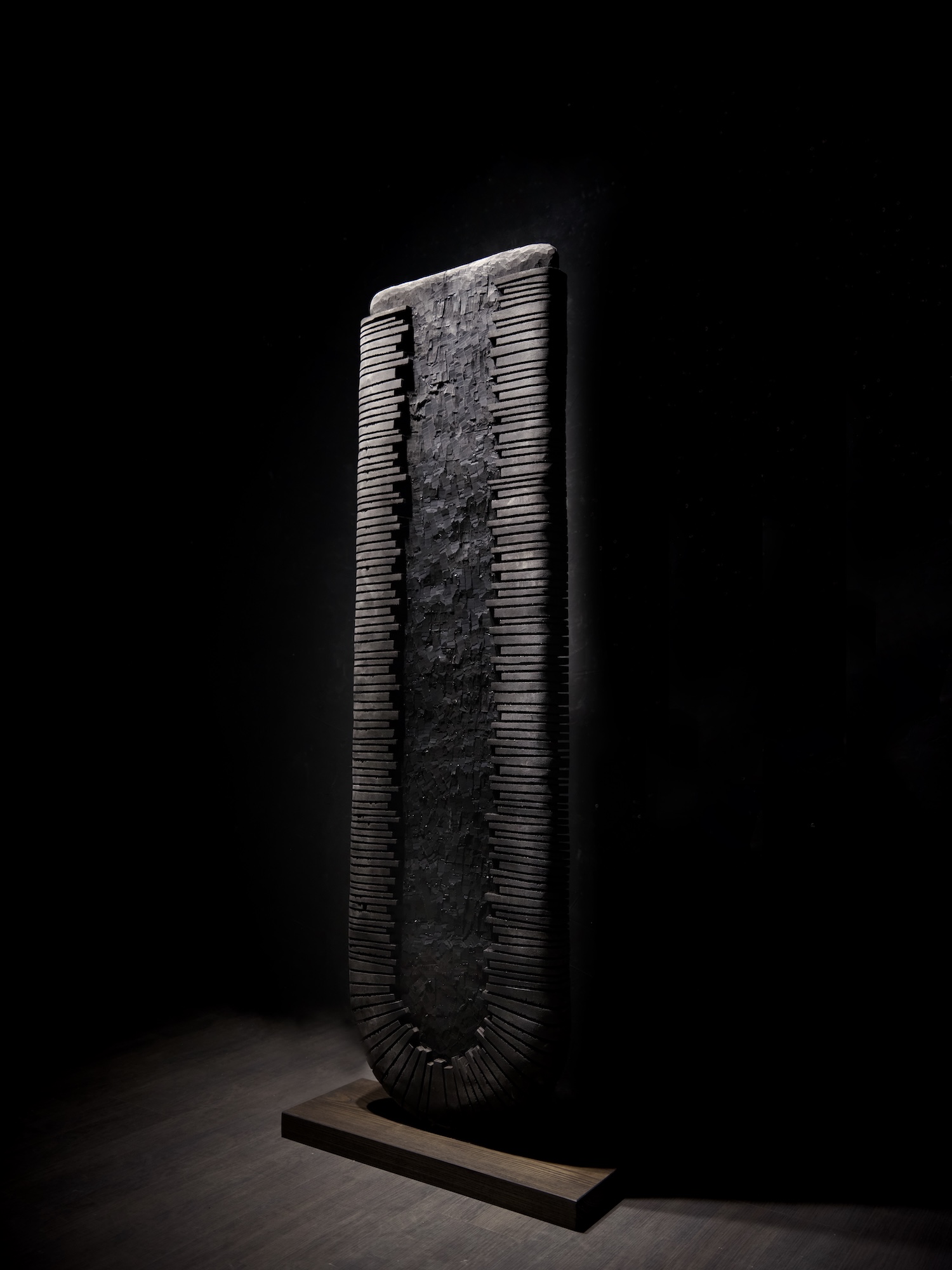 Les dimensions indiquées incluent le socle. Dimensions de la sculpture : 157 H × 44 L × 7 P cm. Dimensions du socle : 4 H × 60 L × 22 P cm.
