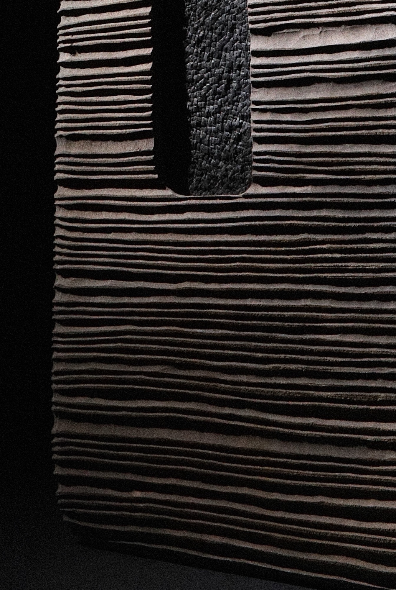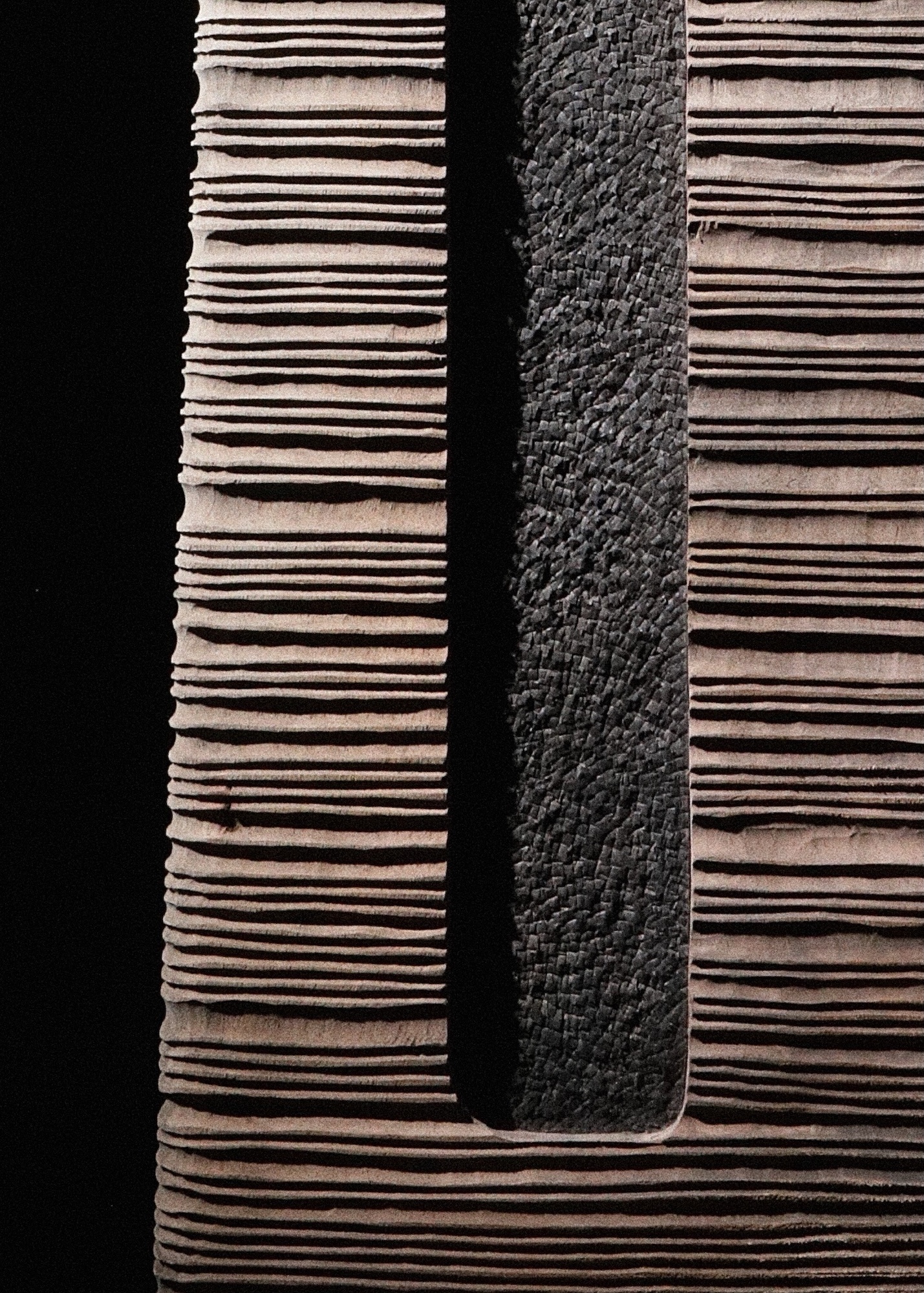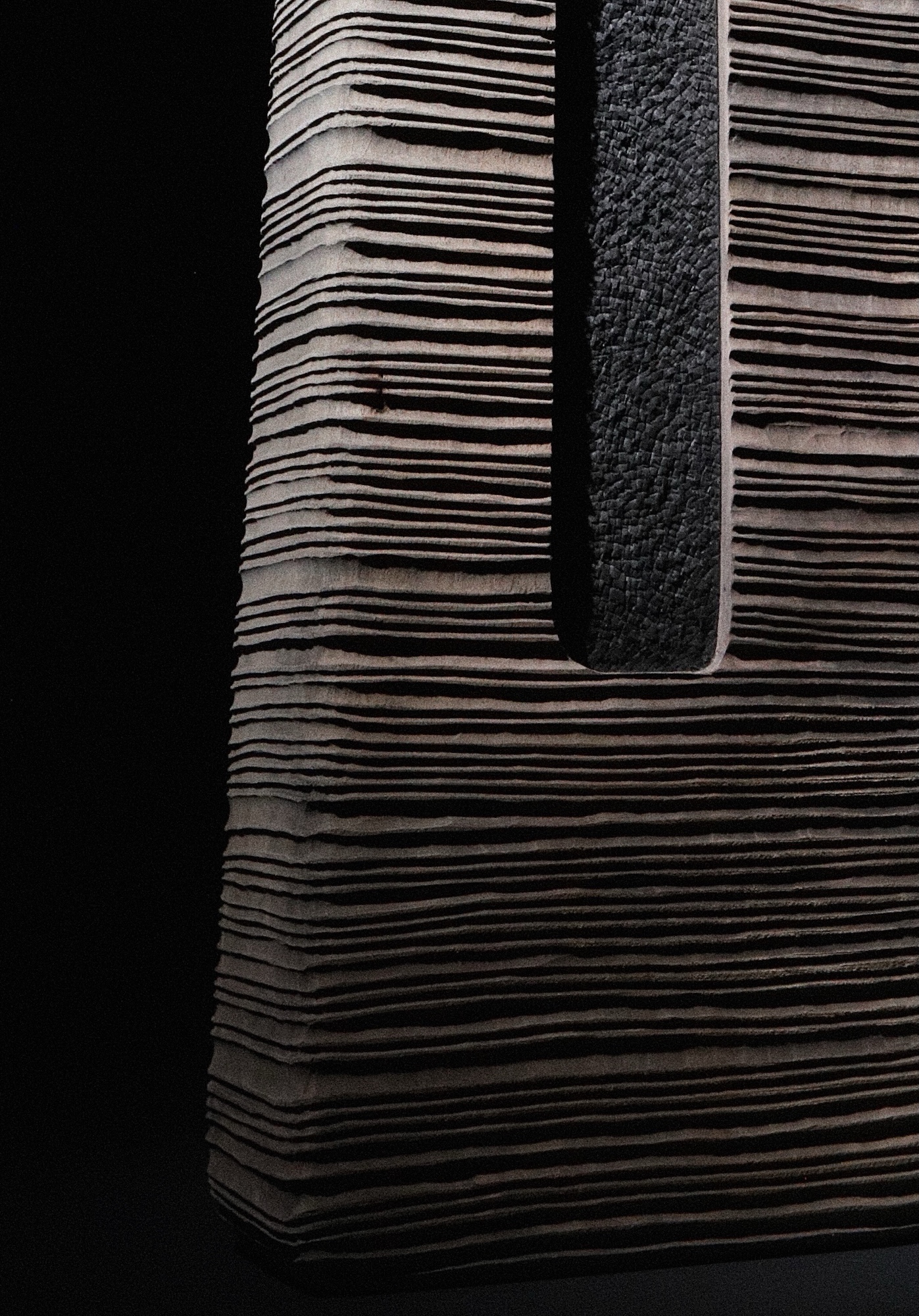 Une fois dans la tranquillité de son atelier, Thierry Martenon sculpte ses pièces à l’aide des outils traditionnels des métiers du bois, mettant à profit l’expertise acquise grâce à son expérience en ébénisterie. Pour la finition, il explore des techniques variées et singulières telles que le brossage, le brûlage, le sablage, la gravure, ainsi que l’application de patines à l’encre de Chine et de laques. L’objectif de ce travail est de créer des œuvres très texturées et capables de capturer la lumière, car, selon l’artiste : « C’est elle qui anime la pièce de bois, c’est elle qui la fait vibrer. » Un superbe jeu d’ombre et de lumière sublime le bois, lui insufflant une impression de mouvement.