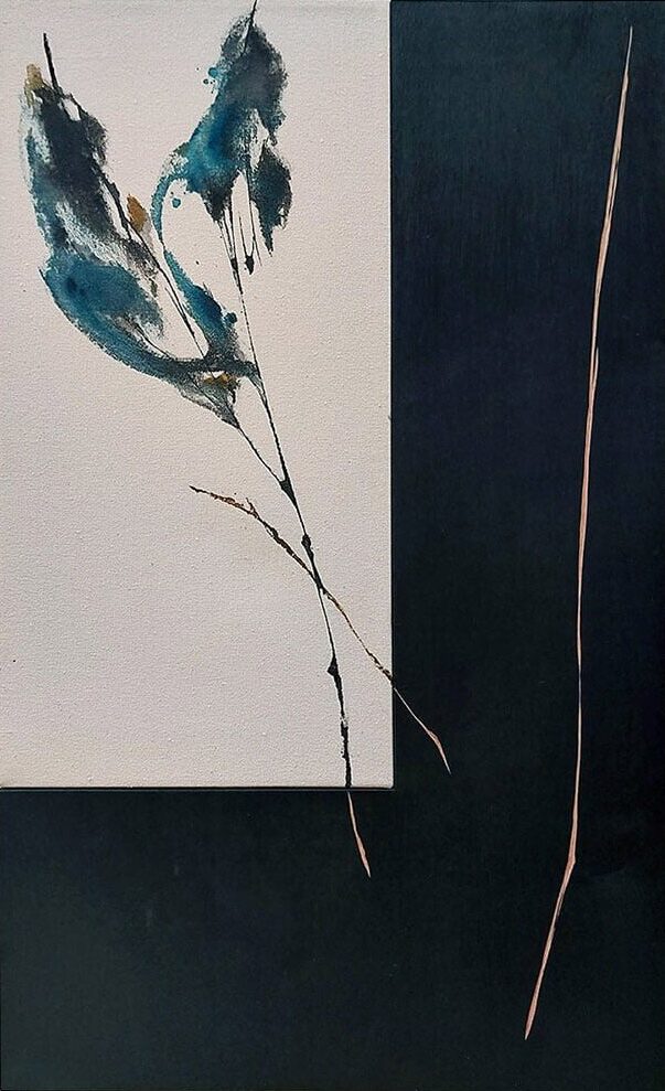 Des formes et des motifs abstraits complètent les peintures, évoquant des éléments naturels tels que des feuilles, des ailes d’oiseaux ou encore des bourgeons. Toutefois, les œuvres de Maho Maeda ne sont pas des représentations ou des imitations de la nature, mais plutôt des interprétations personnelles des sons de la nature matérialisés dans une forme visuelle et un support concret.