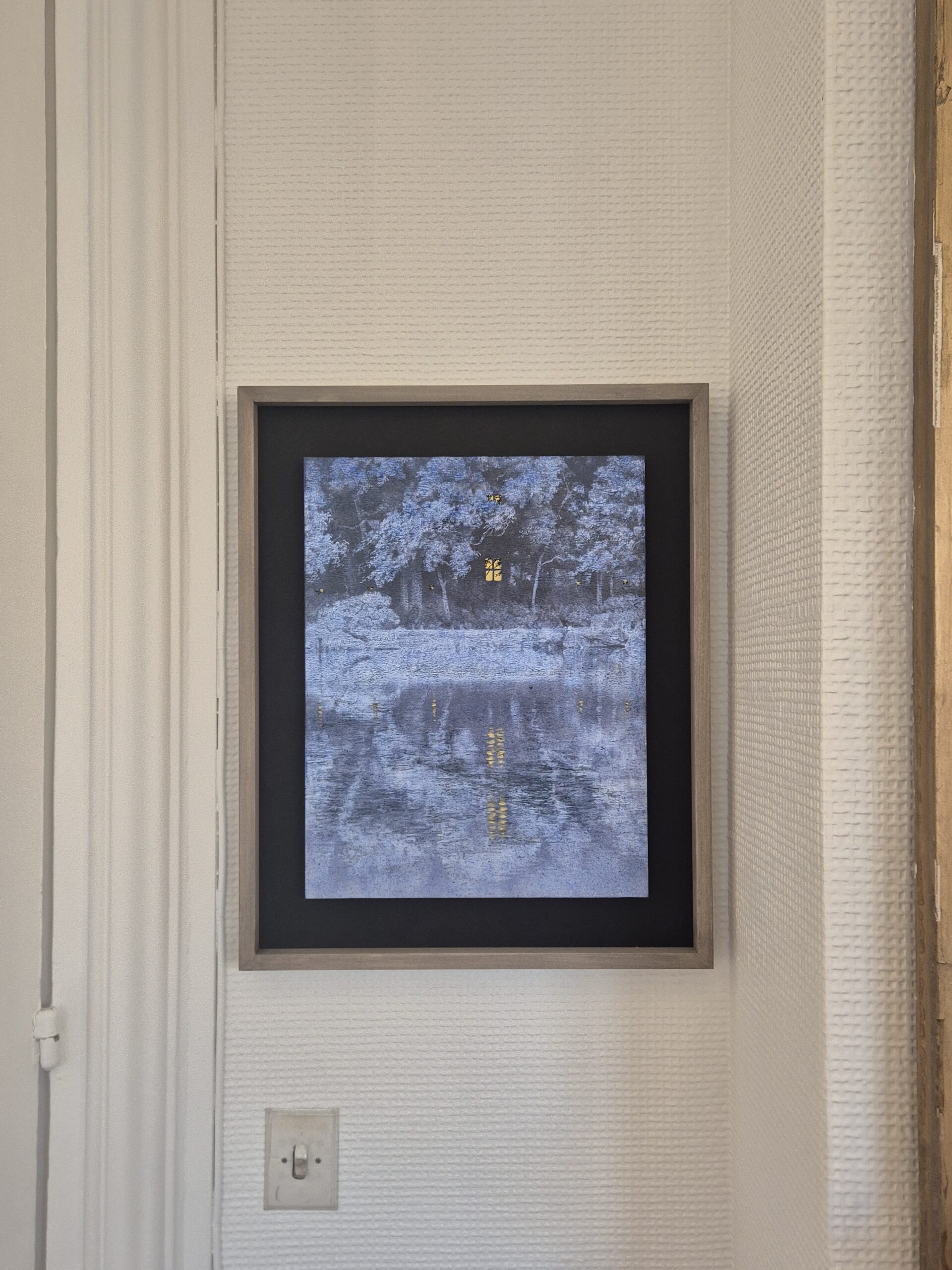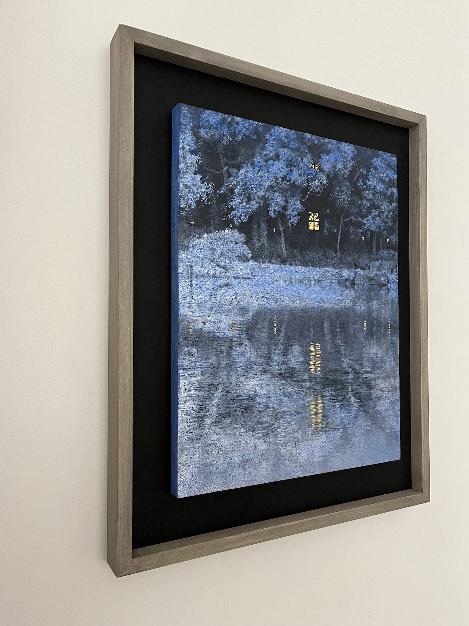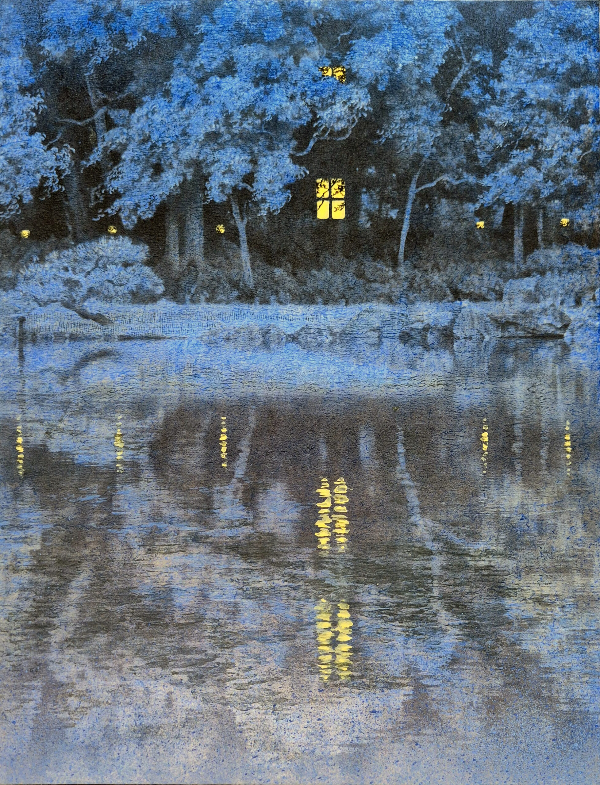 Cette œuvre plonge le spectateur dans un paysage nocturne et éthéré, dominé par une palette de tons bleus et argentés qui évoquent un moment tardif et serein. La composition se divise entre le feuillage dense de la forêt dans la partie supérieure et l’étendue d’eau dans la partie inférieure. L’attention est immédiatement attirée par la lueur chaude d’une fenêtre solitaire, une petite grille de lumière dorée au milieu des silhouettes sombres des arbres. Le traitement de l’eau est particulièrement remarquable : sa surface texturée reflète les environs de manière abstraite, capturant le mystère et le mouvement subtil de la nuit.
