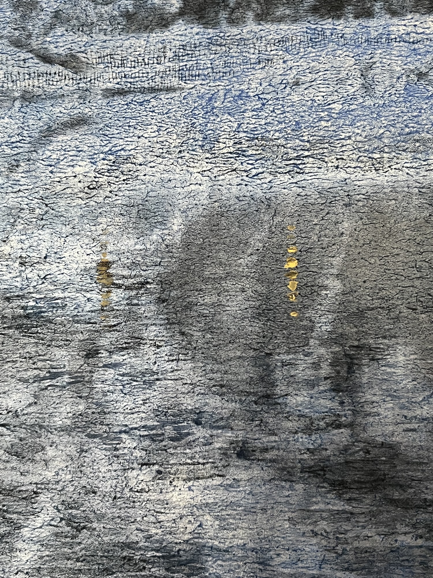 | Description | Pigments, encre Sumi et feuille d’argent sur papier japonais marouflé sur panneau de bois |
