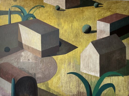 Dans ses peintures, l’artiste établit un dialogue entre l’architecture et le paysage, dans une figuration soumise à la géométrie et une atmosphère toujours énigmatique. La conception de ces espaces et la simplification des formes (poussée jusqu’aux limites de l’abstraction) traduisent une conception théâtrale de l’architecture.