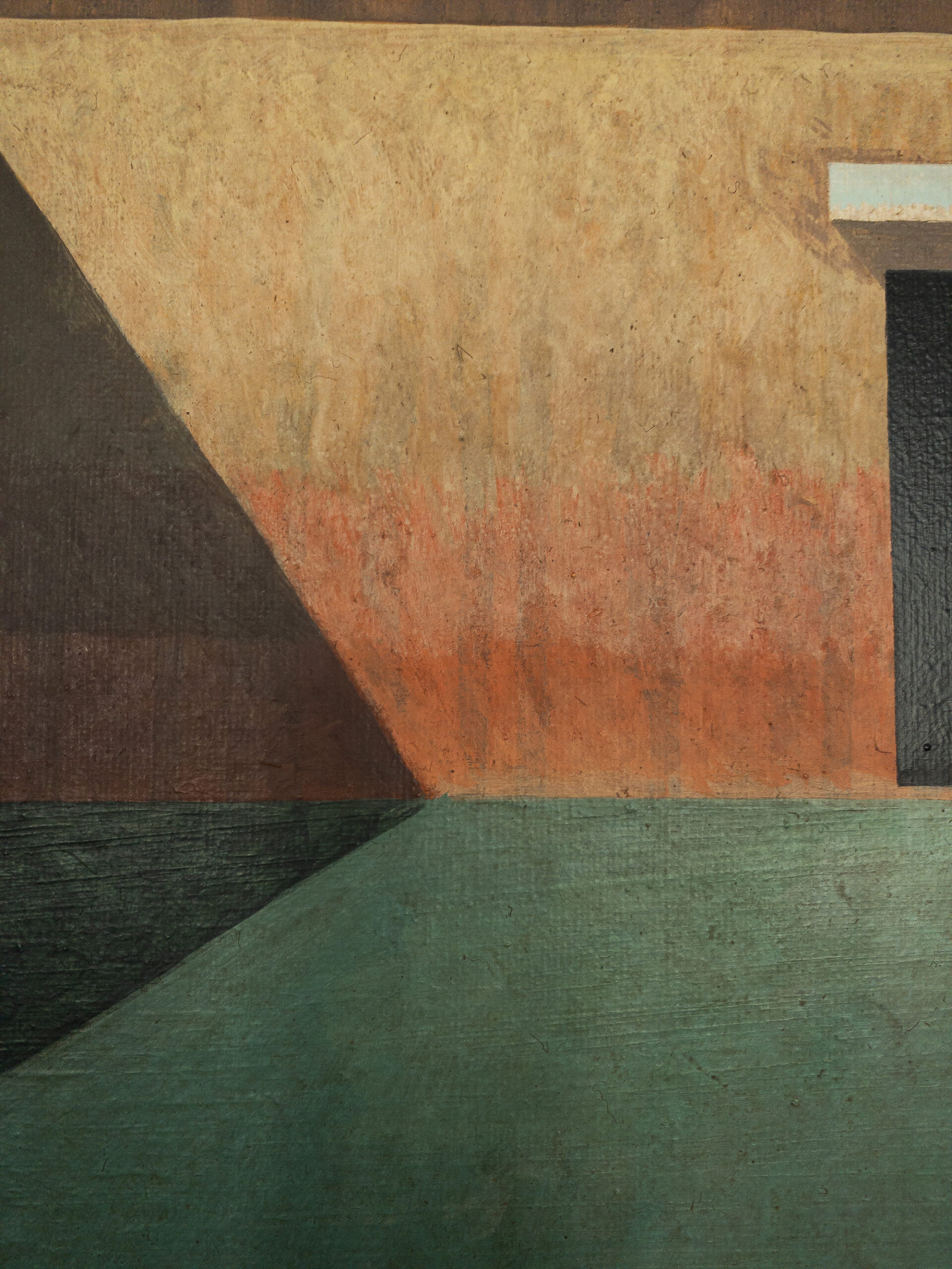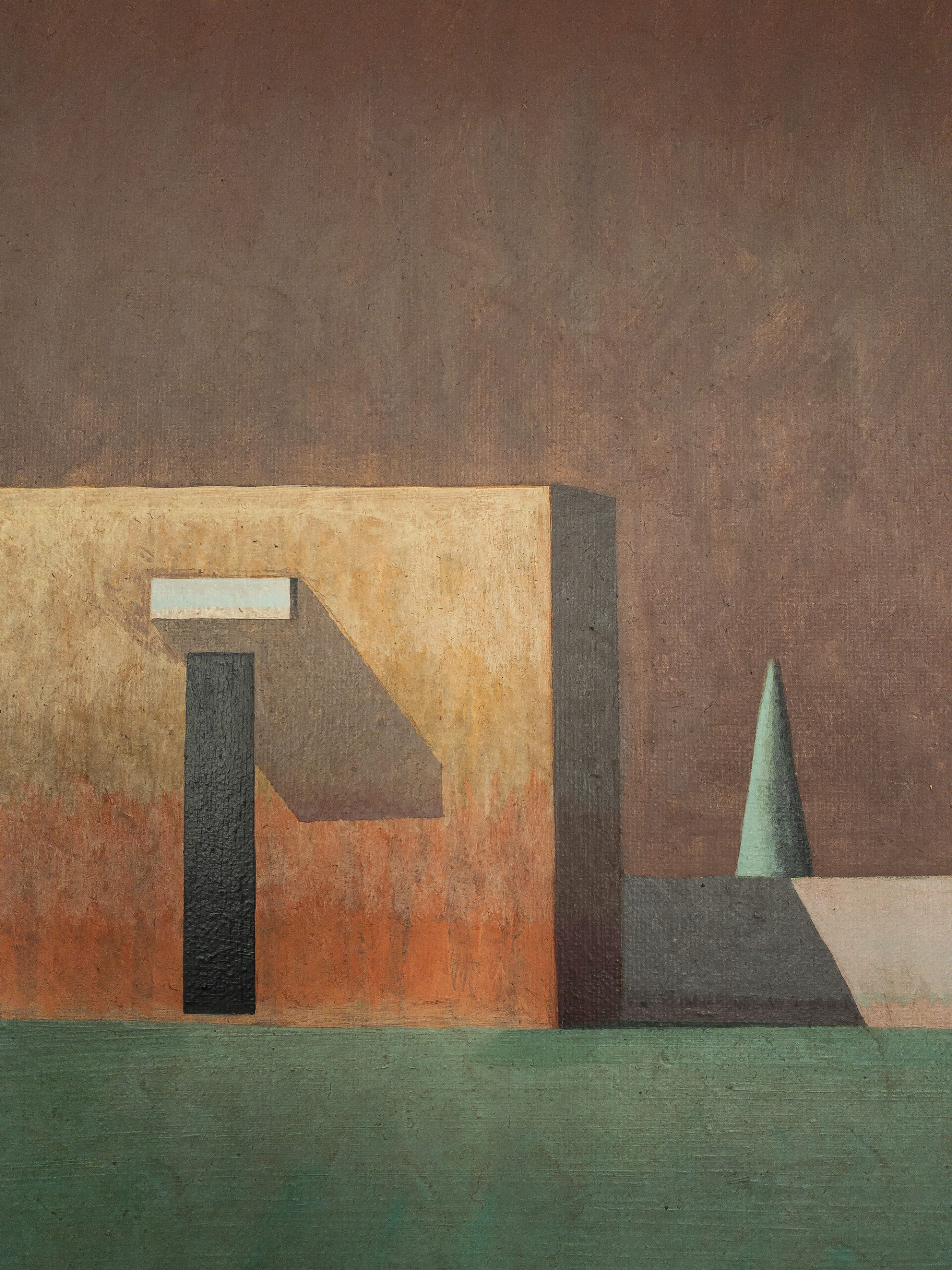 Dans ses peintures, l’artiste établit un dialogue entre l’architecture et le paysage, dans une figuration soumise à la géométrie et une atmosphère toujours énigmatique. La conception de ces espaces et la simplification des formes (poussée jusqu’aux limites de l’abstraction) traduisent une conception théâtrale de l’architecture.