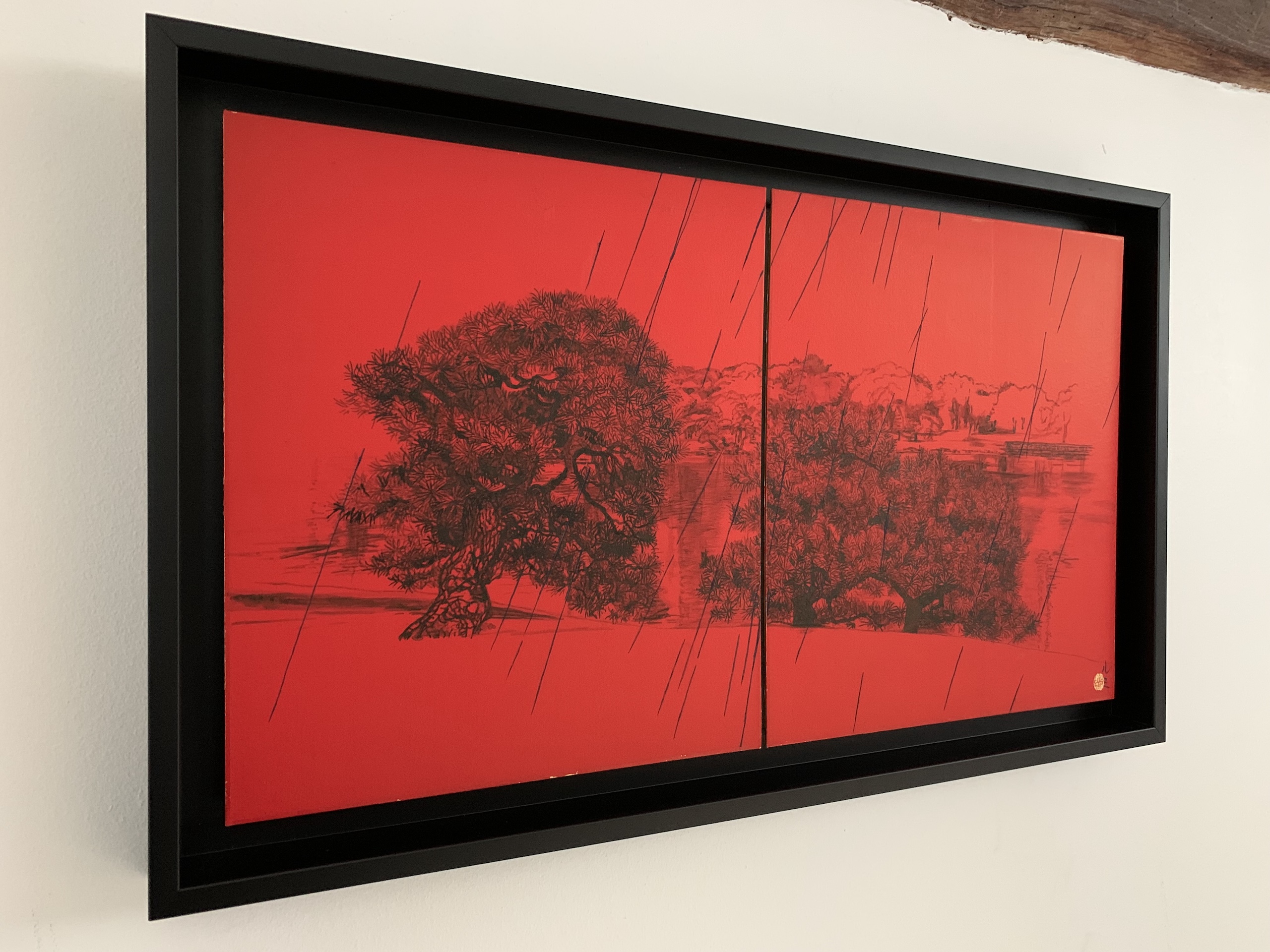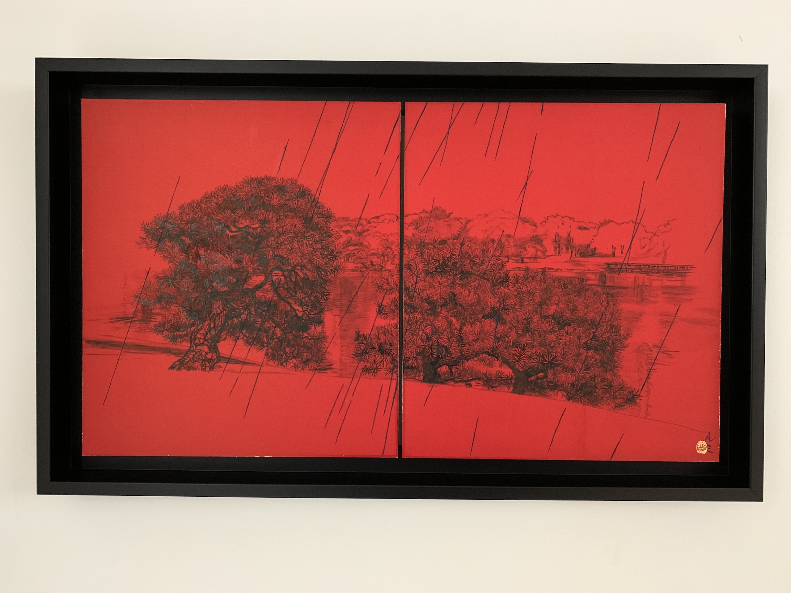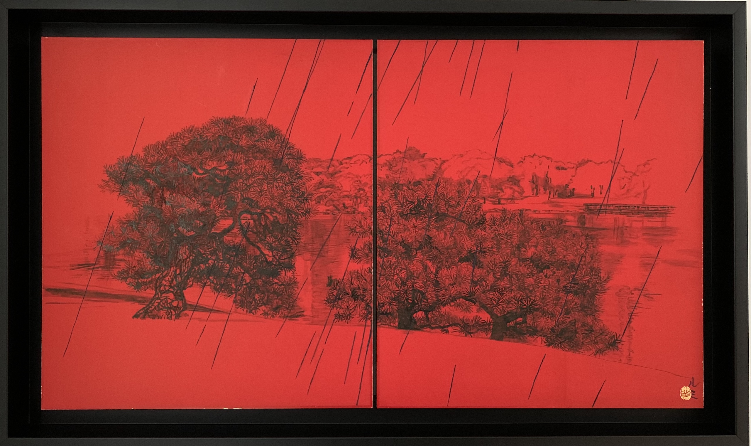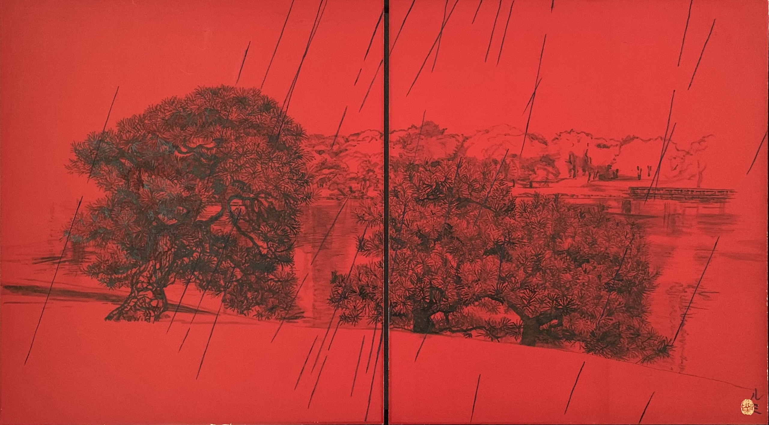 La composition s’articule autour d’un paysage pittoresque, probablement un parc, mettant en scène deux pins majestueux rendus avec un détail sombre et minutieux. On distingue également de l’eau, un feuillage lointain et un petit pont, esquissés subtilement derrière les sujets principaux. L’ensemble de cette vue panoramique contraste vivement avec le fond rouge vibrant et omniprésent. Ce rouge intense crée une atmosphère à la fois dramatique et intemporelle. L’œuvre est divisée en deux, une caractéristique fréquente de la peinture japonaise, bien que le sujet relie harmonieusement les deux panneaux. L’élément déterminant de cette pièce réside dans le thème éponyme : la pluie. De longues lignes diagonales noires traversent toute la composition, représentant une averse dense qui unit le ciel rouge profond au paysage détaillé en dessous. Ce motif de pluie battante introduit une sensation de mélancolie, d’introspection silencieuse et de mouvement.